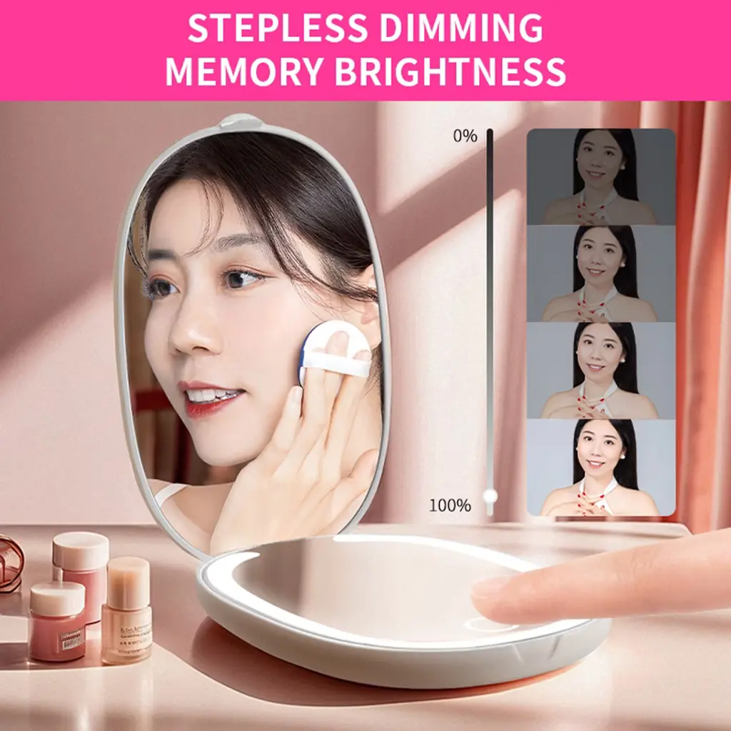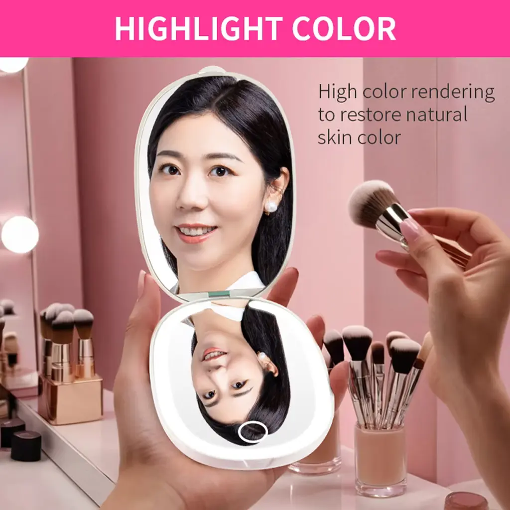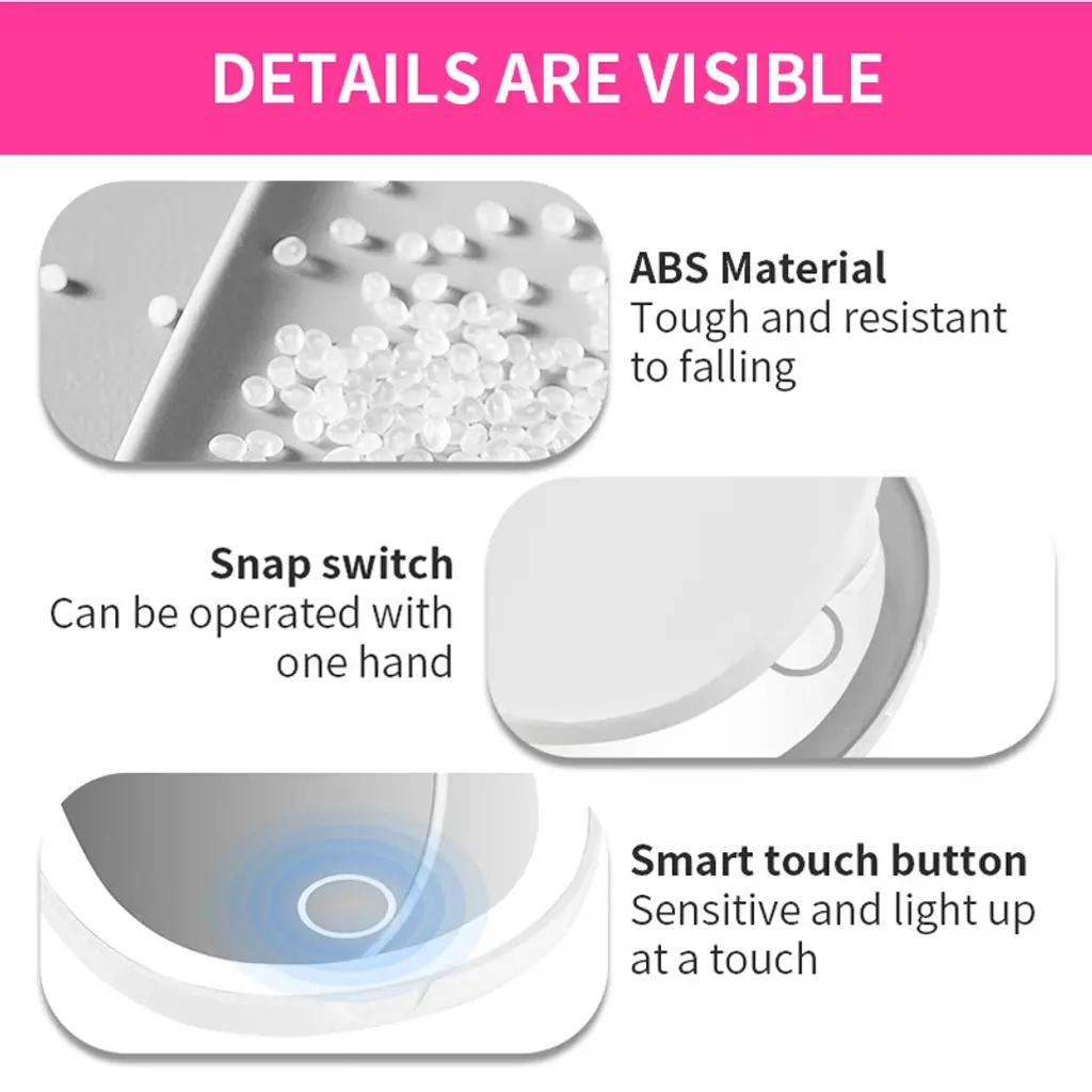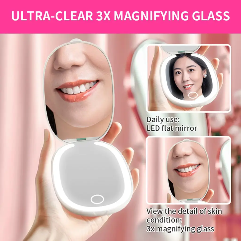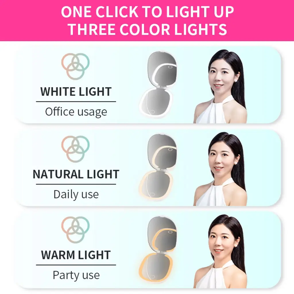 Three LED Light Modes Easily switch between white, warm, and natural lighting for the perfect glow in any setting. Whether at home or on the go, get flawless lighting for makeup, skincare, or touch-ups. Adjustable Brightness Control Stepless dimming allows you to control the brightness to the perfect brightness. Hold down the light touch switch to adjust brightness to your ideal level. From a soft glow to full illumination, this mirror adapts to your needs with ease. Dual Mirrors for Versatile Use Featuring two reflective glass mirrors for crystal-clear clarity, this flip-top design helps you perfect every detail of your makeup and grooming routine. Rechargeable & Travel-Ready No need for batteries. Just charge your flip-top mirror with the included USB-C cable for long-lasting use. Compact and lightweight, it's perfect for travel or everyday convenience. (Power adapter/brick not included.) Charging takes 1 hour and the usage time is 1 hour. Sleek Design with LED Edge Lighting The soft white case complements the LED lighting that surrounds the mirror’s edges, ensuring even, shadow-free illumination for a flawless look every time. Specifications • Three LED Light Modes• Materials: ABS+Glass• Dimensions: 4.43 x 2.95 x 0.73 inch• Weight: 115g• Battery: 300mAh• Charging Time: 1 hour• Usage Time: 1 hour• Lumens: 26LM/PCS• LED Count: 13 yellow (2825) / 13 white (2835) Package Includes 1x User Manual1x USB-C Charging Cable1x Portable Flip-Top Mirror Model: GAN09528NQ