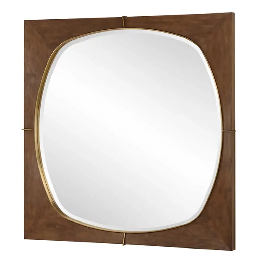 Add a retro character to your walls with the Garonne Wall Mirror from Uttermost, designed by Jim Parsons. This layered, memorable piece features a rounded mirror set within a fine metal frame, framed further by solid pine in an antiqued walnut stain. The subtly sloped profile is enhanced by plated brass stainless steel accents and a beveled edge on the reflector, blending Mid-Century Modern and transitional styles with ease.