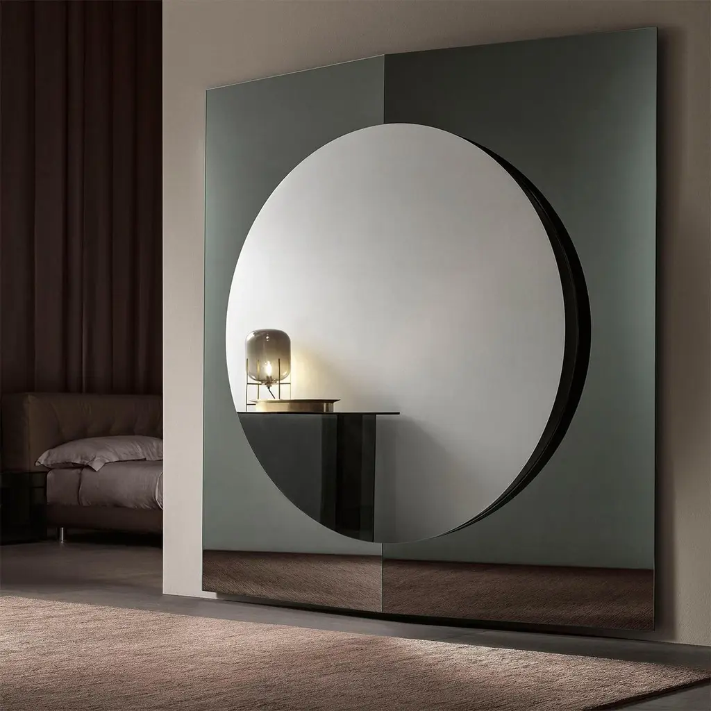 Mirror gate glass made with wood structure with2 slightly inclined mirror glass panels and with around central mirror glass.Measures: L 200 x D 18 x H 200cm, price: 7500,00€Also available in:L160 x D 16 x H 160 cm, price: 6300,00€.Also available in smocked mirror glass or in bronzedmirror glass or in golded mirror glass, on request including up-charge according to the finishes.
