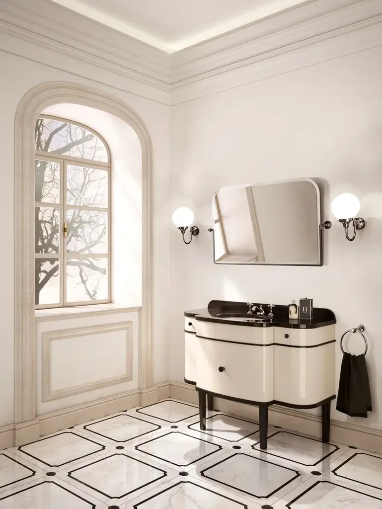 GATSBY 2 is an exquisitely elegant brass tilting mirror, is the “opulent” version of the original Gatsby 1 mirror. Its characteristic design features beveled edges and rounded top corners. Polished nickel finish, also available in chrome and light gold.