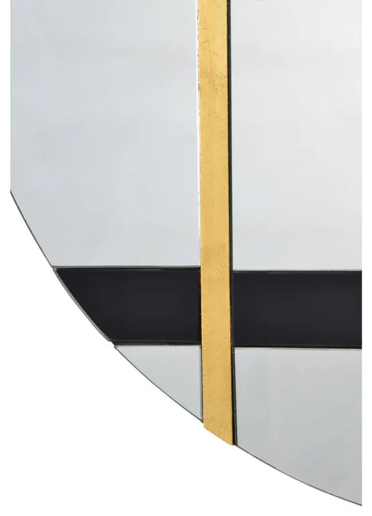 Abstract yet timeless, this mirror carries an artistic element, while allowing the reflection to take a primary focus. Featuring gold leaf finished metal and black glass tinted accents, it blends seamlessly into a modern entryway.