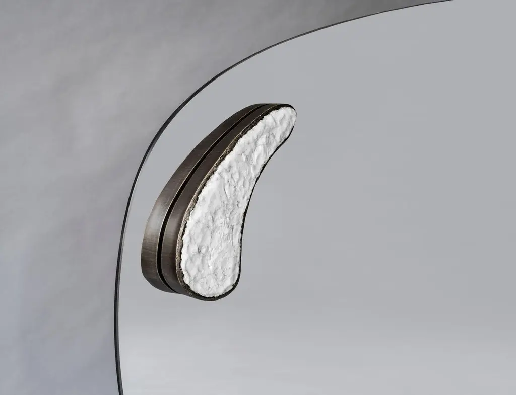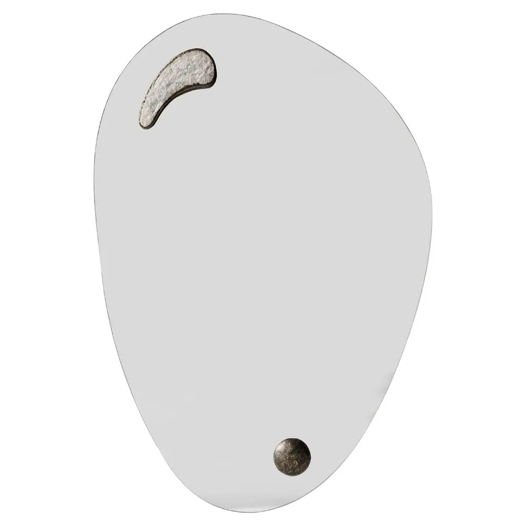 Part of our Gem Collection, the frameless biomorphic shape of the Gem Mirror features a chunk of roughly finished Howlite stone encased in solid antique cast bronze, a technique reminiscent of a bevel settling in jewelry. A piece of textured cast solid bronze is inset into the mirror's opposite corner, creating balance among these two elements.