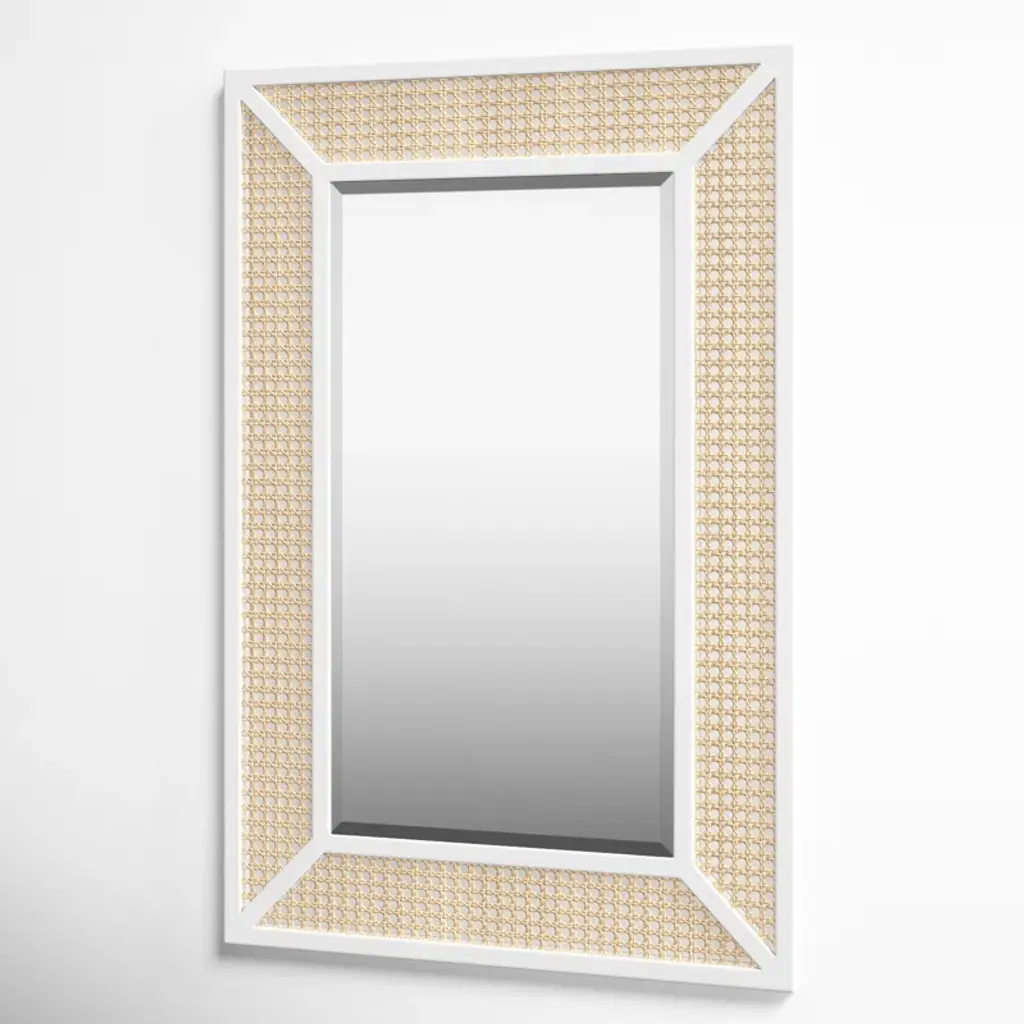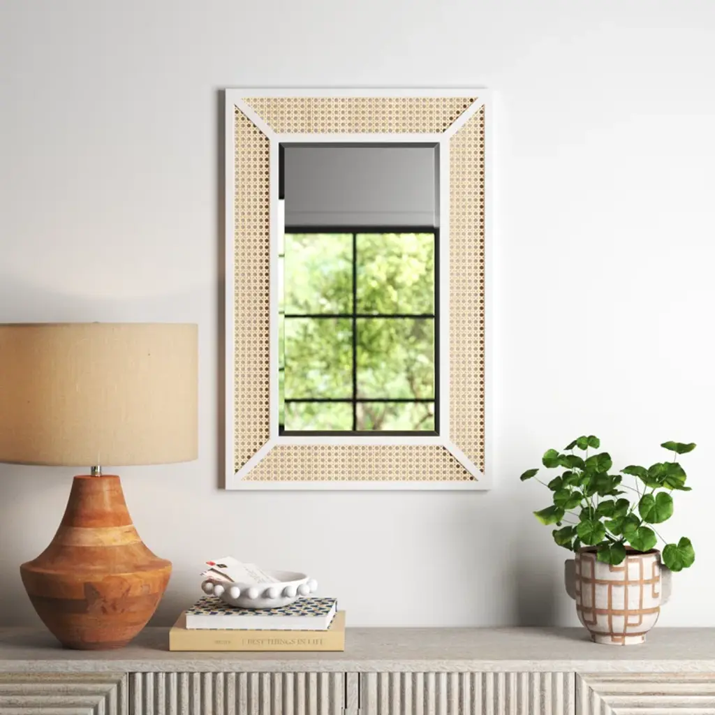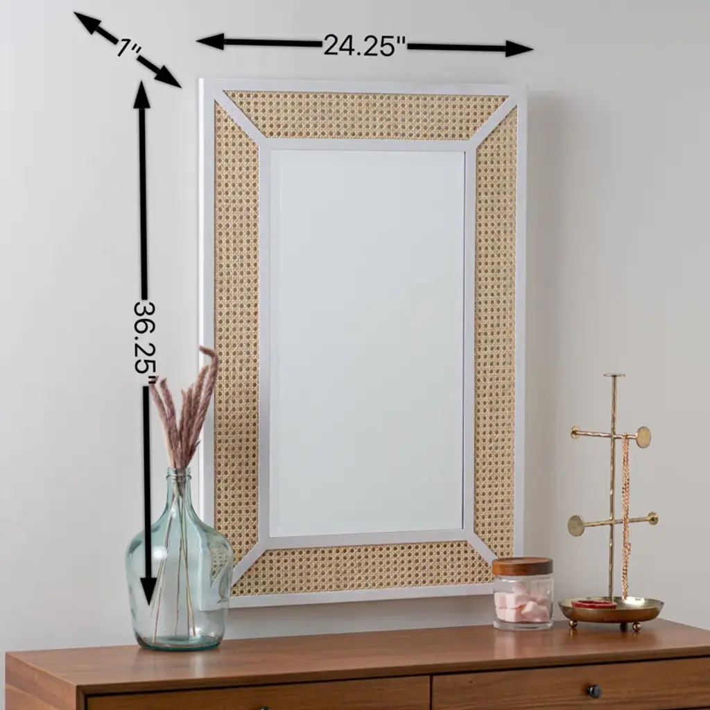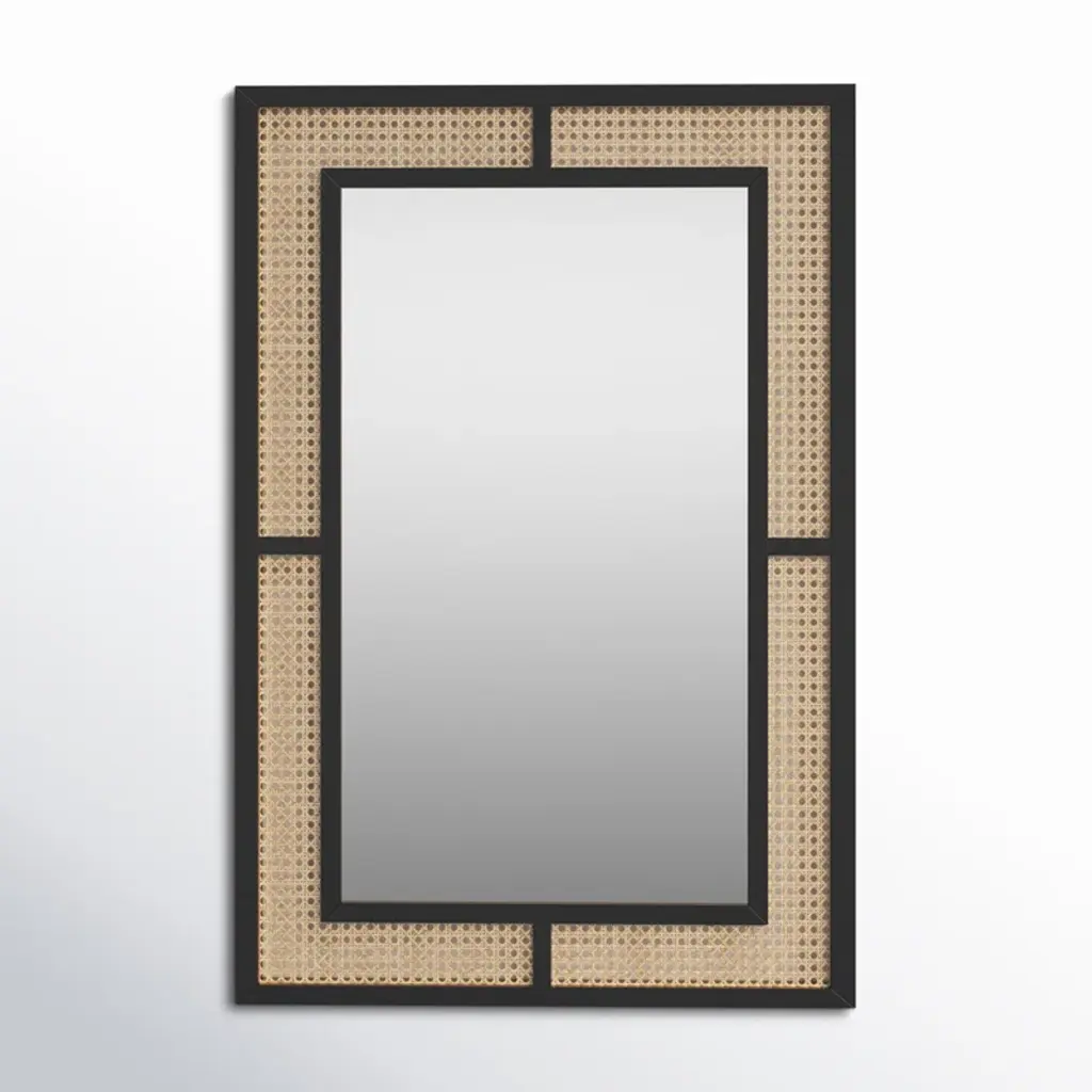 Rattan accents and a dark finish combine in this elegant accent mirror. It's made from wood and metal with a neutral finish and features four airy, open rattan panels around the top and side of the mirror. A beveled glass center adds an elevated look we love, plus added versatility. This mirror can be hung either horizontally or vertically, so it's a great choice for spaces of all shapes and sizes. Or, if you'd rather not bother with hanging, you can lean it up against any space for a casual, yet curated look.