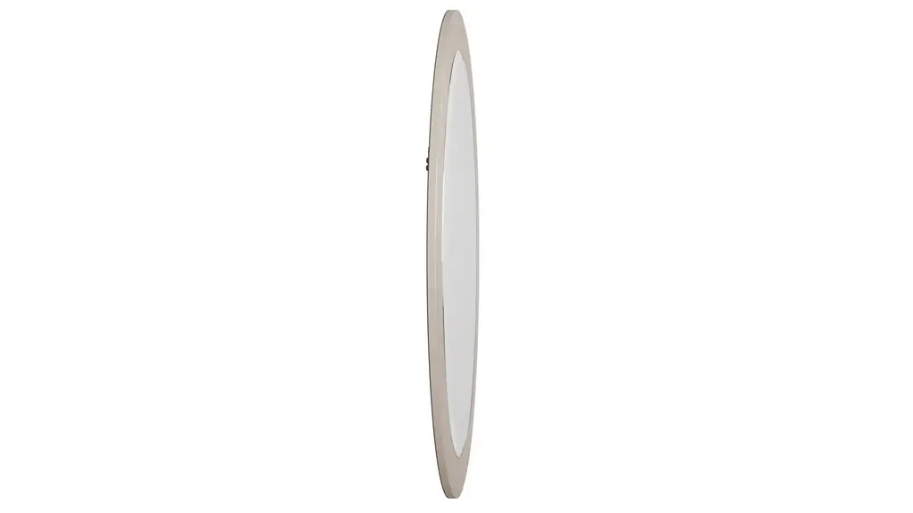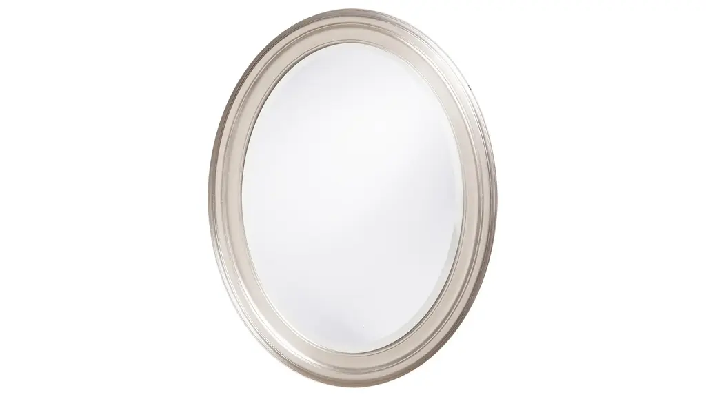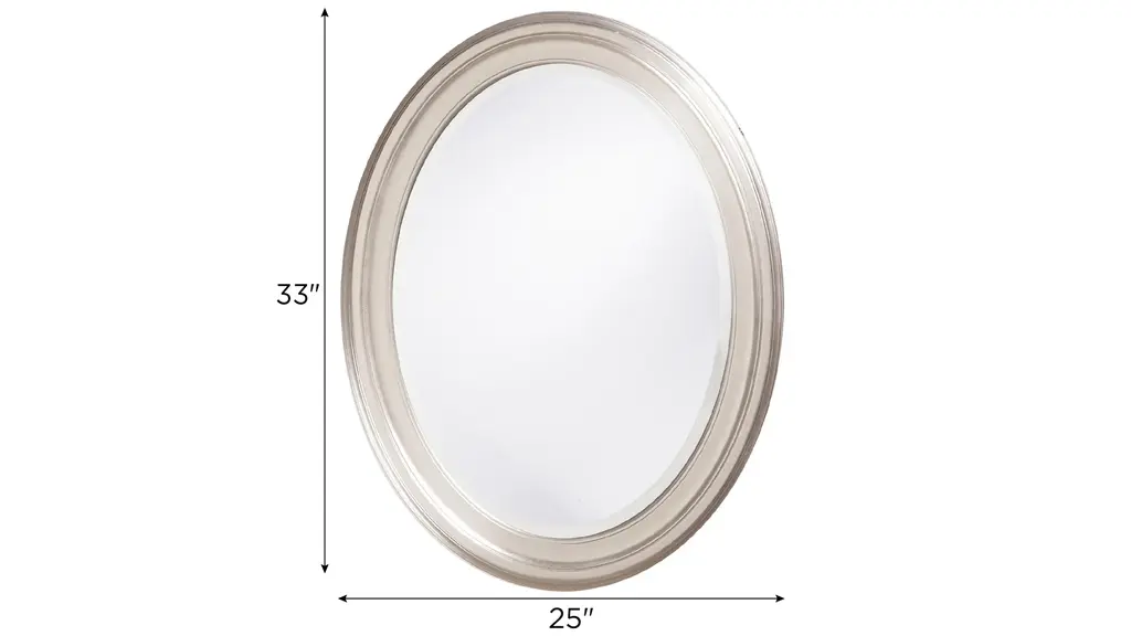 The George Mirror features a bright silver leaf finish. The oval frame is made from wood and is accented with grooves for added depth and character. For more added detail the mirror features a one inch bevel. Its Transitional style makes this mirror a favorite for bringing some flair to your decor. This simple yet stunning piece would be a great addition to any room. It is a perfect focal point for an entryway, bathroom, bedroom or any room in your home. D-rings are affixed to the back of the mirror so it is ready to hang right out of the box in either a horizontal or vertical orientation!
