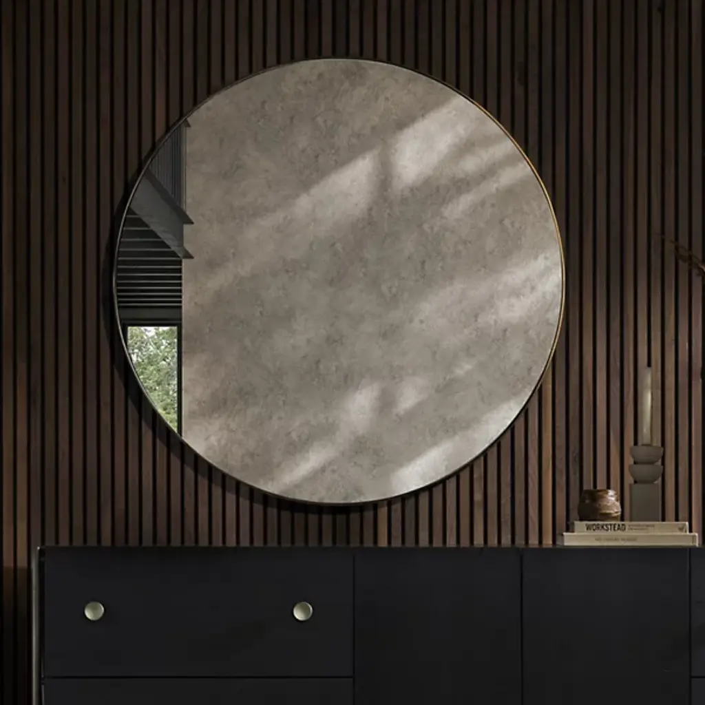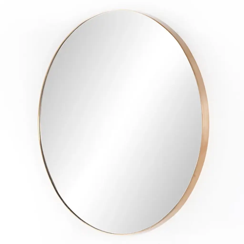 The Georgina Round Wall Mirror from Four Hands is a beautifully rounded mirror encased in polished brass that brings timeless elegance to any space. The gleaming brass frame adds a touch of sophistication and warmth, while the rounded shape softens the overall look. This mirror is not just a functional piece but also a stylish accent that effortlessly enhances the aesthetic of your room, whether placed in the entryway, bedroom, or living area.