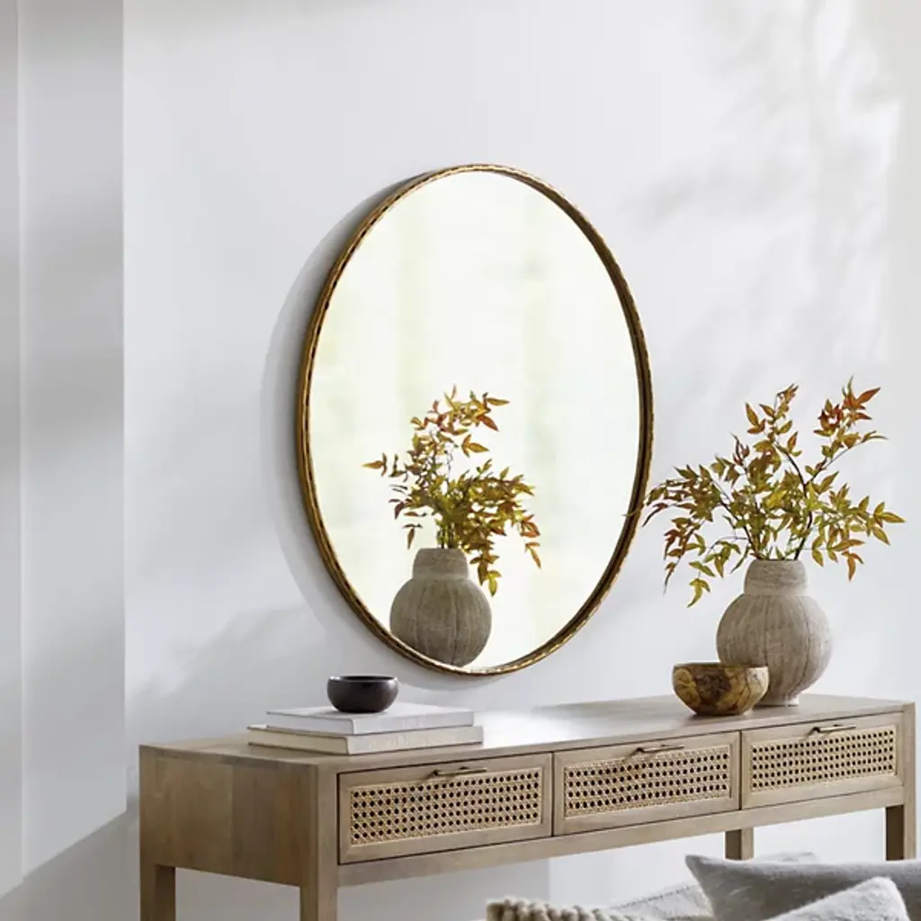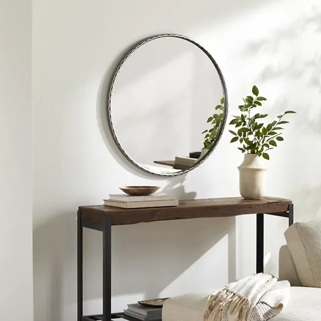 The Georgine Accent Mirror from Surya exemplifies how restraint in design can yield powerful visual impact, proving that sometimes less truly is more in modern decor. This round piece eschews ornate detailing in favor of clean lines and geometric precision. The antiqued iron border creates a subtle contrast against the reflective surface, adding depth without overwhelming the senses. The mirror's vertical orientation makes it ideal for narrow walls or as part of a curated gallery display.