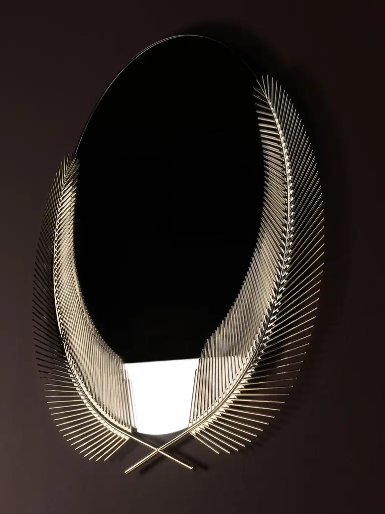 Mirror with palm leaves in brass. The round mirror surface is sunk into the graphic embrace of two palm fronds. The Sunset mirror is a wall-mounted declaration of the true summer paradise scenario that lingers just below the surface of the present moment. Materials:Brass and mirror.