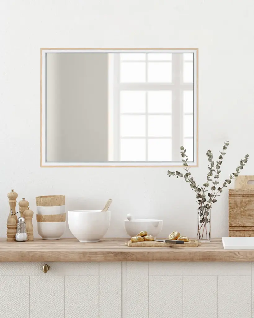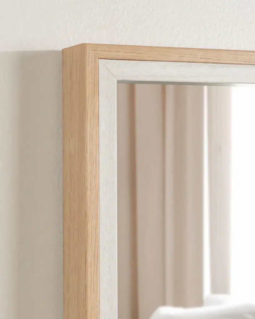Bring a tranquil decor theme to your space with the lovely Gibson mirror. The Gibson features a paper-wrapped frame with a unique texture and grain that brings a worldly look to your space. This mirror also features a two-tone natural wood and white finish that portrays a coastal look, projecting a casual and comforting aesthetic in any room of your home. The overall dimensions of the Gibson wall mirror are 18 inches by 1 inch deep by 24 inches, making it a standout piece of dimensional decor that commands attention. This wall mirror is fabulous as a bathroom vanity mirror or a decorative statement in a coastal area of the home. The Gibson hangs vertically and horizontally, allowing you to hang it in the bedroom, on the mantle in your living room, or over a console in your entryway. Its charming appearance is a fabulous way to showcase your own transitional style. Hang this mirror in your favorite orientation with the metal D-ring hangers attached to the back.• CASUAL STYLE: The Gibson mirror has a delicate, paper-wrapped frame with a unique texture to give it an elevated and refined look• CLEAN FINISH: This edition of the Gibson mirror features a two-tone natural wood and white finish that offers a coastal look for your wall• LARGE SIZE: This mirror is 18 inches wide by 1 inch deep by 24 inches tall, making it perfect for a bedroom, bathroom, entryway, or living room• VERSATILE: The Gibson has the capability to hang in vertical and horizontal orientations to hang in multiple spaces in your home• EASY TO HANG: D-ring hangers are attached to the back of the Gibson''s frame for quick and easy installation
