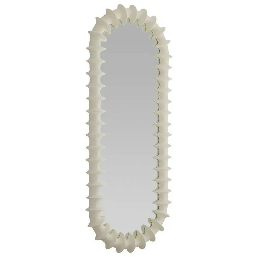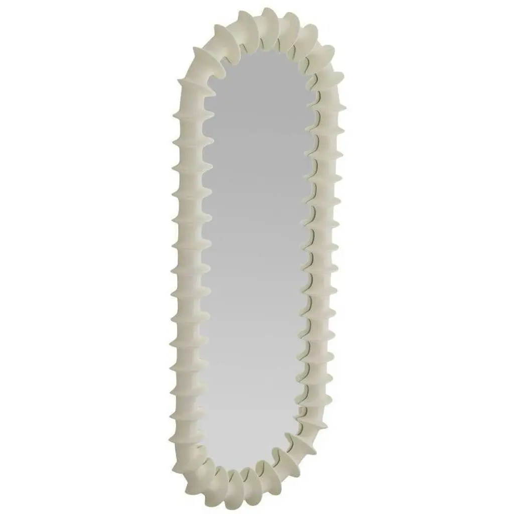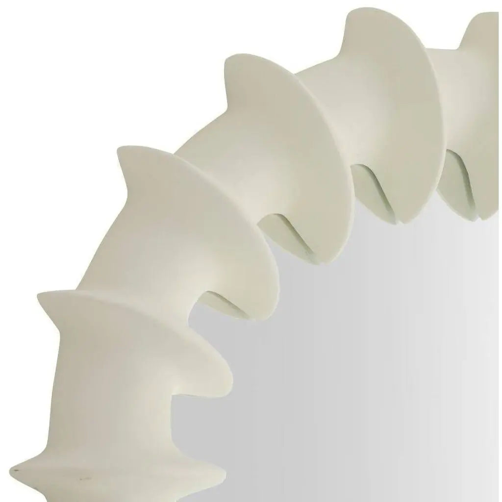 A textural frame of matte ivory resin ripples and flows to recall the ridges of a spine. Its intriguing finish converges inward, creating dimensionality on any wall. Designed to be displayed both vertically and horizontally. Secured at the back with a cleat attachment.