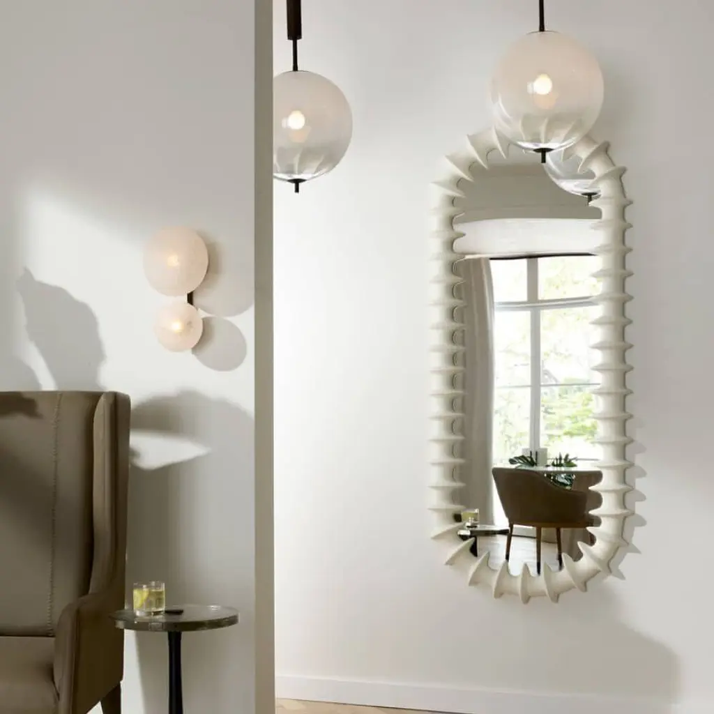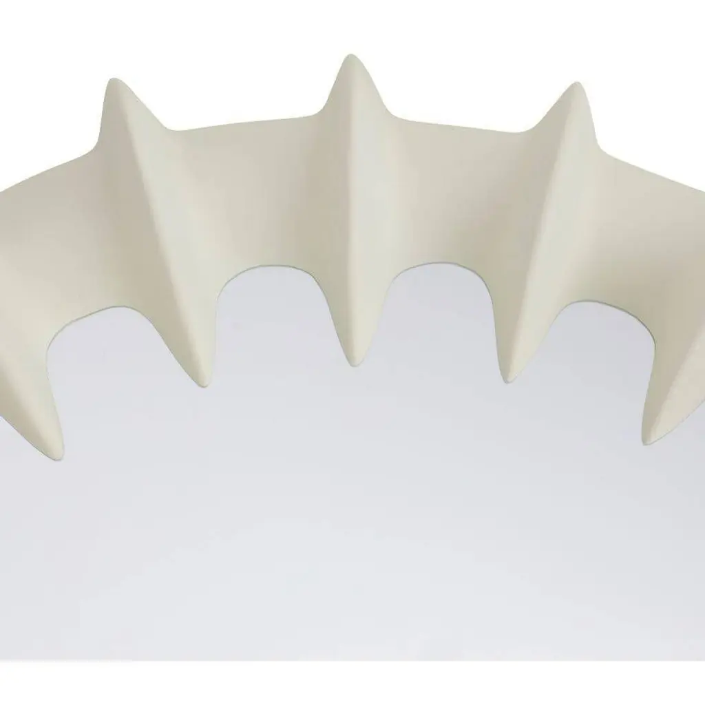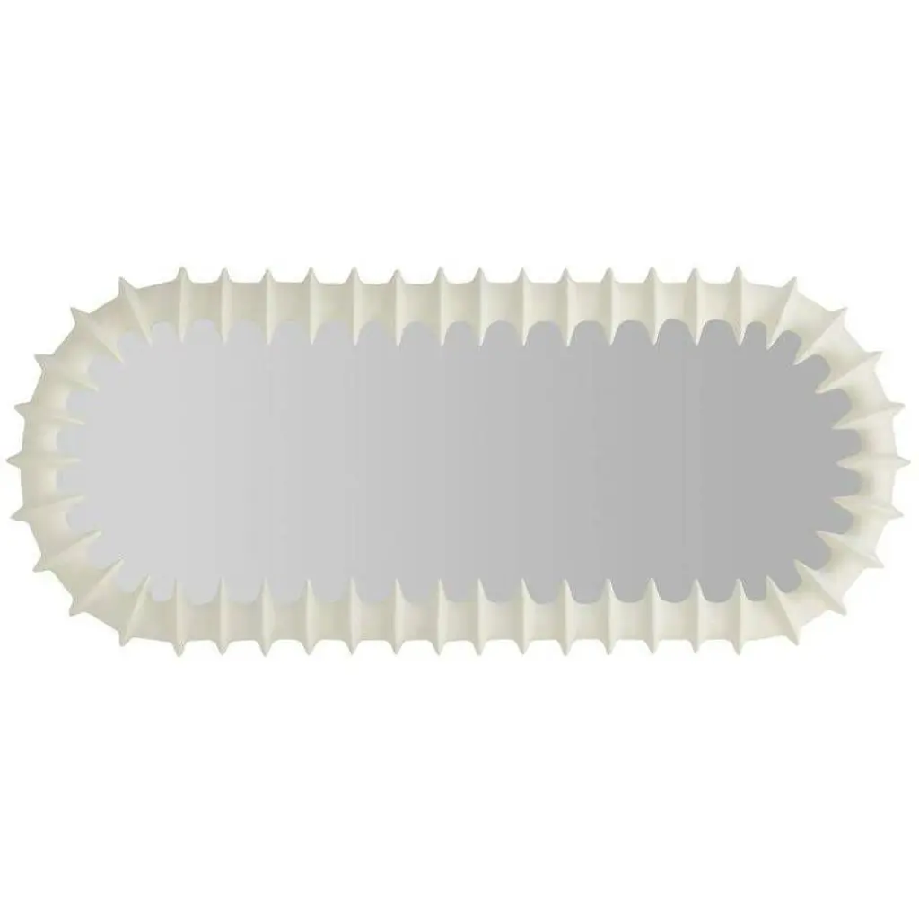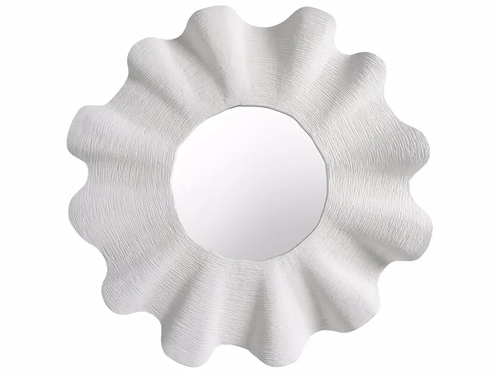 A textural frame of matte ivory resin ripples and flows to recall the ridges of a spine. Its intriguing finish converges inward, creating dimensionality on any wall. Designed to be displayed both vertically and horizontally. Secured at the back with a cleat attachment.