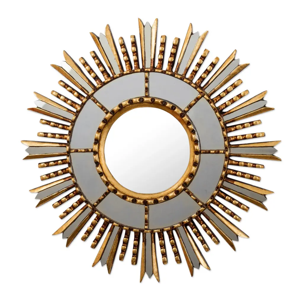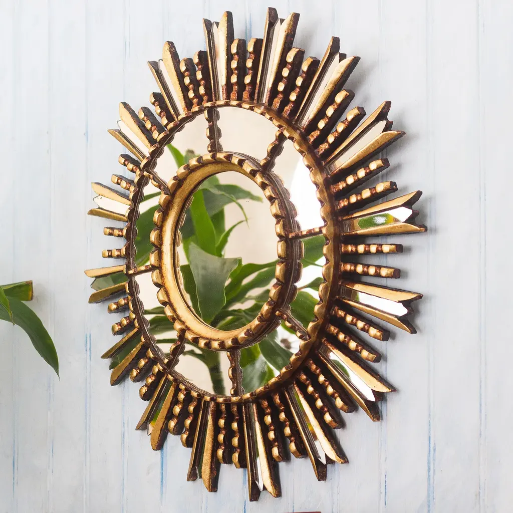 Inspired by the decadent ornamentation of the colonial Cusco school, Gliseria Soto in Peru creates this gorgeous wall mirror. Crafted from wood, the frame receives applications of bronze leaf with a lustrous gleam.