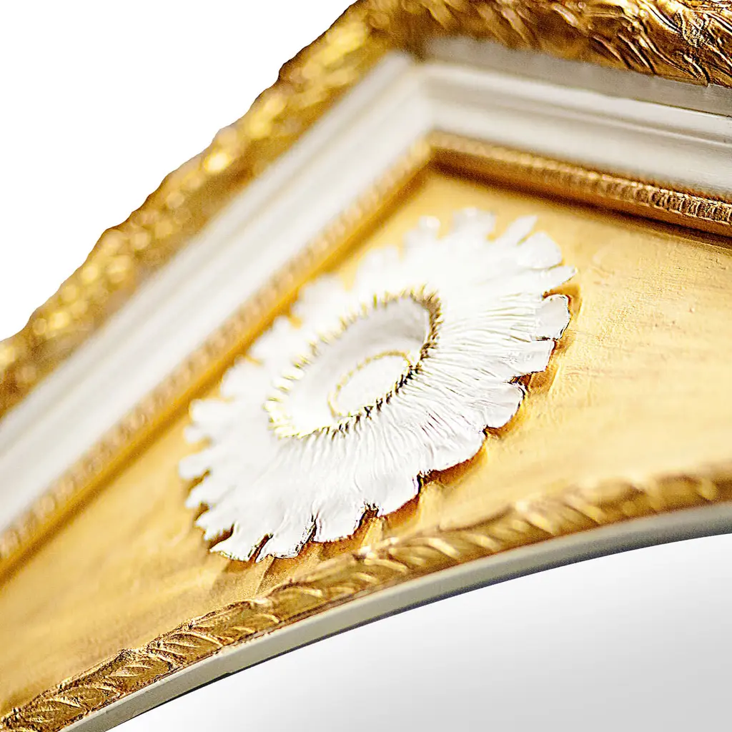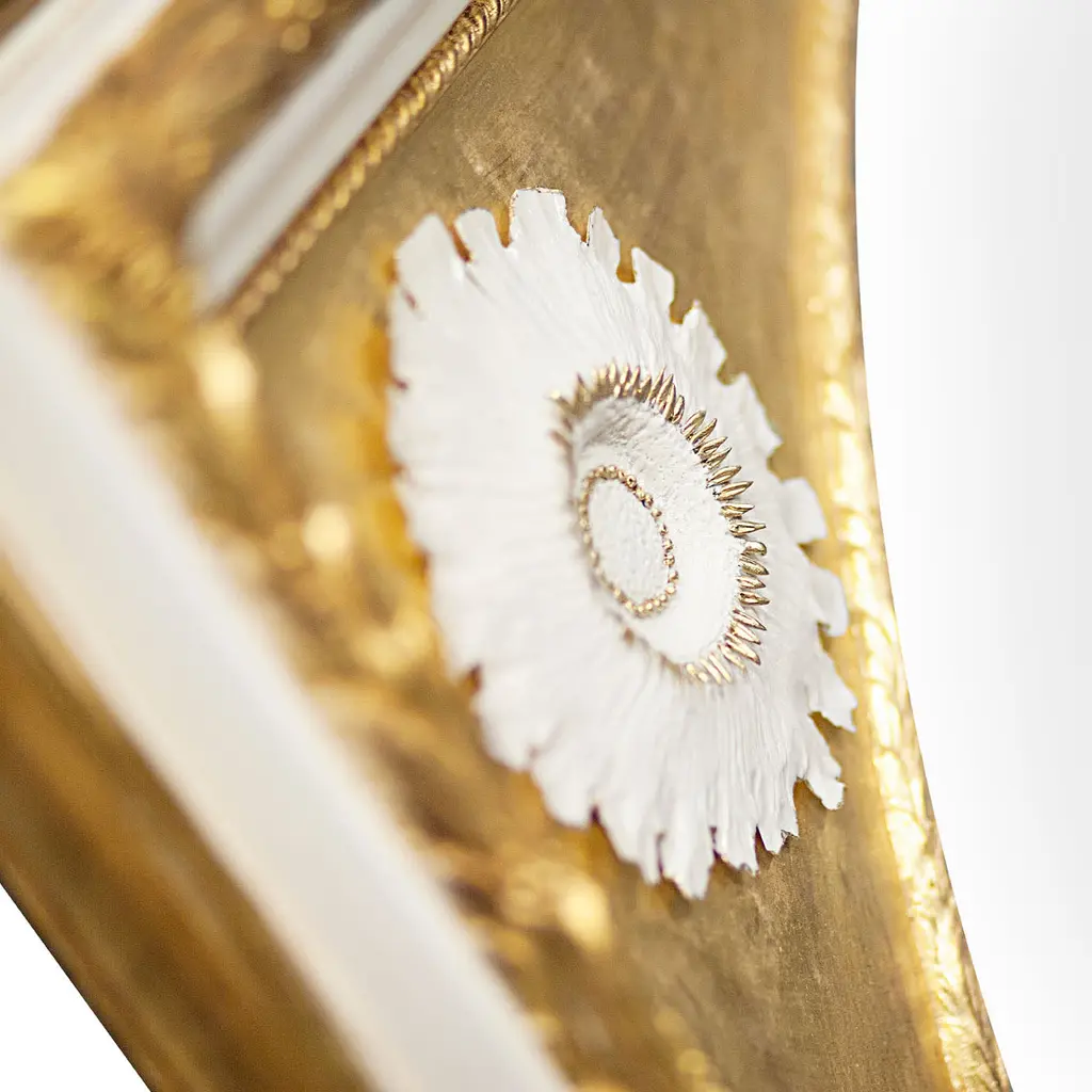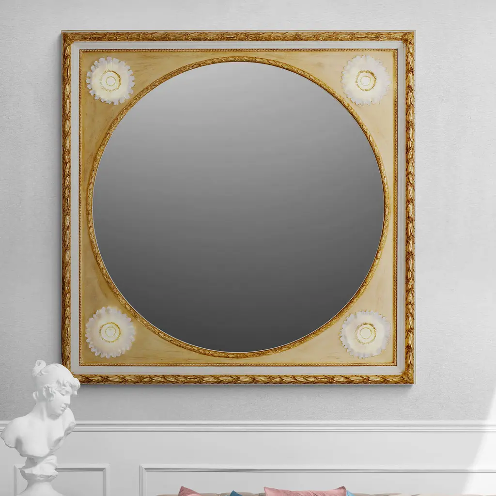 Sunflowers Mirror: a masterpiece of elegance and sophistication. This round wall mirror is set within an exceptional square frame, handcrafted from wood and enhanced with patinated gold leaf. The frame features hand-painted Capodimonte porcelain applications, depicting magnificent sunflowers that bring a touch of nature and art to any setting. Perfect for both classic and contemporary interiors, it adds a subtle yet unmistakable sense of luxury.