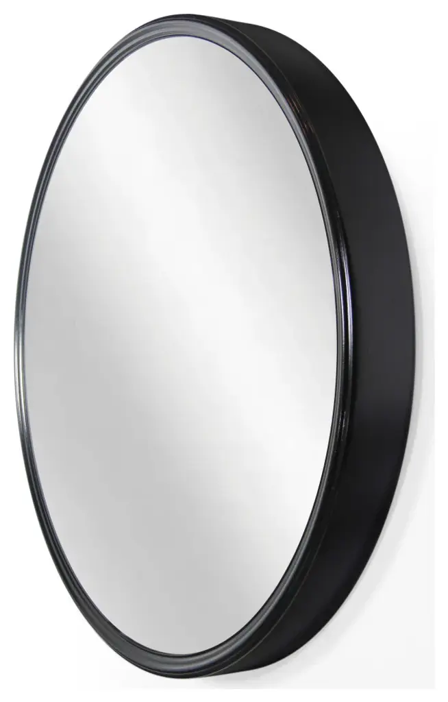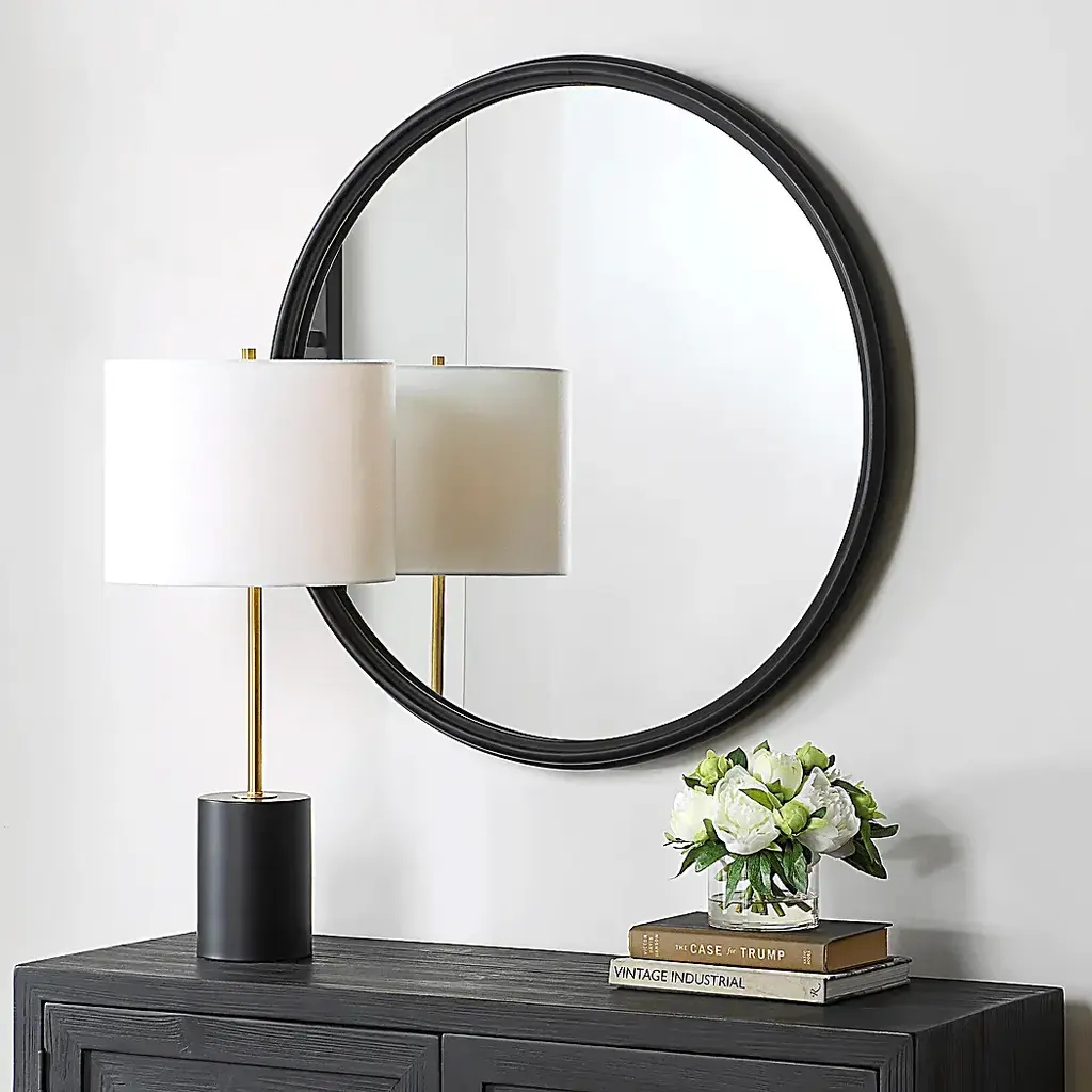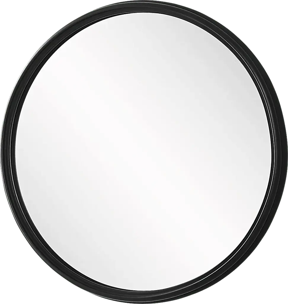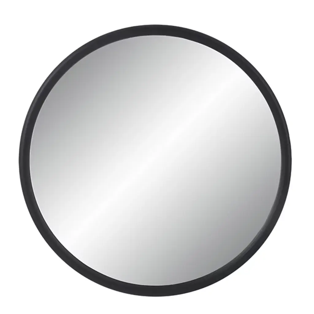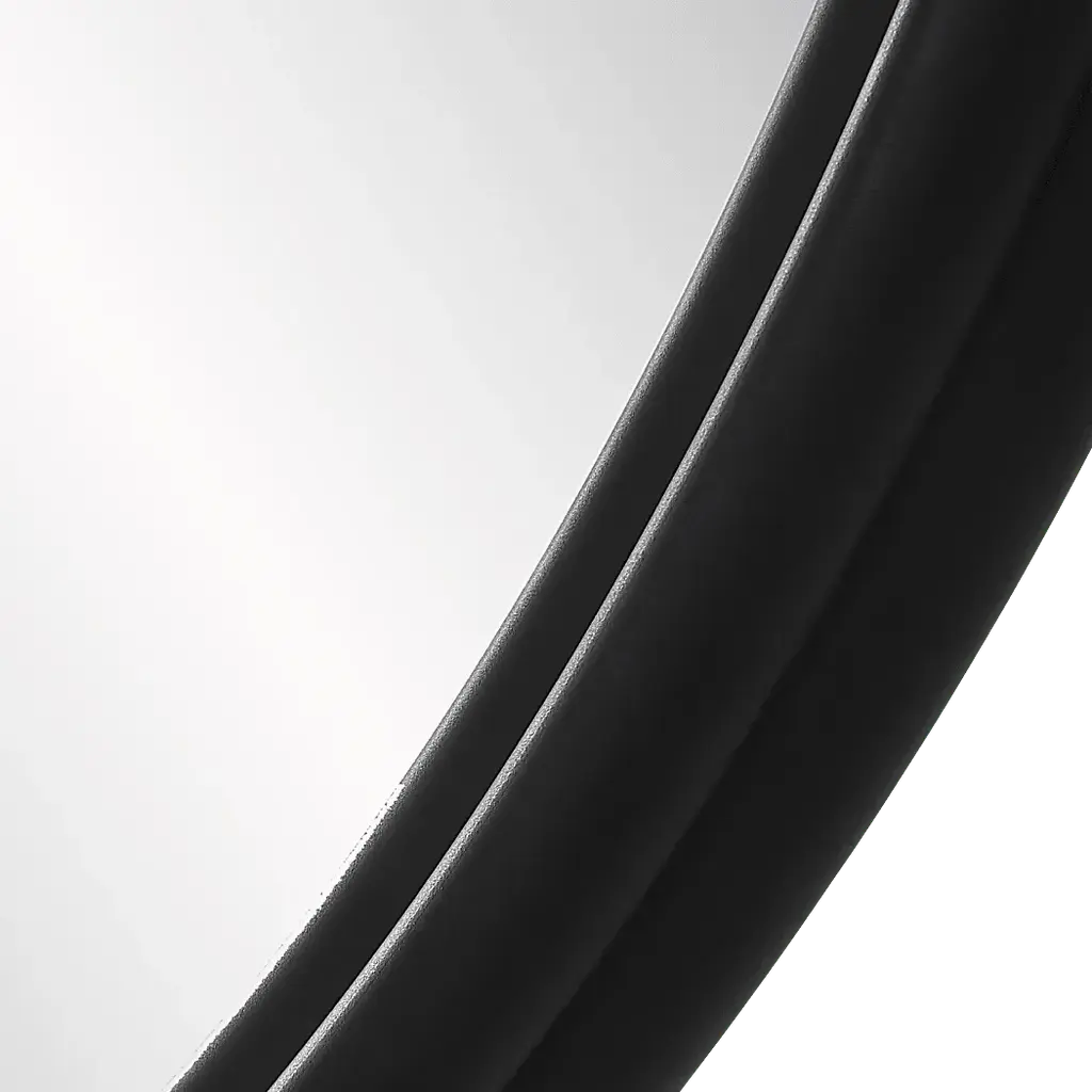 This Gilo 32" round mirror features a unique stacked frame construction, boasting a slightly smaller frame layered atop a slightly larger one, creating a dimensional effect. The rounded edges of both frames soften the look, adding a touch of subtle refinement. Finished in a matte black, this mirror is a blend of contemporary design and timeless elegance.