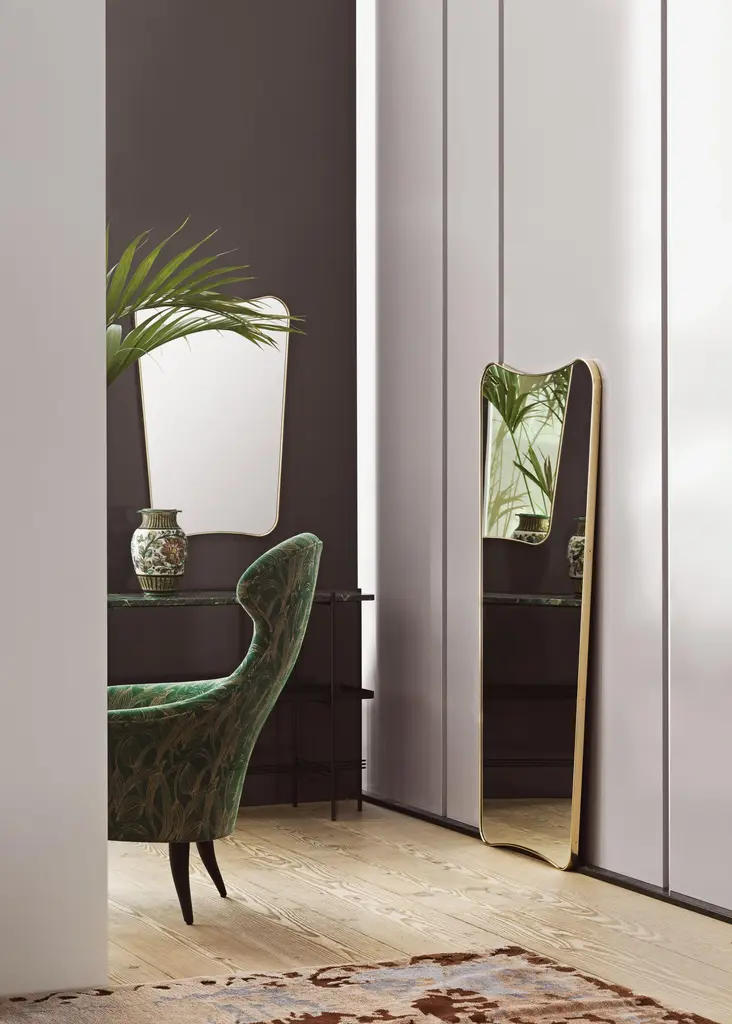 Gio Ponti F.A. 33 large mirror in brass. The F.A. 33 Mirror was originally designed by Gio Ponti in 1933 for Fontana Arte, the period’s most prominent lamp, glass, and mirror manufacturer. Executed in brass and glass. With its curved shape and iconic expression, the timeless F.A. 33 Mirror adds a gentle touch of elegance to any interior style. The mirror comes in two different sizes, full length and half length, making it possible to be used in any room as a classic mirror or a striking decorative design element. Price is per item. Available in polished or black brass and in full or half length sizes. Italian designer, architect, and editor, Gio Ponti (1891-1979) is one of the most influential design visionaries of the 20th century. Ponti designed a wide array of furniture and products throughout his career - from cabinets, lamps, and chairs to ceramics and glassware - and his buildings, including Pirelli tower in Milan and Denver Art Museum, were erected in 14 countries. Through Domus, the design magazine he founded in 1928, Ponti promoted a new curiosity and open-mindedness towards new design thinking. Made to order. Please note that these must drop ship directly from GUBI's order fulfillment warehouse in Chicago, so pick up is not an option.