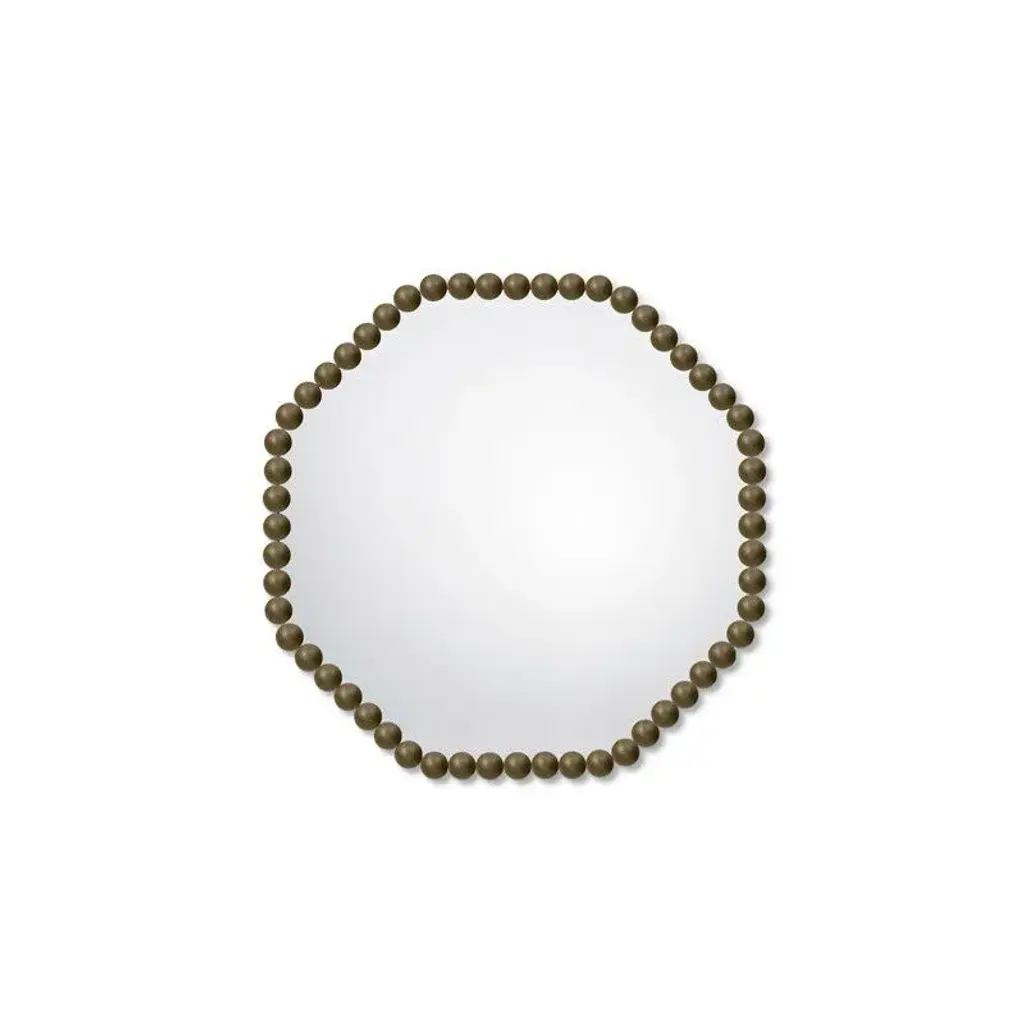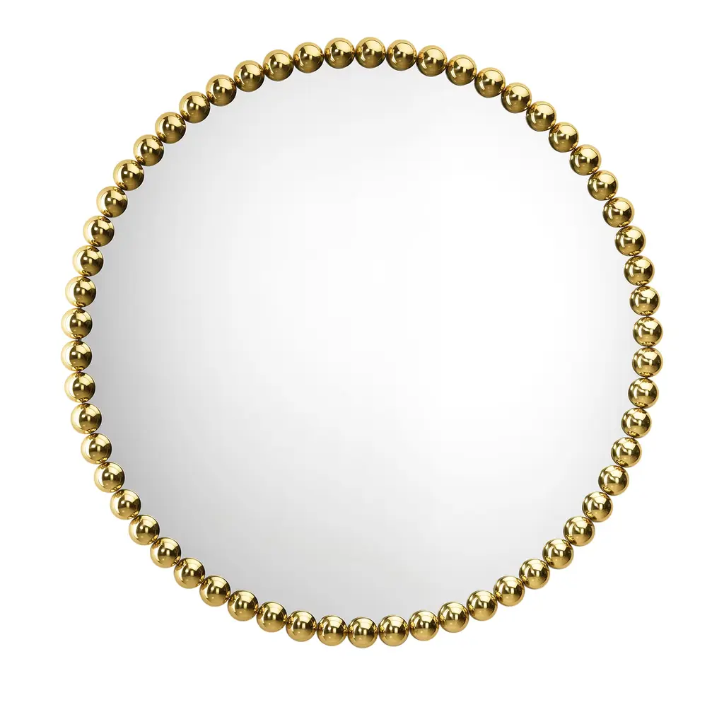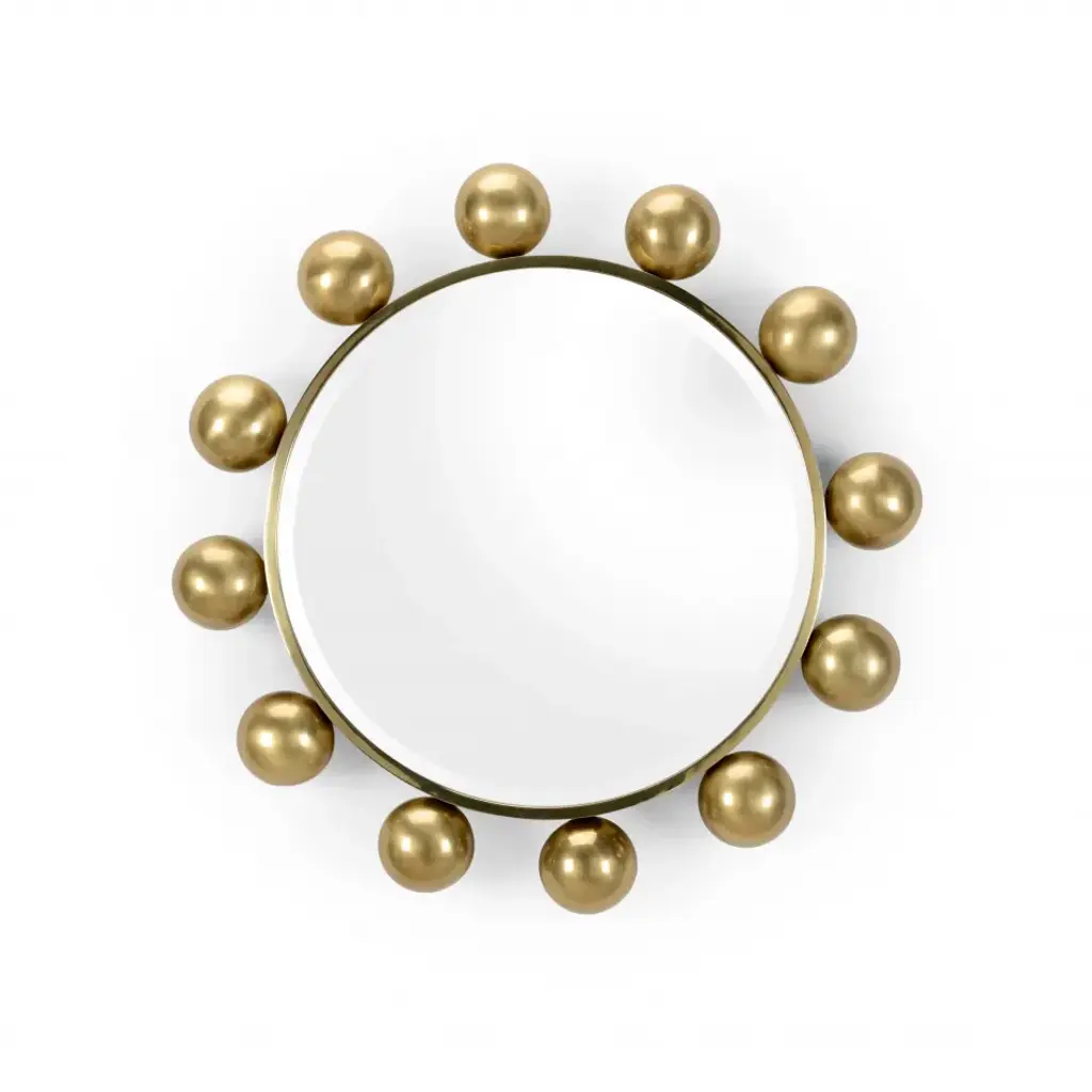 Gioiello is an octagonal framed brass mirror.The Gioiello mirrors are inspired by the infinite possibilities of a brass sphere as a single structural element, designed to create a collection of objects and their story through repetition and play.The brass spheres are polished to perfection, exuding a precious allure like a jewel for the home. By aligning them in numerous different forms, they create a collection of versatile frames, eliminating the need to create new molds or production tools.With their simplicity, they are also elegantly rich in appearance—transforming basic geometric shapes into captivating forms that reflect and multiply within the mirrors, making these mirrors striking and timeless wall decorations.