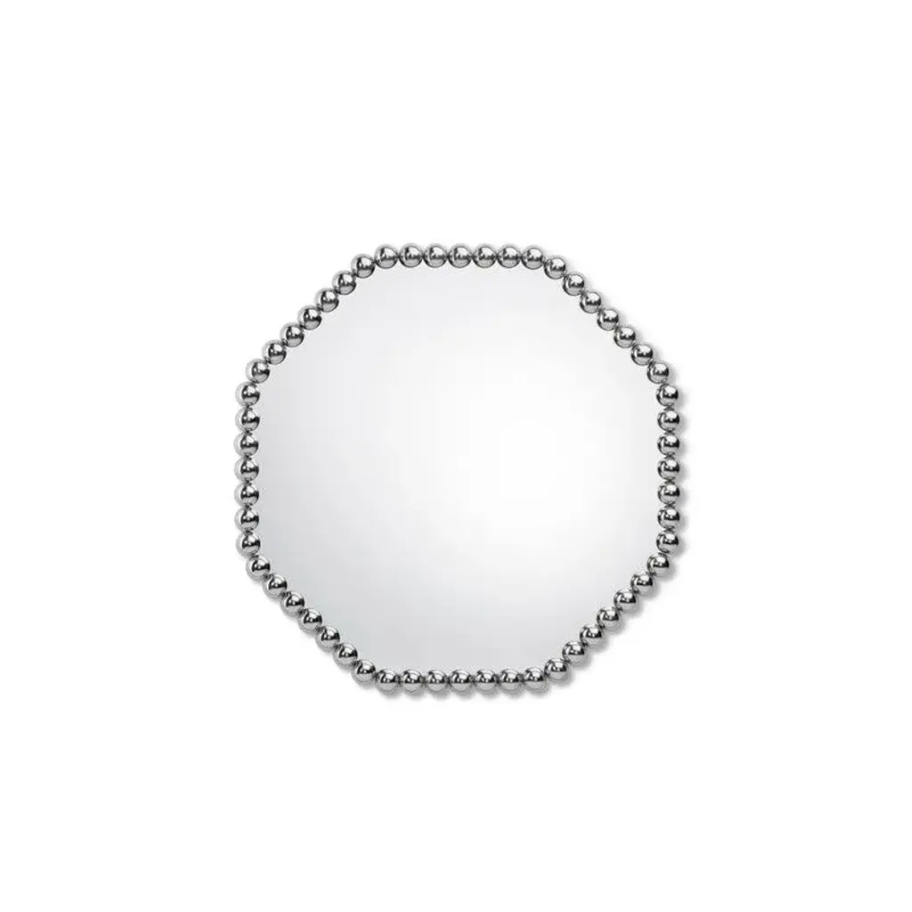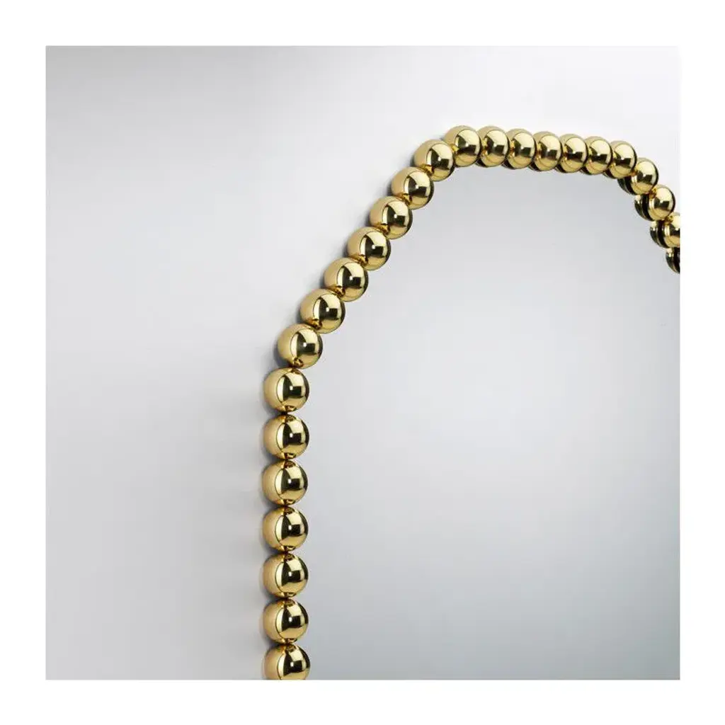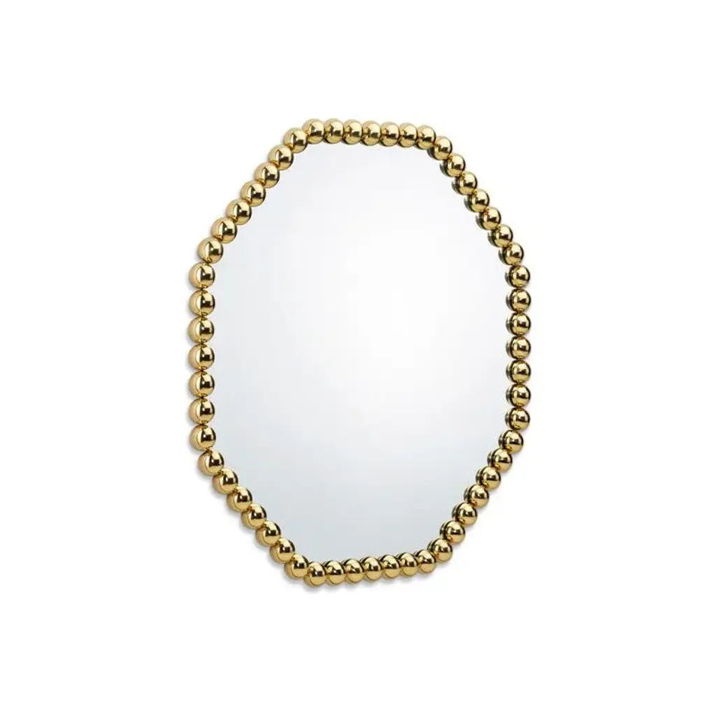 Gioiello is an octagonal framed brass mirror.The Gioiello mirrors are inspired by the infinite possibilities of a brass sphere as a single structural element, designed to create a collection of objects and their story through repetition and play.The brass spheres are polished to perfection, exuding a precious allure like a jewel for the home. By aligning them in numerous different forms, they create a collection of versatile frames, eliminating the need to create new molds or production tools.With their simplicity, they are also elegantly rich in appearance—transforming basic geometric shapes into captivating forms that reflect and multiply within the mirrors, making these mirrors striking and timeless wall decorations.
