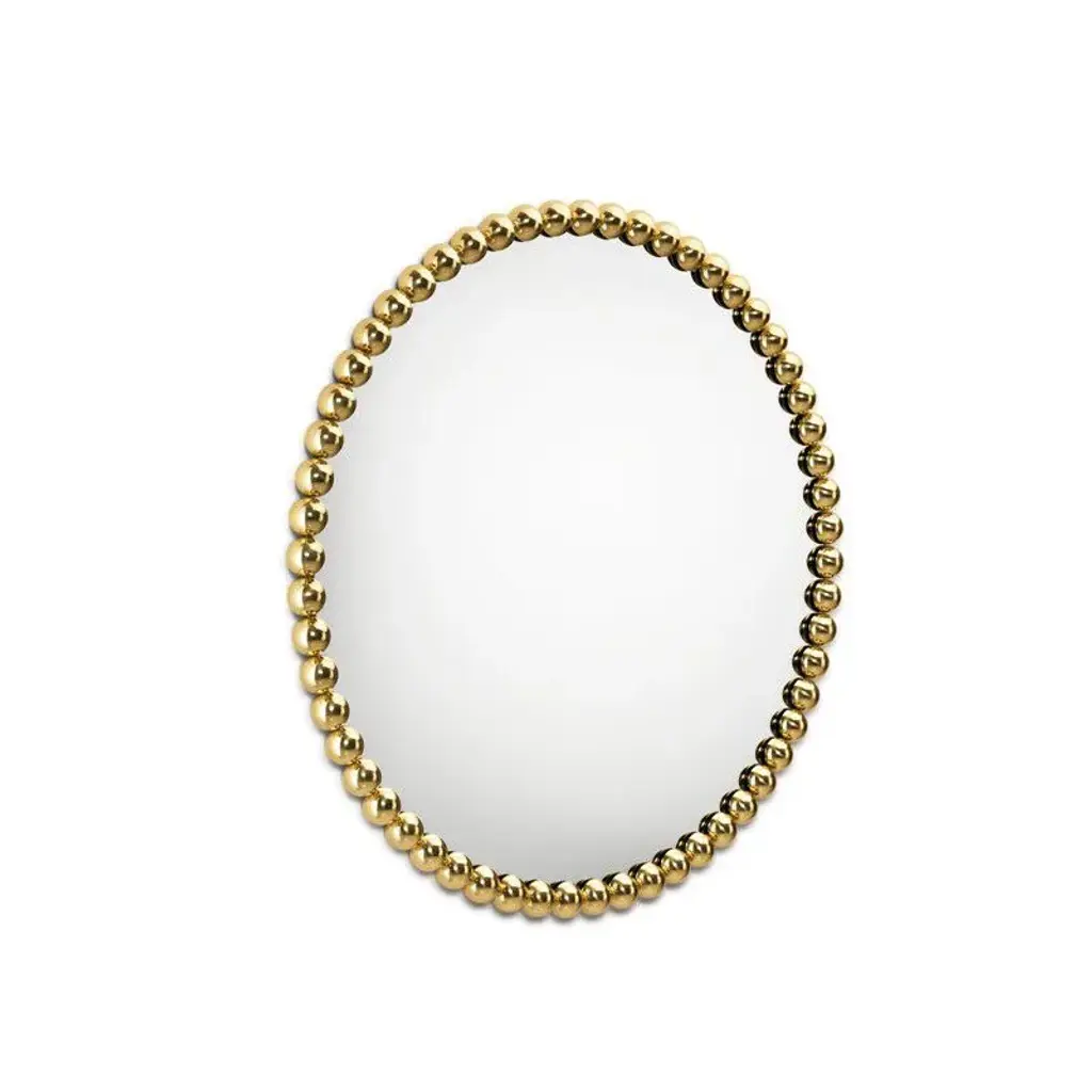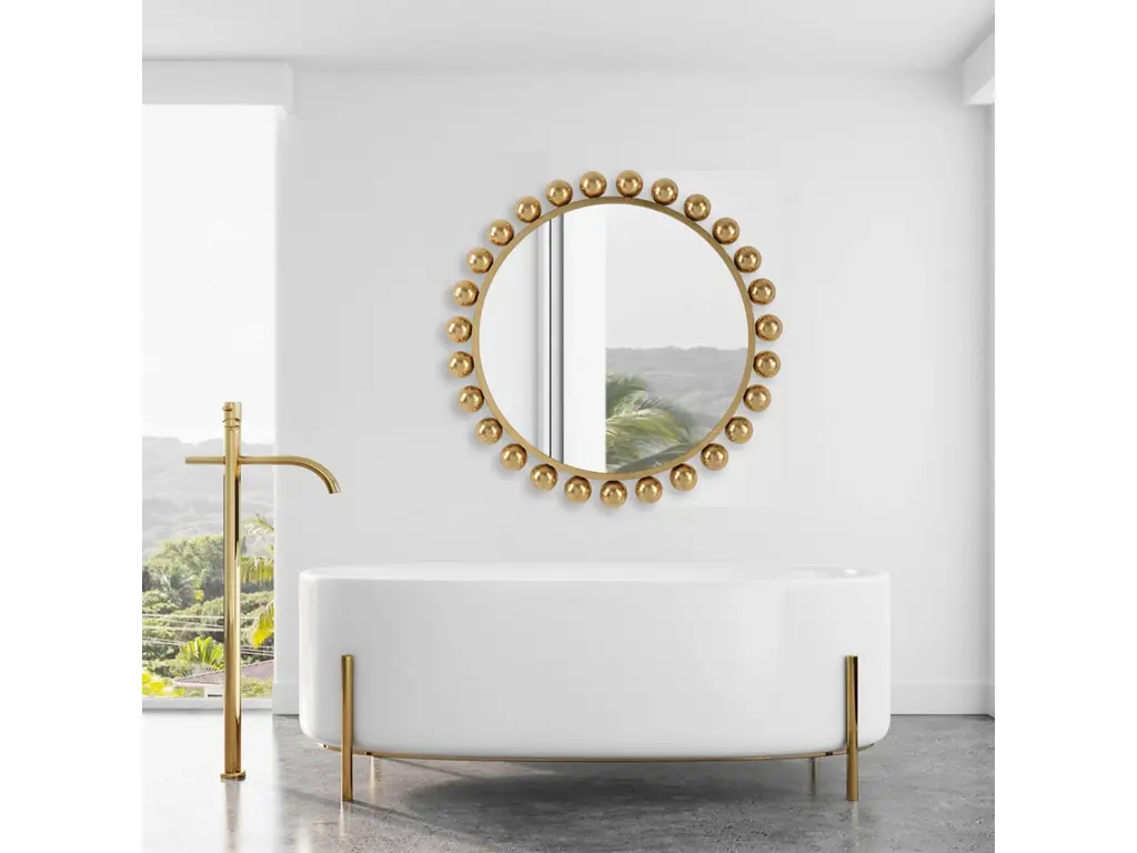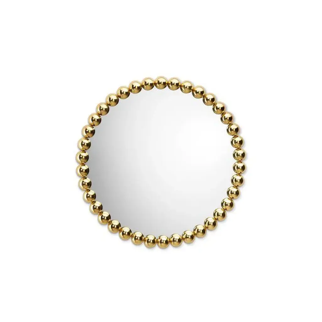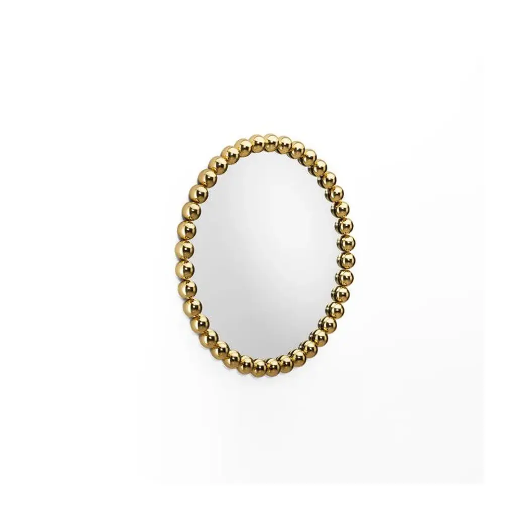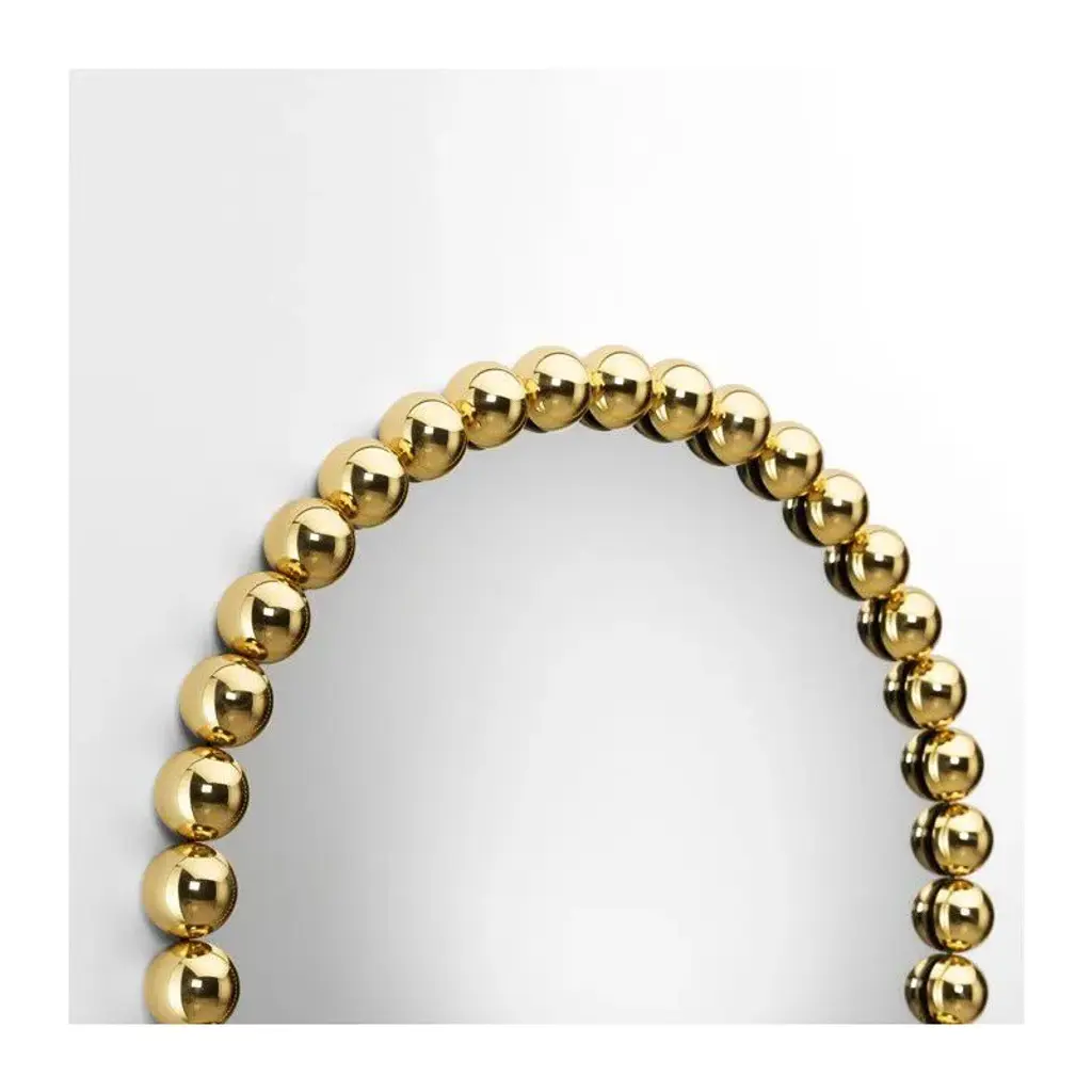 Gioiello is a round framed brass mirror.The Gioiello mirrors are inspired by the infinite possibilities of a brass sphere as a single structural element, designed to create a collection of objects and their story through repetition and play.The brass spheres are polished to perfection, exuding a precious allure like a jewel for the home. By aligning them in numerous different forms, they create a collection of versatile frames, eliminating the need to create new molds or production tools.With their simplicity, they are also elegantly rich in appearance—transforming basic geometric shapes into captivating forms that reflect and multiply within the mirrors, making these mirrors striking and timeless wall decorations.