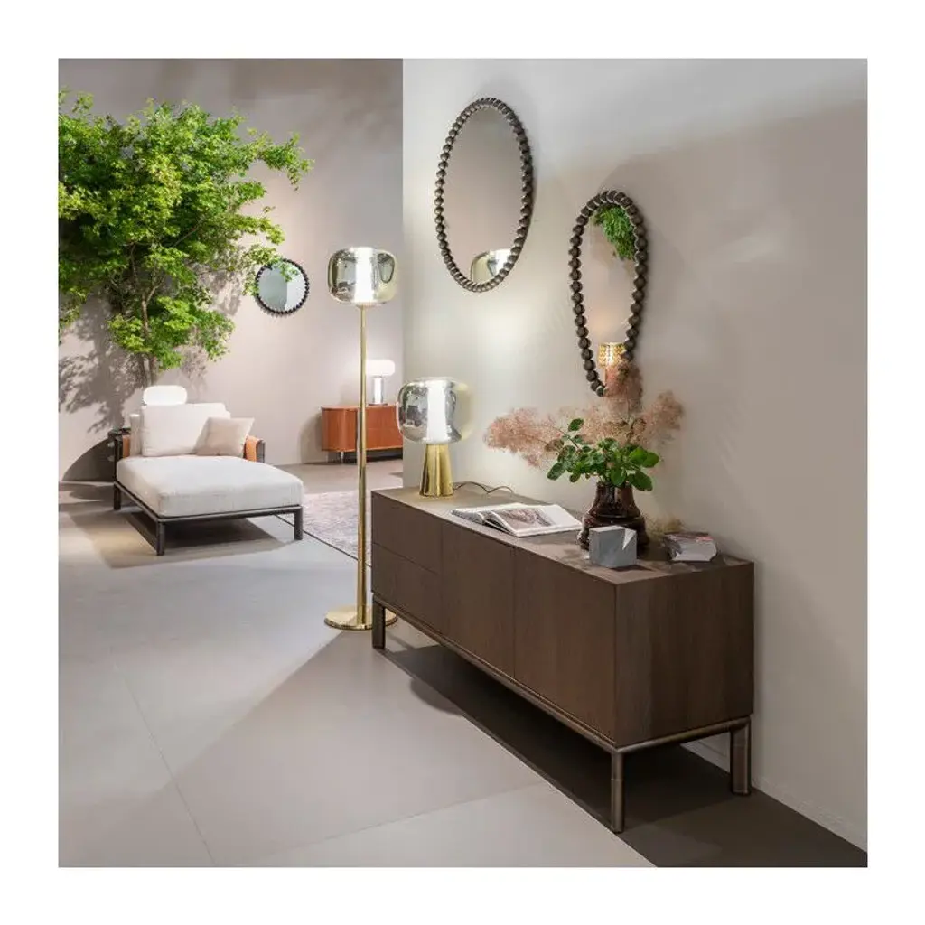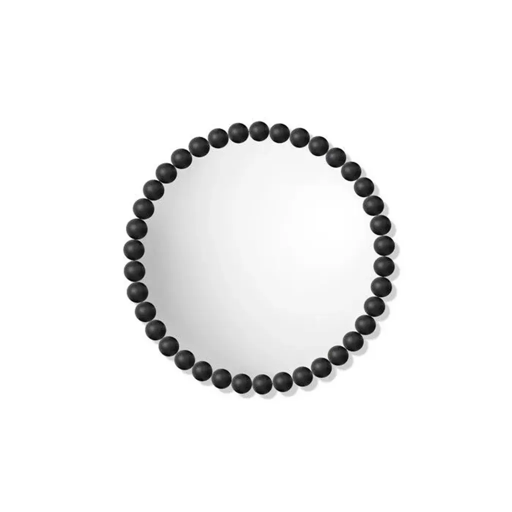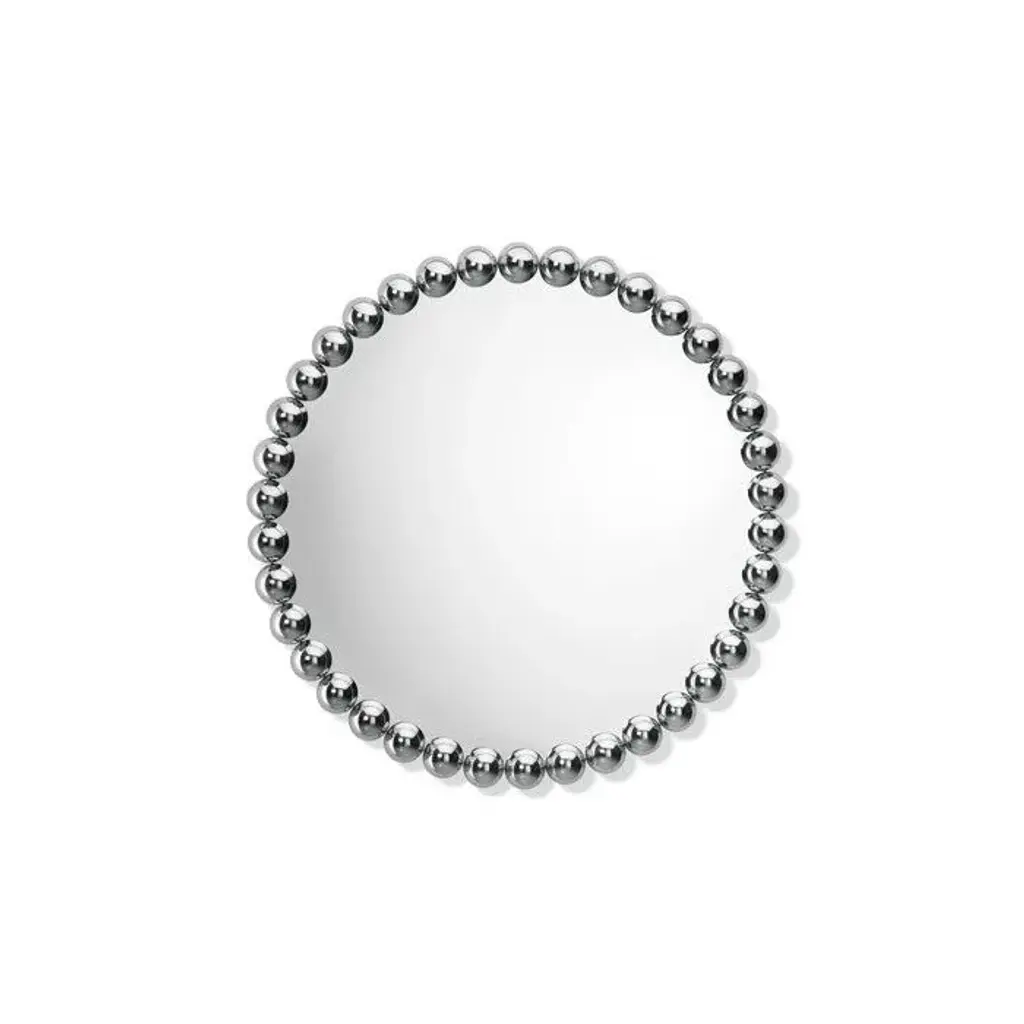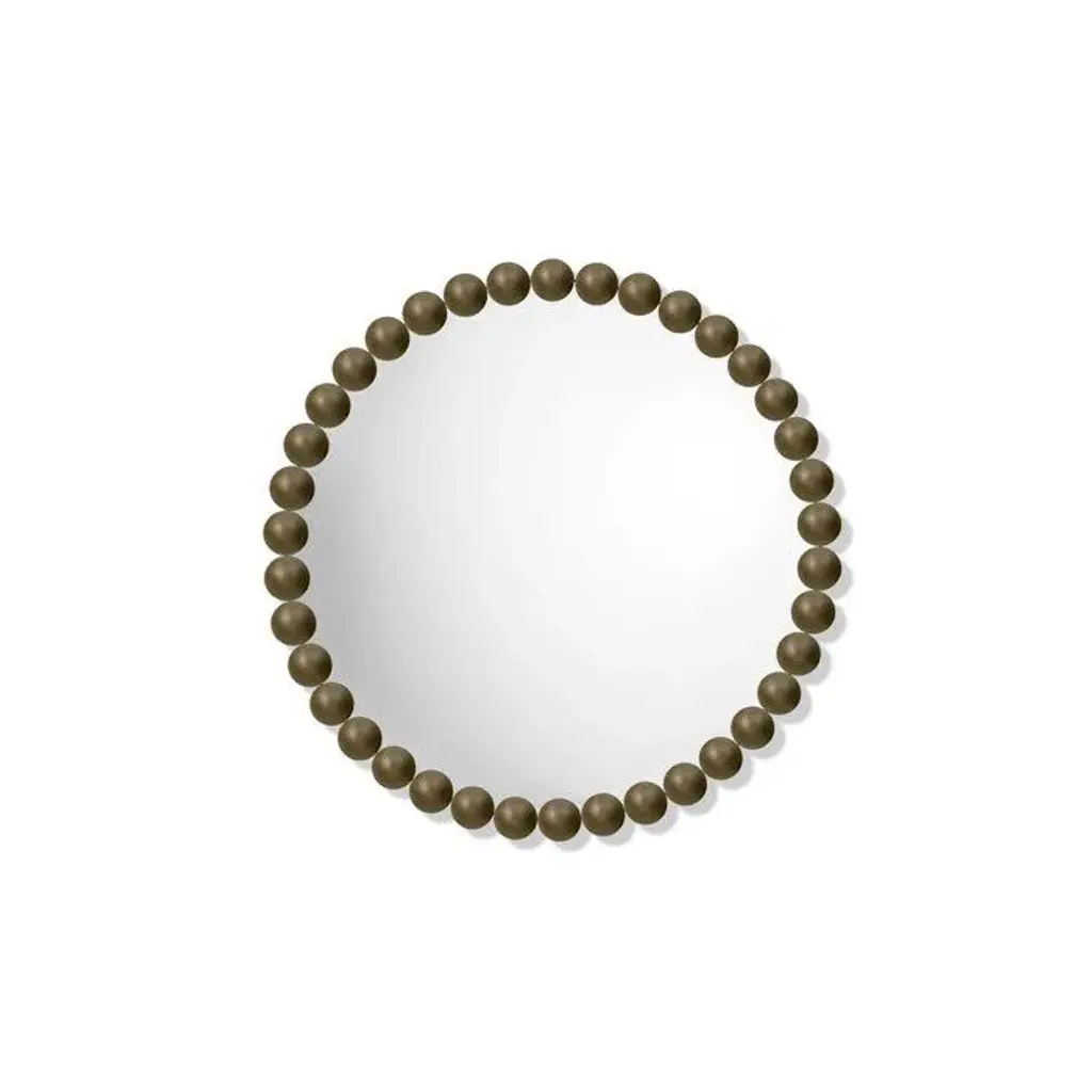 Gioiello is a round framed brass mirror.The Gioiello mirrors are inspired by the infinite possibilities of a brass sphere as a single structural element, designed to create a collection of objects and their story through repetition and play.The brass spheres are polished to perfection, exuding a precious allure like a jewel for the home. By aligning them in numerous different forms, they create a collection of versatile frames, eliminating the need to create new molds or production tools.With their simplicity, they are also elegantly rich in appearance—transforming basic geometric shapes into captivating forms that reflect and multiply within the mirrors, making these mirrors striking and timeless wall decorations.