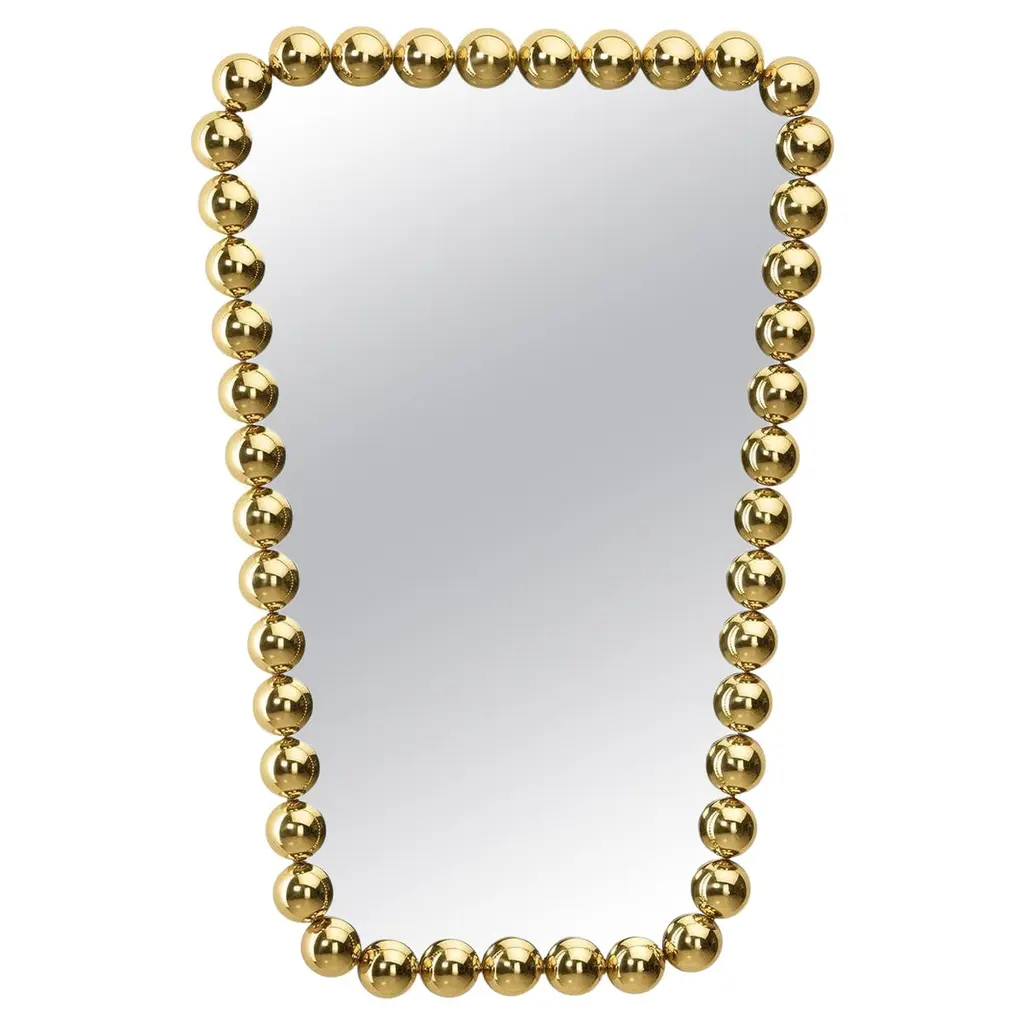 The Gioiello wall mirror features a striking frame composed of polished brass spheres that reflect a multicolor sheen. Its elongated oval shape combines versatile elegance with a playful design inspired by the repetition of a single spherical element. This mirror brings a jewel-like allure to home décor, serving as both a functional piece and an artistic statement.