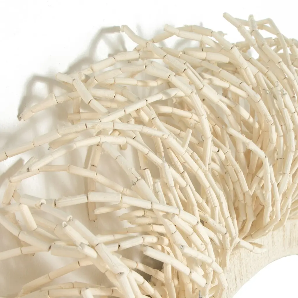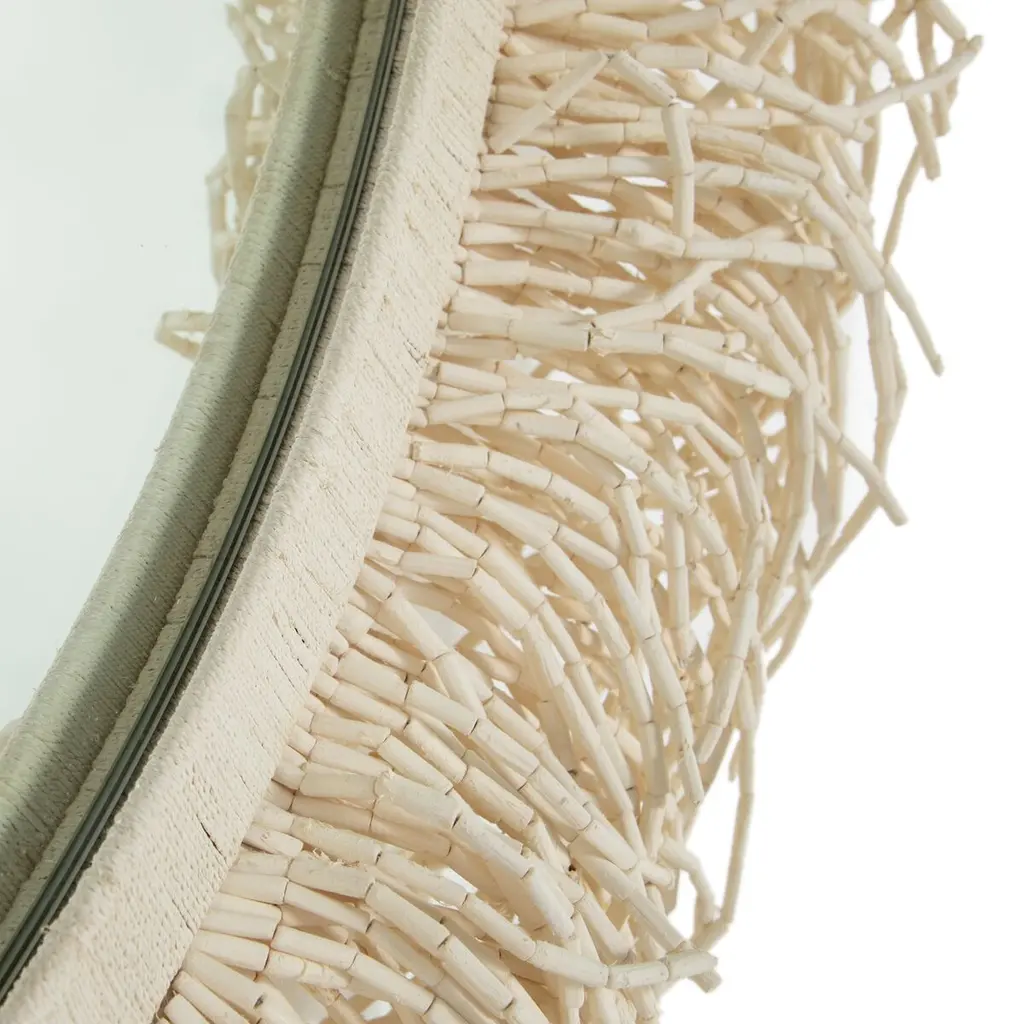 The Giselle Mirror is an exquisite representation of artisan craftsmanship, offering a unique and textured aesthetic to elevate any space. The frame is adorned with small, elongated wooden beads, meticulously hand-beaded and carefully placed onto intricately formed wires. This design creates a stunning loose-strand effect that radiates outward, resembling a soft, organic sunburst. The Giselle Mirror's elegant yet natural design makes it a versatile addition to various interior styles, from bohemian to coastal or transitional. This hand-formed piece is not just a functional mirror but also a work of art that celebrates the beauty of handcrafted details. Whether placed in an entryway, living room, or bedroom, the Giselle Mirror serves as a captivating focal point, combining natural materials with timeless design to enhance any space.