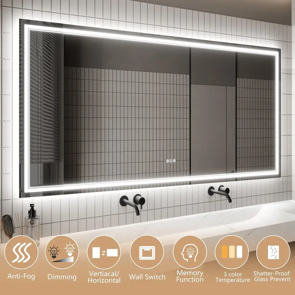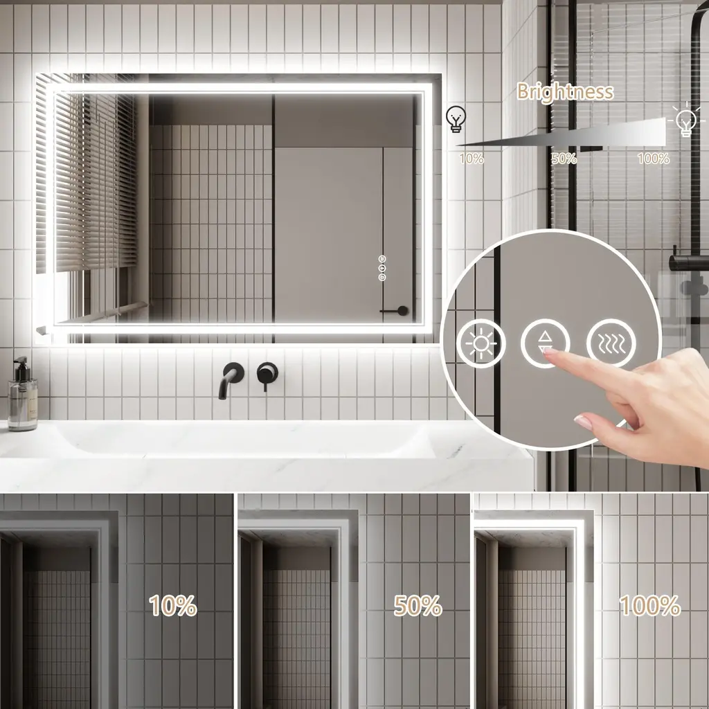 The Led bathroom mirror is modernly designed with frameless frosted edges, not only gently shine on your beautiful face, but also add artful details to your space.【Excellent LED】 :The LED Lighted bathroom mirror uses an industry-leading 90+ CRI LED strip for superior brightness and low consuming energy, LED strip is covered by PVC, LED pixels can't be seen from the sides, and delivers soft and comfortable light. All electrical parts are completely covered, waterproof, and IP44 rated which can be safely used in bathrooms.【Memory Dimming Button】 :Holding a touching light button to adjust your wanted brightness, full range dimmable, the led bathroom mirror will memory your last time use it. Support wall switch control on/off. Single-click the button could change the LED temperature between Warm (3000K)/ Daylight (4500K)/ White light (6400K).【Anti Fog】 : Defogger is separately controlled by a touch switch. Turn it on/off according to your needs. Low power consumption, safe, and energy saving.【Care Instructions】 :Easy-to-clean surface with basic glass cleaner for hassle-free maintenance.【Easy To Install】 :The wall-mounted vanity mirror is designed very practically, and supplied with a plug and a 5feet cord that can be plugged into a standard outlet or cut the plug hardwire to the junction box directly. Come with a mounting hardware kit.