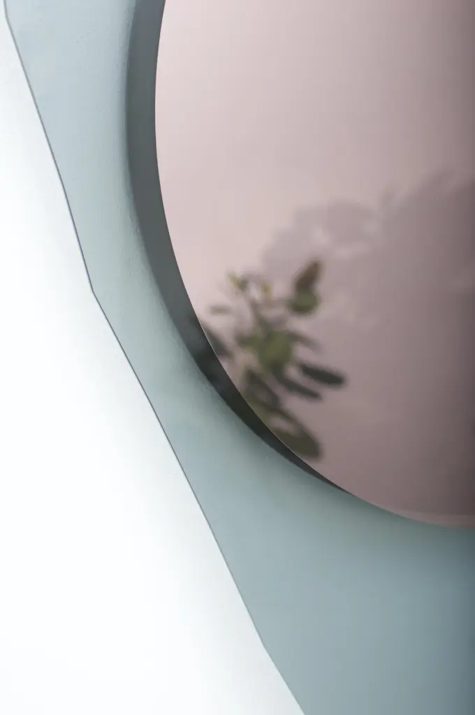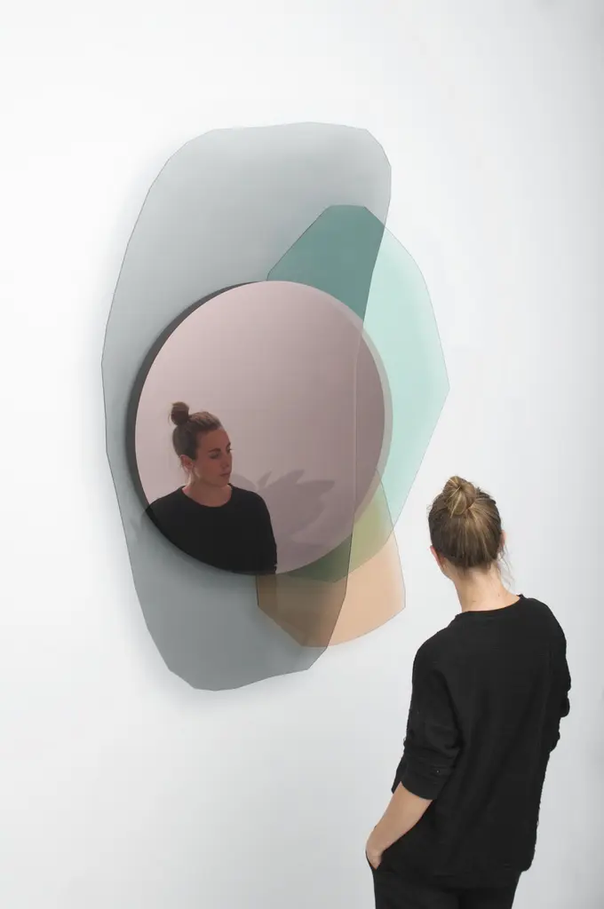 Glass repeated mirror I by OS And OOSDimensions: 108 x 151 x 6.5 cm.Materials: grey, green and rosé glass, champagne metal spacers and bronze mirroring foil.Studio OS ? OOS is design studio for small objects to larger spatial concepts;the studio tries to find the balance between form, material and their relation to the surroundings and the user. For the duo it is the constant search to find the essence in the complex that drives them, taking an initial concept and working it into an object that conveys only what is meant to.The majority of work borders the line of design (in the industrial/ functionality sense) and autonomous objects; best described as contemporary objects derived from concept, yet rationalized to give them purpose. The conclusion of these efforts results in neither a product nor pure artistic expression but a culmination of the both. A product where art=industry.As a result works of OS ? OOS have been commissioned by production partners such as FontanaArte, Please Wait to be Seated and Umbra-Shift, and have their work represented nationally and internationally at prestigious fairs such as Design Miami/Basel, PAD London and Paris, Collective Fair in New York, Fog Fair San Francisco, Design Days Dubai and Collectible in Brussels to mention a few.Their work has also been included at museums such as the Van Abbe Museum in Eindhoven, Mac’s Grand-Hornu in Belgium, The Design Museum in London and Villa Noailles in Hyeres, as well as having work acquired by the Vitra Design Museum for their permanent collection.Lately the studio also moved towards interior design completing recently the flagship store for Ace & Tate._____Oskar Peet (NL/CAN) and Sophie Mensen (NL) are both graduates of the Design Academy Eindhoven (2009), and started the firm OS ? OOS in the autumn off 2011. Both live and work currently in the city of Eindhoven, the Netherlands. They also occasionally teach as guest teachers at the Design Academy Eindhoven and the Academy of Architecture in Amsterdam.