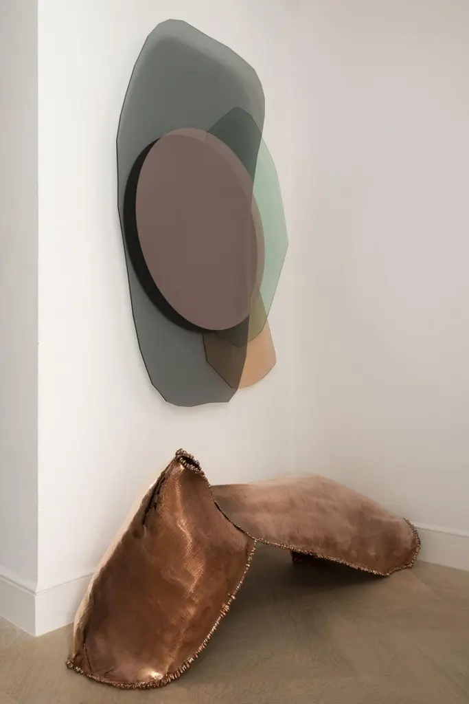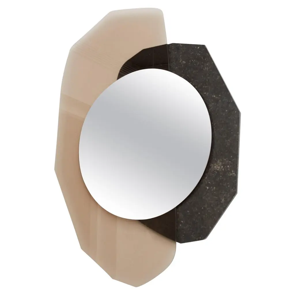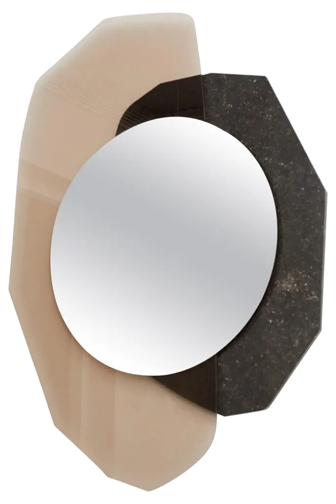 Glass repeated mirror II by OS And OOSDimensions: 112 x 152 x 5.5 cmMaterials: Rosé glass, nero assoluto marble, champagne metal spacers and bronze mirroring foilStudio OS and OOS is design studio for small objects to larger spatial concepts;the studio tries to find the balance between form, material and their relation to the surroundings and the user. For the duo it is the constant search to find the essence in the complex that drives them, taking an initial concept and working it into an object that conveys only what is meant to.The majority of work borders the line of design (in the industrial/ functionality sense) and autonomous objects; best described as contemporary objects derived from concept, yet rationalized to give them purpose. The conclusion of these efforts results in neither a product nor pure artistic expression but a culmination of the both. A product where art=industry.As a result works of OS and OOS have been commissioned by production partners such as FontanaArte, Please Wait to be Seated and Umbra-Shift, and have their work represented nationally and internationally at prestigious fairs such as Design Miami/Basel, PAD London and Paris, Collective Fair in New York, Fog Fair San Francisco, Design Days Dubai and Collectible in Brussels to mention a few.Their work has also been included at museums such as the Van Abbe Museum in Eindhoven, Mac’s Grand-Hornu in Belgium, The Design Museum in London and Villa Noailles in Hyeres, as well as having work acquired by the Vitra Design Museum for their permanent collection.Lately the studio also moved towards interior design completing recently the flagship store for Ace & Tate.Oskar Peet (NL/CAN) and Sophie Mensen (NL) are both graduates of the Design Academy Eindhoven (2009), and started the firm OS and OOS in the autumn off 2011. Both live and work currently in the city of Eindhoven, the Netherlands. They also occasionally teach as guest teachers at the Design Academy Eindhoven and the Academy of Architecture in Amsterdam.