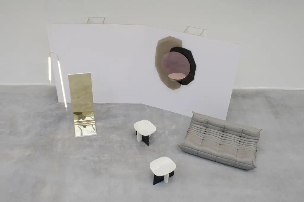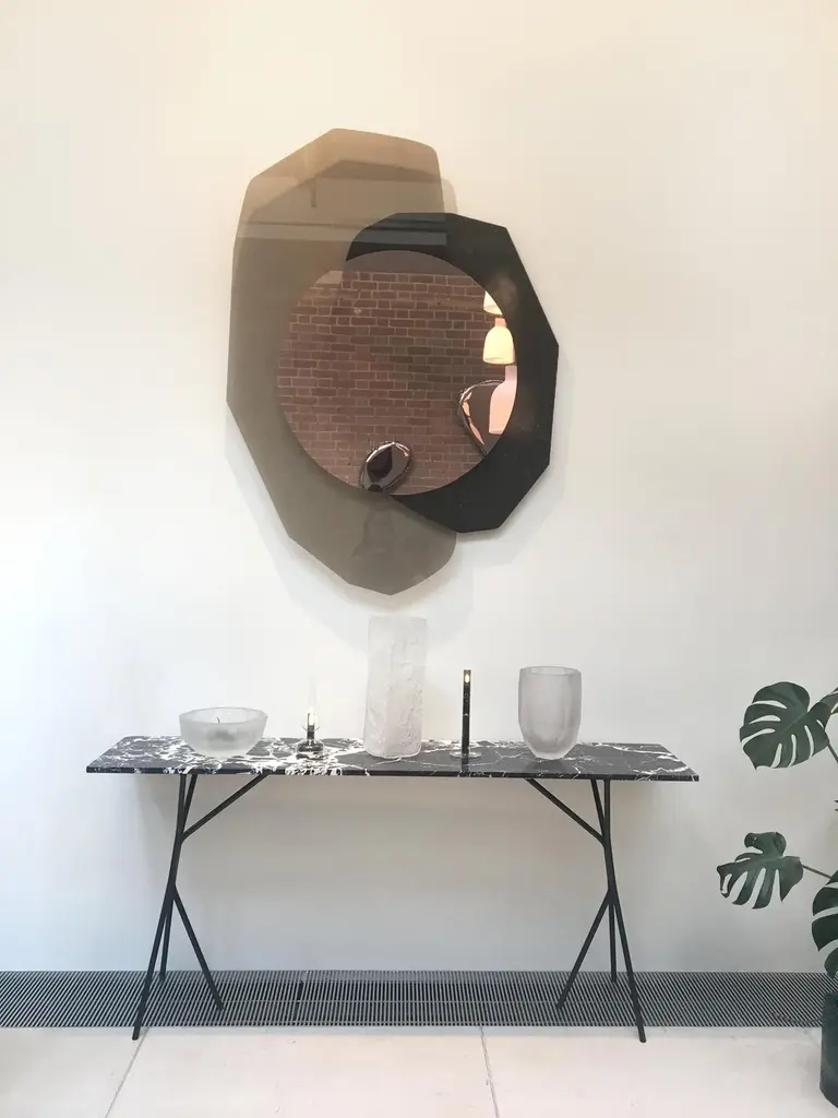 Glass repeated mirror II, by OS and OOSDimensions: 112 x 152 x 5.5 cmMaterials: rosé glass, nero assoluto marble, champagne metal spacers and bronze mirroring foilStudio OS and OOS is design studio for small objects to larger spatial concepts;the studio tries to find the balance between form, material and their relation to the surroundings and the user. For the duo it is the constant search to find the essence in the complex that drives them, taking an initial concept and working it into an object that conveys only what is meant to.The majority of work borders the line of design (in the industrial/ functionality sense) and autonomous objects; best described as contemporary objects derived from concept, yet rationalized to give them purpose. The conclusion of these efforts results in neither a product nor pure artistic expression but a culmination of the both. A product where art=industry.As a result works of OS and OOS have been commissioned by production partners such as FontanaArte, Please Wait to be Seated and Umbra-Shift, and have their work represented nationally and internationally at prestigious fairs such as Design Miami/Basel, PAD London and Paris, Collective Fair in New York, Fog Fair San Francisco, Design Days Dubai and Collectible in Brussels to mention a few.Their work has also been included at museums such as the Van Abbe Museum in Eindhoven, Mac’s Grand-Hornu in Belgium, The Design Museum in London and Villa Noailles in Hyeres, as well as having work acquired by the Vitra Design Museum for their permanent collection.Lately the studio also moved towards interior design completing recently the flagship store for Ace & Tate.Oskar Peet (NL/CAN) and Sophie Mensen (NL) are both graduates of the Design Academy Eindhoven (2009), and started the firm OS and OOS in the autumn off 2011. Both live and work currently in the city of Eindhoven, the Netherlands. They also occasionally teach as guest teachers at the Design Academy Eindhoven and the Academy of Architecture in Amsterdam.