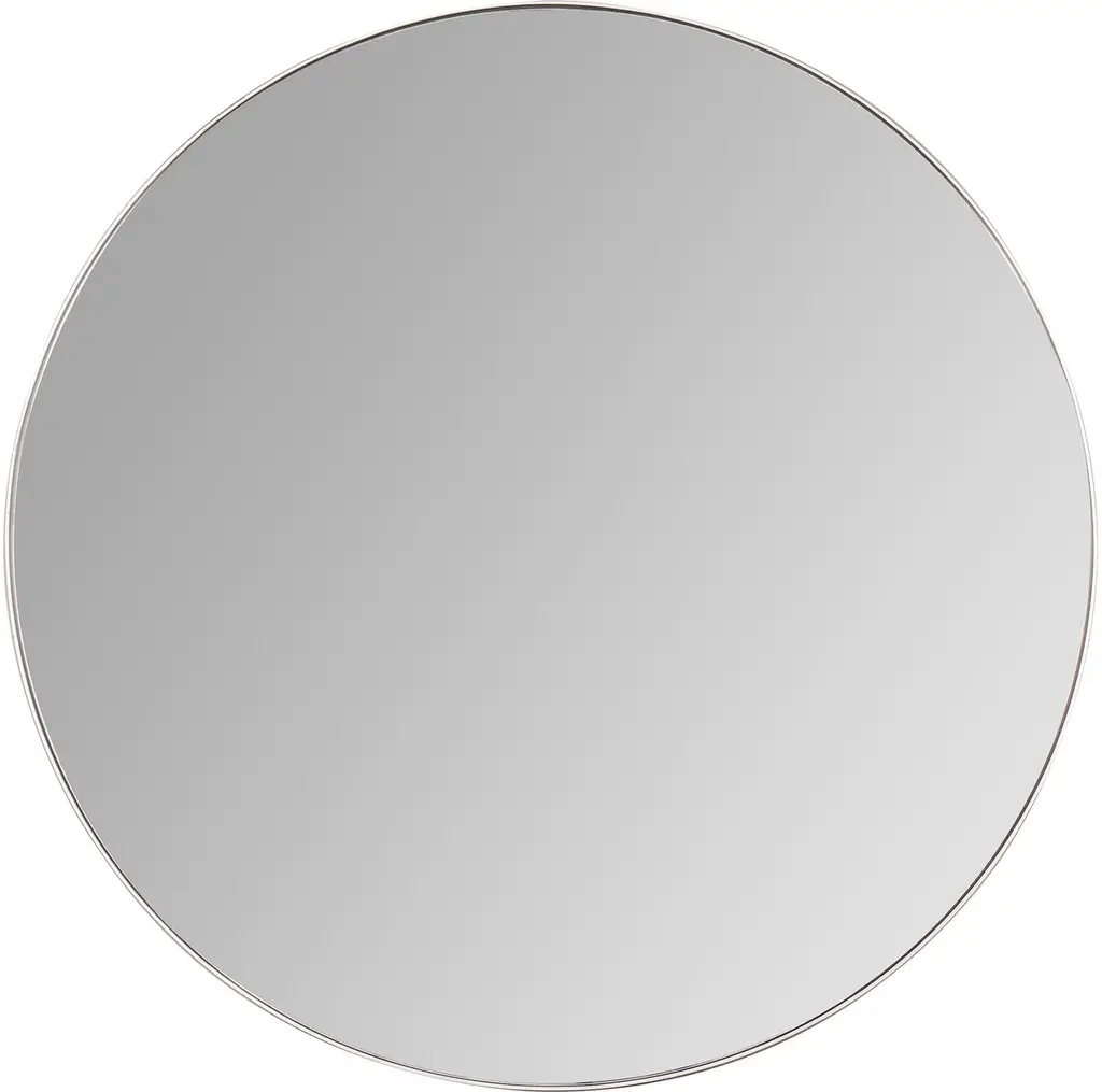 The circular curves of this modern wall mirror are simple and chic. A low-profile metal frame mimics the inner arc of the beveled looking glass. Finished in raw iron for a subtle metallic shimmer, the spherical shape suits classic and contemporary spaces alike.