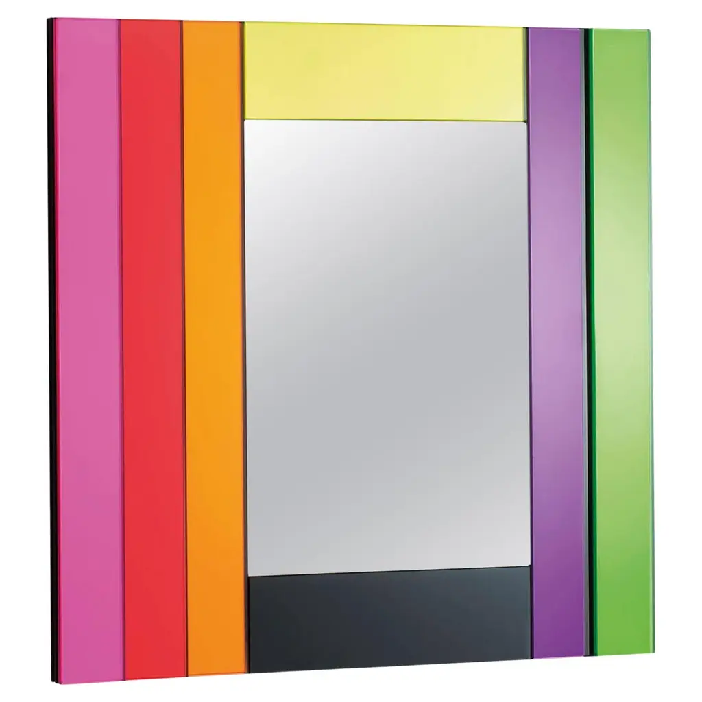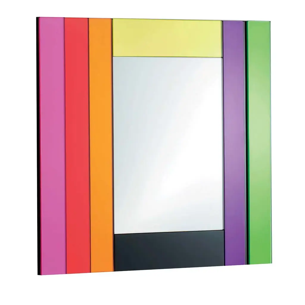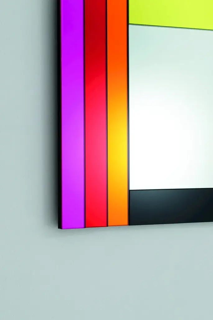 Gli Specchi di Dioniso is a collection of 6 wall mirrors in different shapes and size characterizes by polychromatic frames composed of elements in laminated coloured mirror, coloured laminated glass and lacquered glass.Attention, to avoid that the cleaning detergent seeps between the mirror slabs causing the oxidation of this one, it is recommended not to spray it directly on the mirror but to dampen the cloth used.