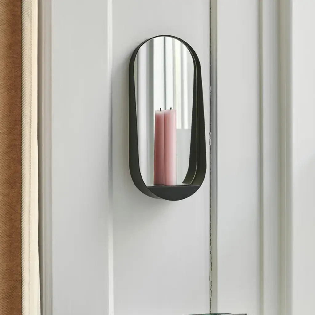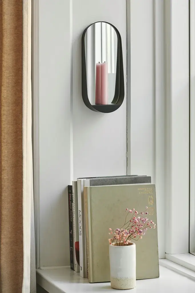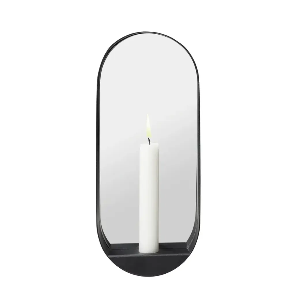 GLIM is a wall hanged candle mirror designed by Böttcher & Kayser for Gejst. The mirror amplifies the light and is a function inspired by old lanterns. GLIM is a decorative and contemporary candle holder to fix at the wall. Made of painted steel and mirror glass, crooked cut from the side so the candle is free to burn. It captures the Danish atmosphere of “hygge” perfectly while giving a cozy effect mirroring the candlelight. Perfect to implement in a picture wall, to install alone or in a cluster in the Livingroom, entrance, office or bedroom.
