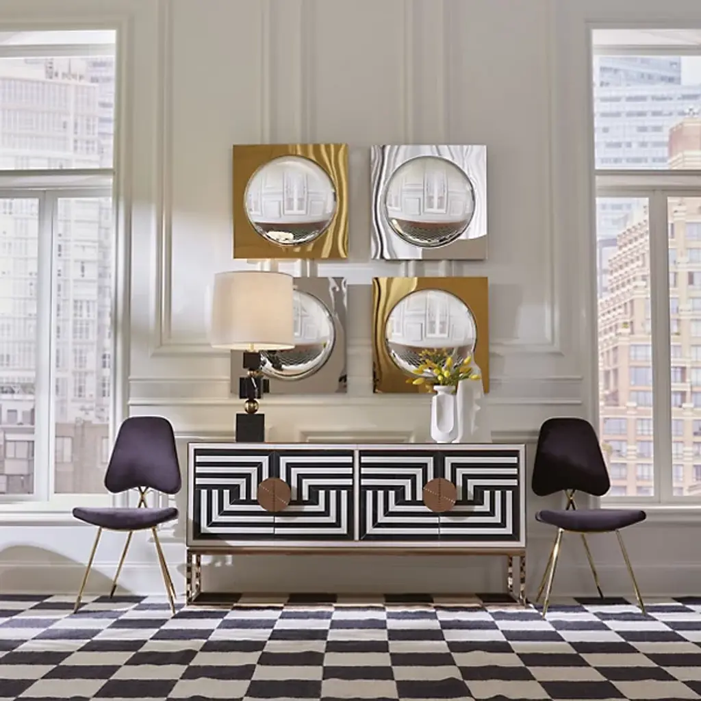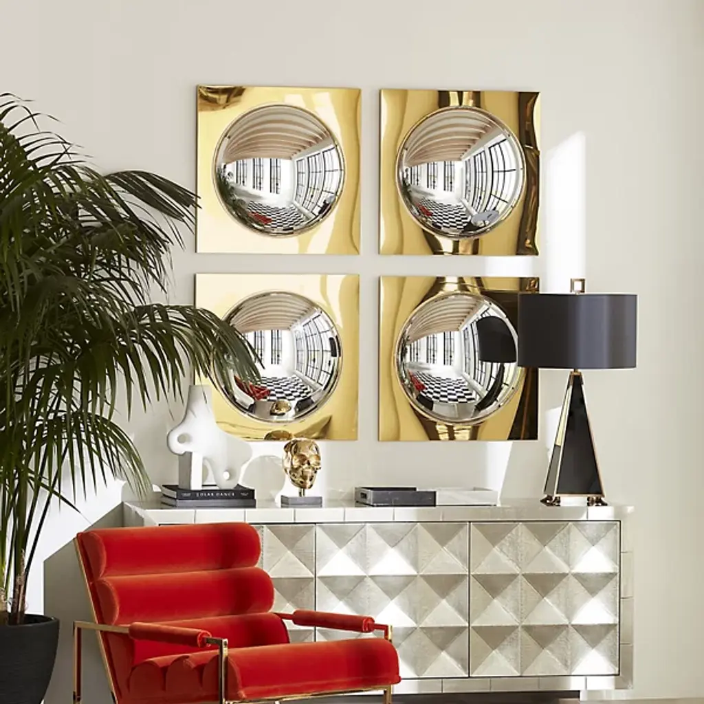 See your environment in a new way with the Globo Convex Mirror by Jonathan Adler. This elegant mirror brings a mid-century modern aesthetic to your room or hallway. A square frame neatly surrounds this circular mirror. This mirror's convex style playfully transforms the images it reflects, changing depth perception. Place this mirror above your console and give your space an aura of creativity. Use this piece in a group for a statement-making visual in larger areas.