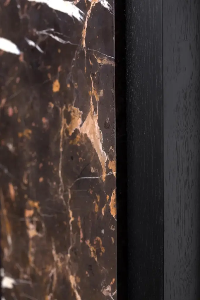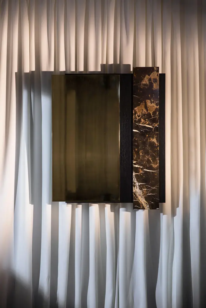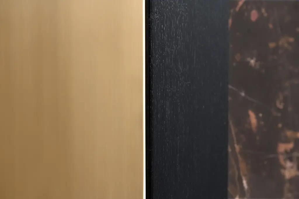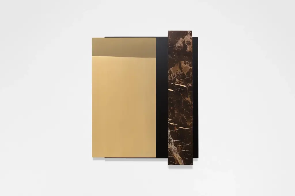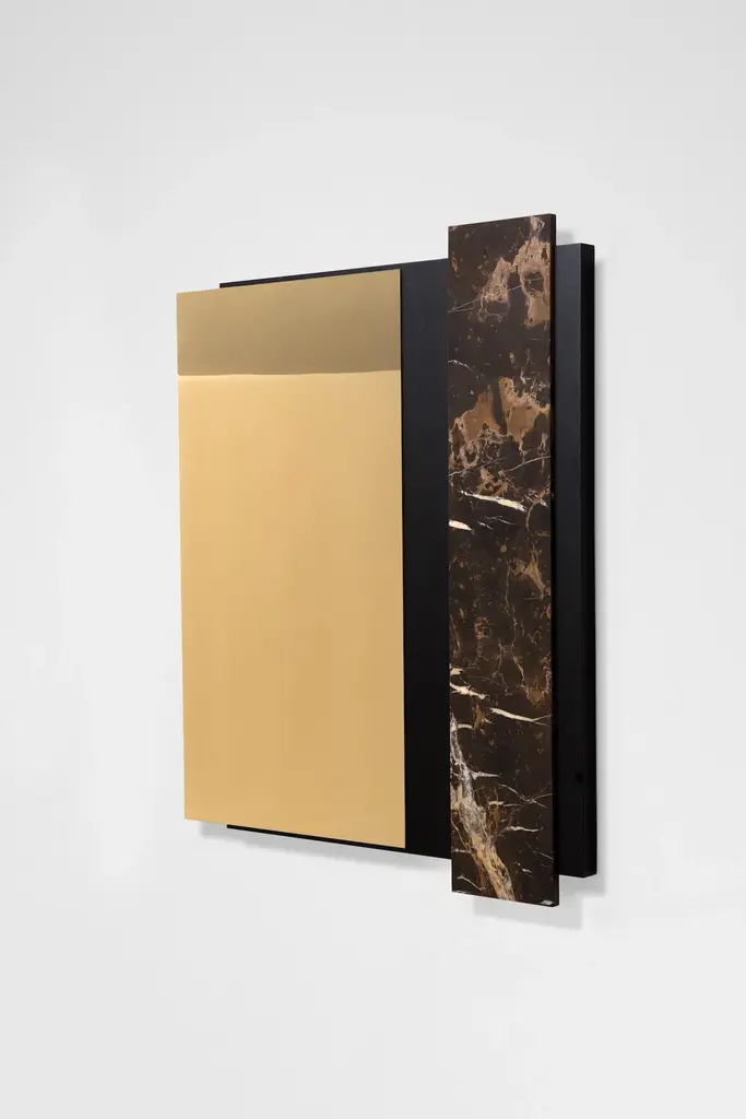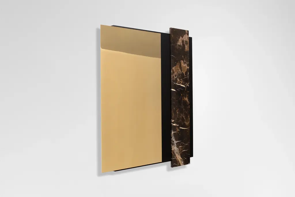 The Glory unveils and distorts its beholder’s most significant other in a single moment. This transcendence of reality naturally decreases with time as the refraction grows blurrier and weaker. The glorifying brass sheet is kept in place by a black oaken base and antagonized by a vertical marble piece. Designed in 2017, this piece is made of black stained oak, Michelangelo marble, and mirror-polished brass and weighs 32.3 kg.