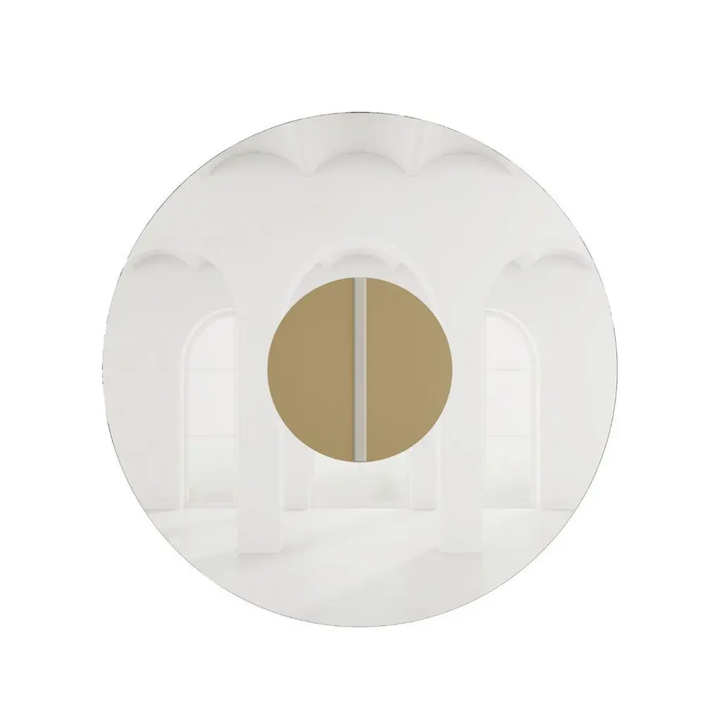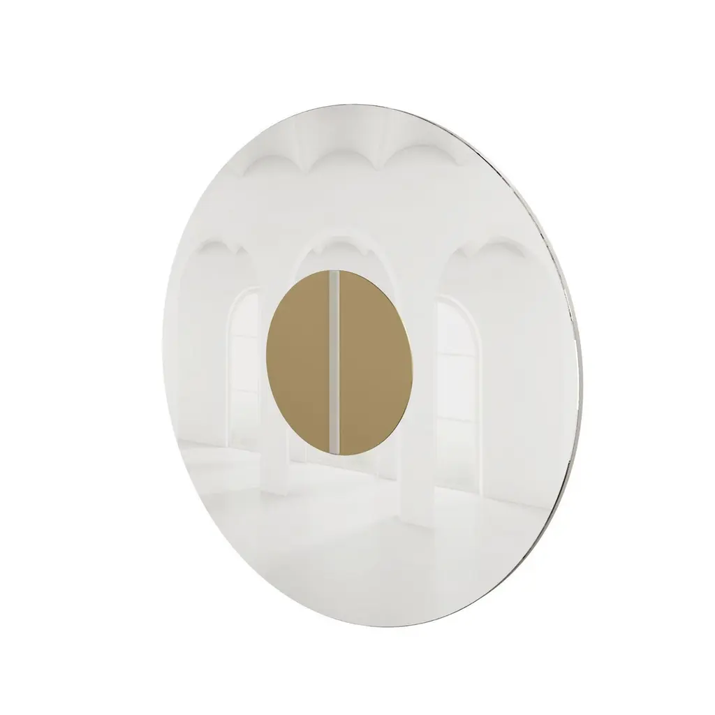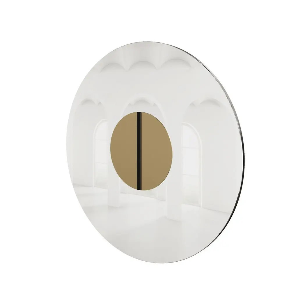 Elevate your interior with the GOA Mirror, a striking fusion of contemporary design and organic sophistication. This round wall mirror features a central circular detail finished in antique brass color and wood veneer, creating a warm, tactile contrast against the sleek natural mirror surface.A minimalist vertical black inlay anchors the composition, adding a subtle sculptural tension that draws the eye. The GOA Mirror’s bold geometric balance and premium materials make it an ideal statement piece for modern, minimalist, or art-inspired interiors.Primary image: Shown in Natural Mirror, Details Color Antique Brass & Wood Veneer VE08 Satin Open Pore