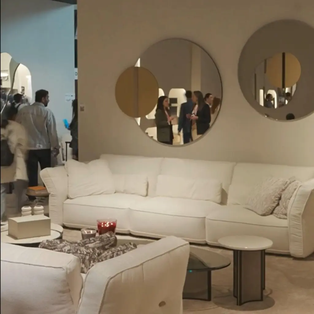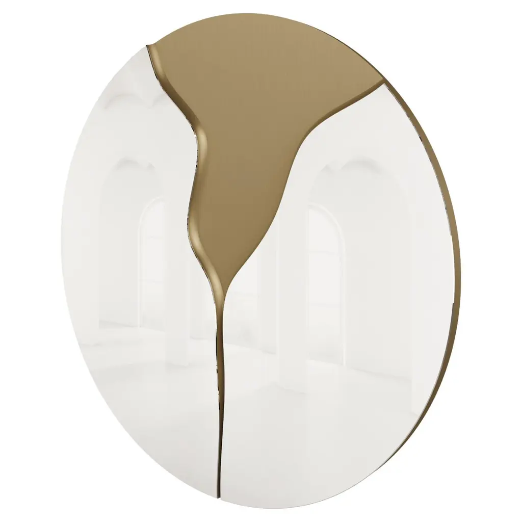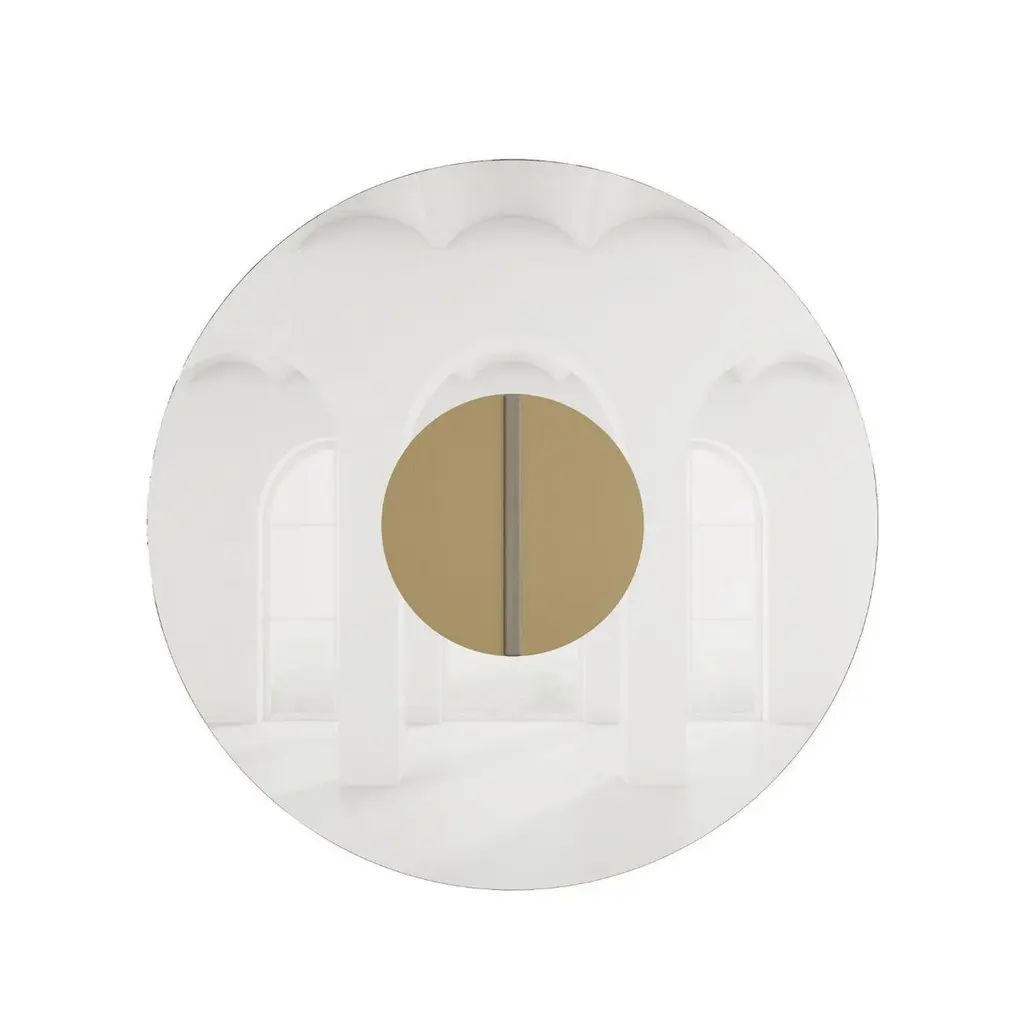 Elevate your interior with the GOA Mirror, a striking fusion of contemporary design and organic sophistication. This round wall mirror features a central circular detail finished in antique brass color and wood veneer, creating a warm, tactile contrast against the sleek natural mirror surface.A minimalist vertical black inlay anchors the composition, adding a subtle sculptural tension that draws the eye. The GOA Mirror’s bold geometric balance and premium materials make it an ideal statement piece for modern, minimalist, or art-inspired interiors.Primary image: Shown in Natural Mirror, Details Color Antique Brass & Wood Veneer VE08 Satin Open Pore