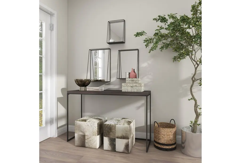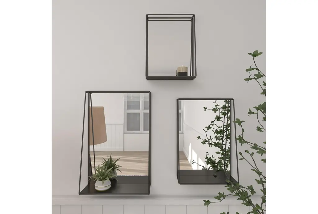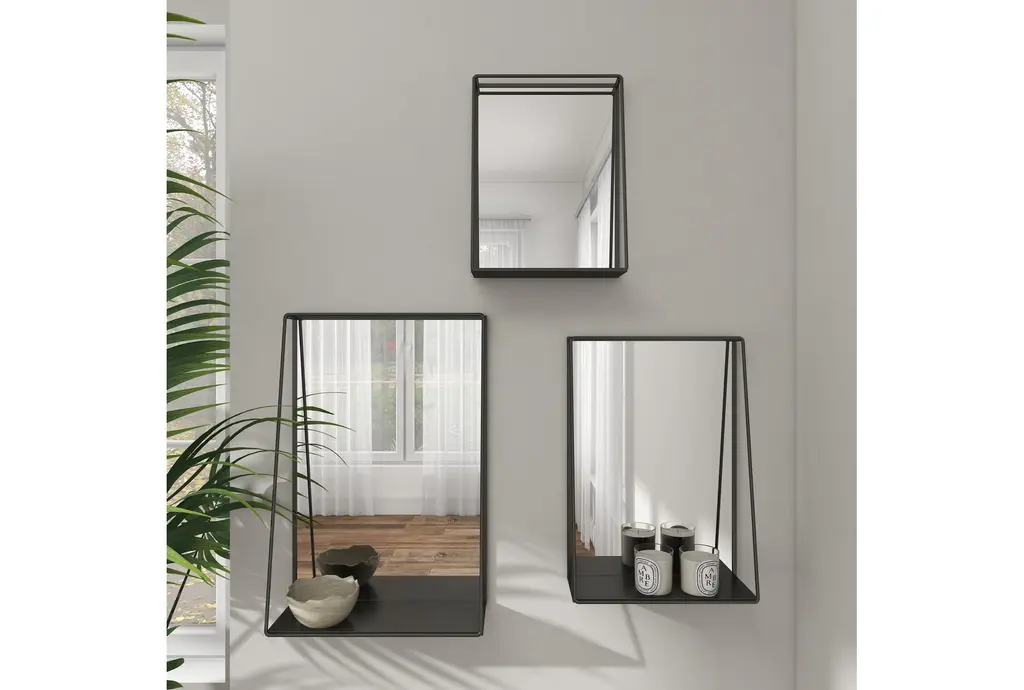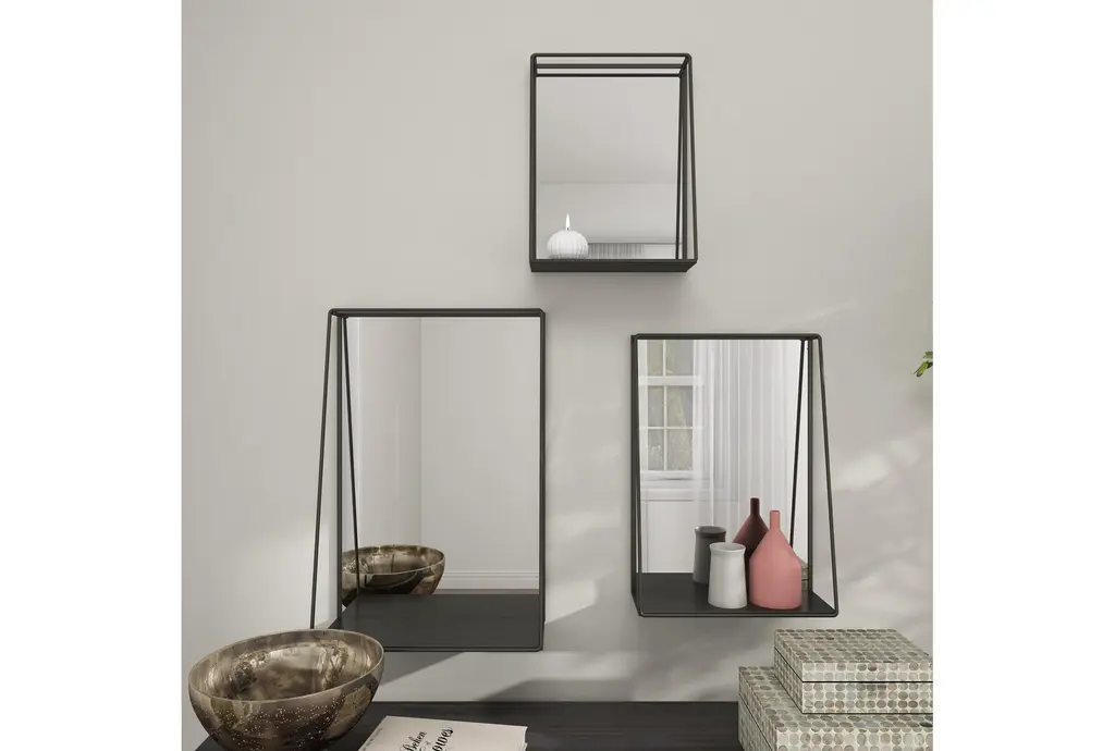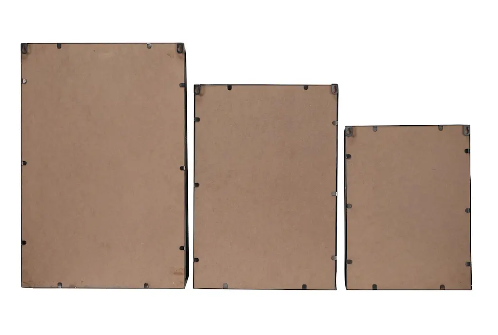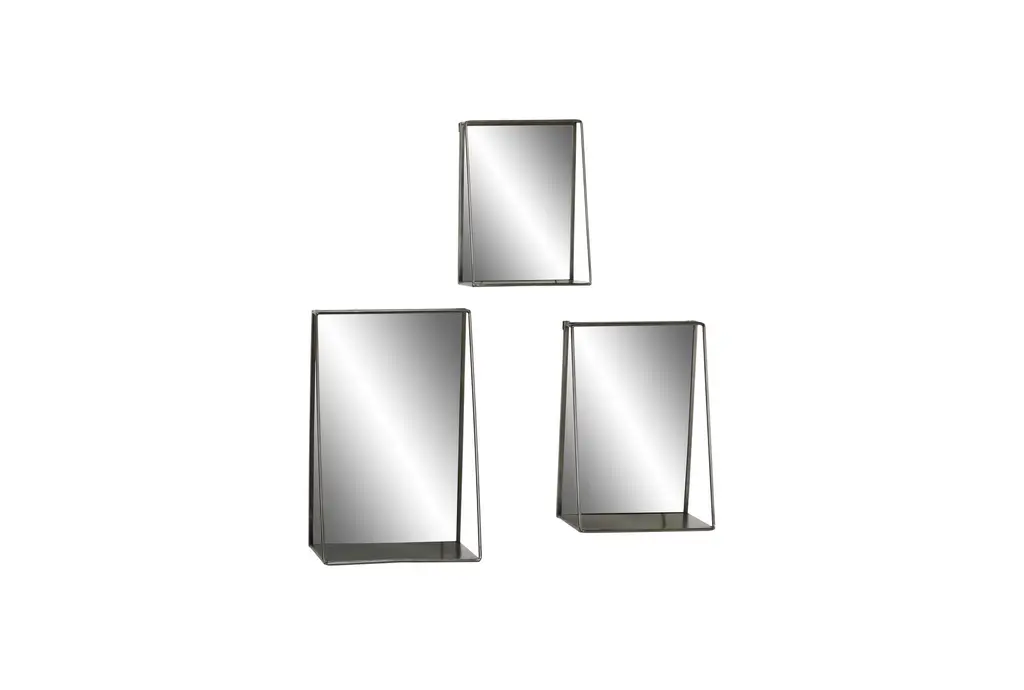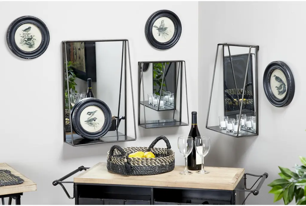Complements plain and neutral-toned walls to flaunt geometric shape. This item ships in 1 carton. Easy to hang by hardware in back; nails and screws are not included. Suitable for indoor use only. This spectacular set of iron wall mirrors come in a set of 3. Industrial style.