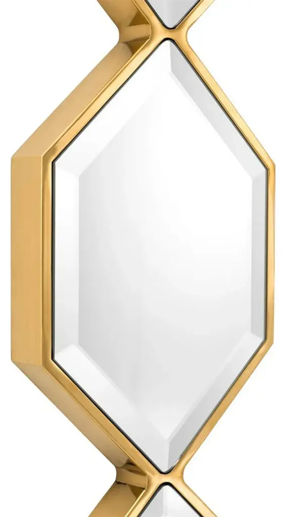 Enhance the aesthetic of your living space with the eye-catching Saronno Mirror. Featuring three hexagonal beveled mirrors in a sleek gold-finished frame, it will add visual appeal to your interior. This gold hexagonal trio mirror from Eichholtz reflects class, elegance and makes a bold statement.W10 x D2 x H44 in | Weight 15lbsMaterials | Stainless SteelFinish | Gold finish