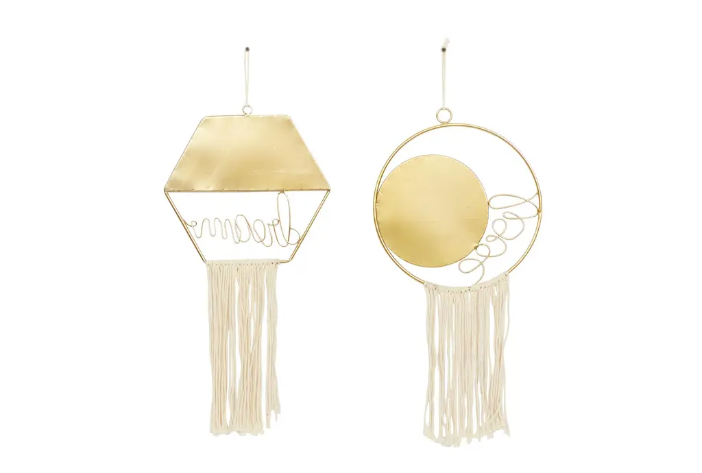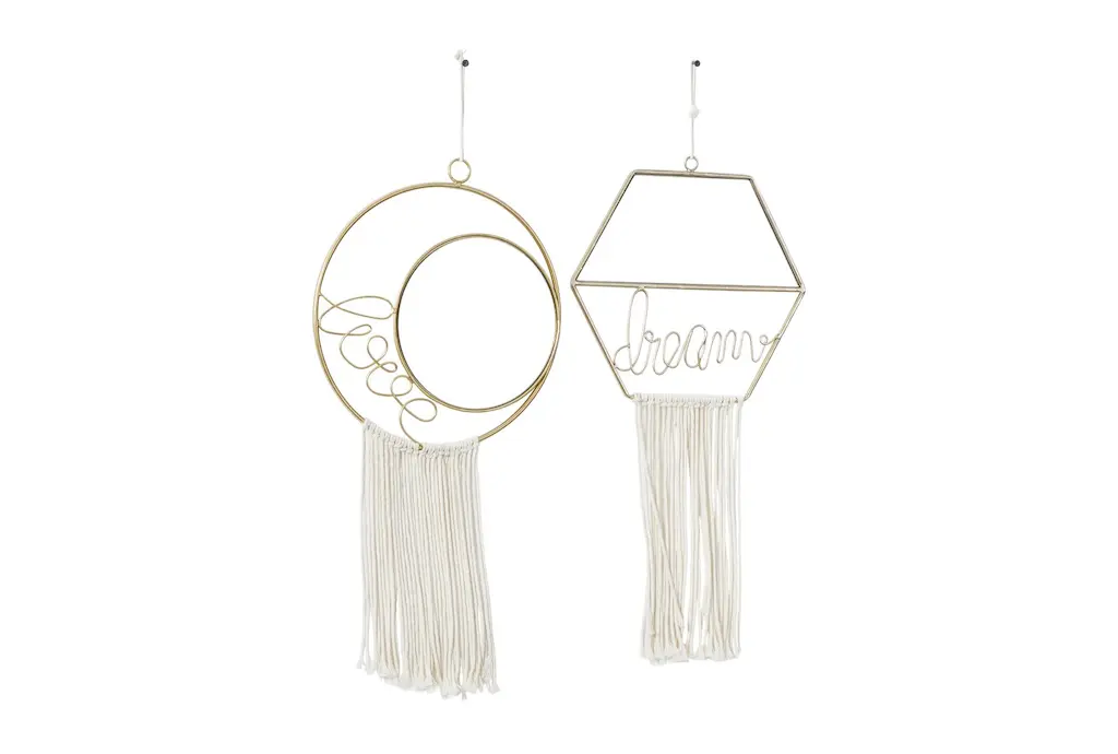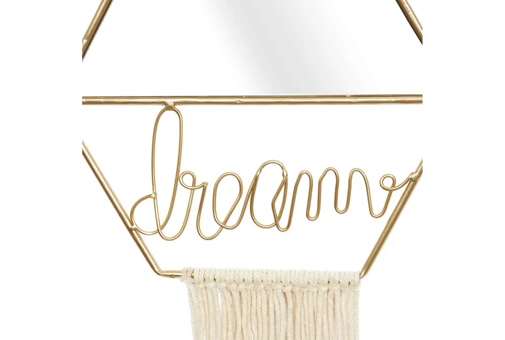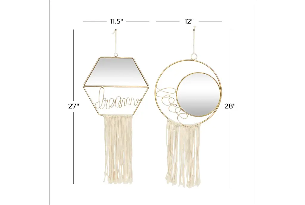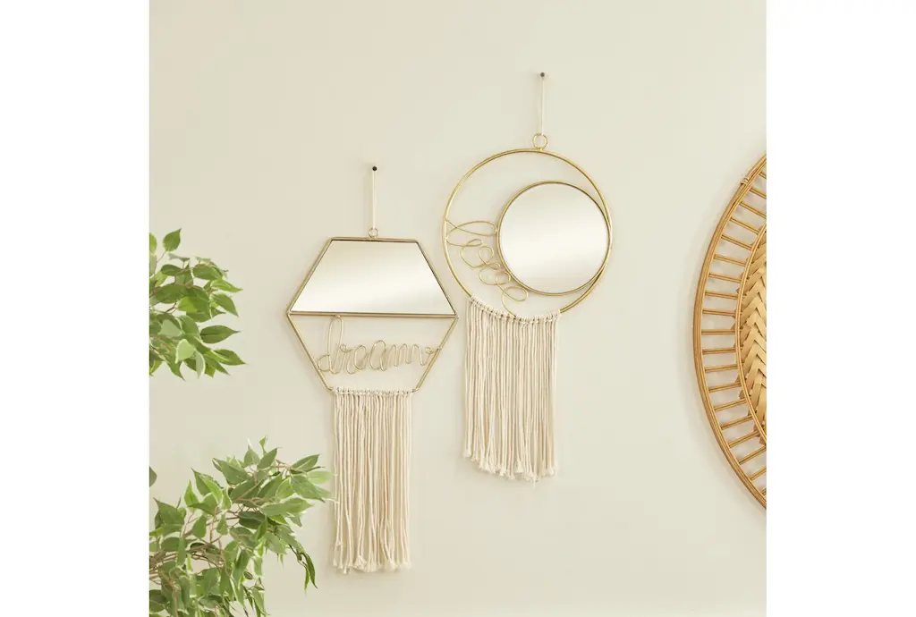 These decorative wall mirrors are great accent pieces for light-toned backgrounds with a minimalistic or bohemian-inspired interior design. This item ships in 1 carton. Due to the handmade nature of this item, no two will be alike, there will be slight differences in shape, size, and color. Can be hung vertically using the cotton cord; nails and screws not included. Suitable for indoor use only. This gold colored entryway mirror comes as a set of 2. Contemporary style. Inspirational vibes from the words "DREAM" and "LOVE" on the frame.