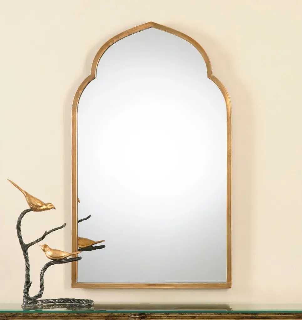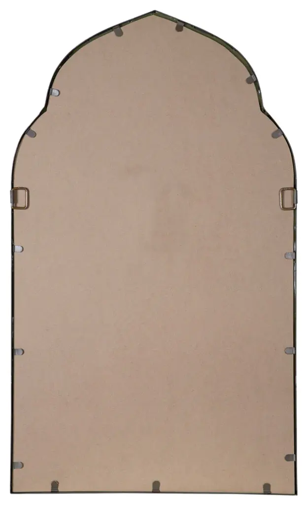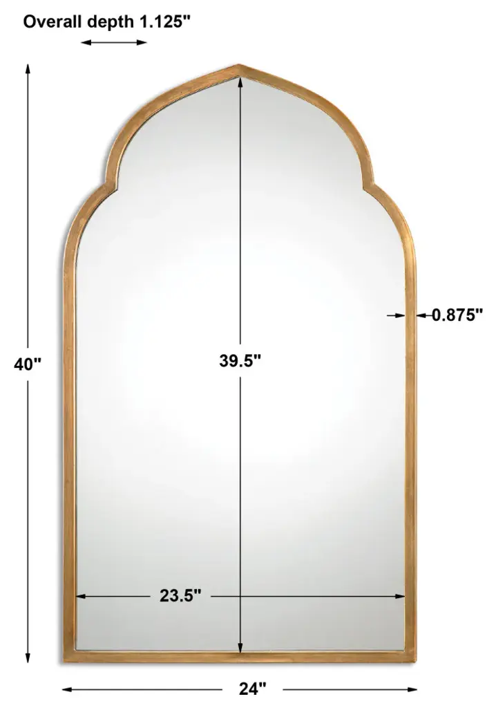Hand Forged Metal Frame Finished In Plated, Antiqued Gold. Item: Gold Arch MirrorsDesign: Metal Frame Finished In A Plated Antiqued Gold. Size: 40'''' H X 24'''' W X 1. 125'''' Deep. Weight: 21lbs. Glass Measurements: 39. 5'''' H X 23. 5'''' W X 0. 187'''' deep. May be hung vertically or horizontally. Materials: Premium METALHeirloom Quality - Expertly hand crafted and hand finishedDue to the hand crafted nature of this piece, each piece may have subtle differences. The mirror has a state of the art back coating that makes it resistant to oxidation and discoloration. Properly weighted hanging hardware is attached.