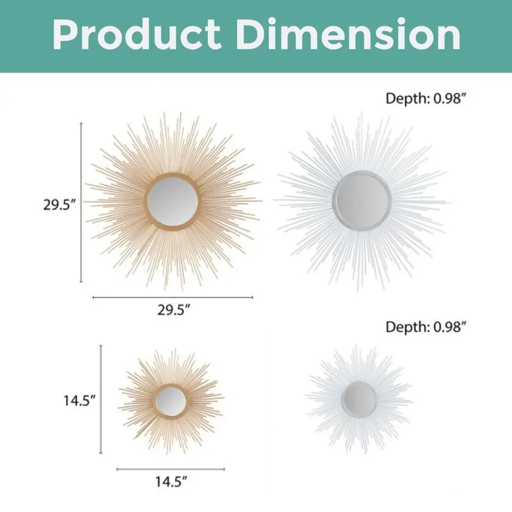 Product Type: General ItemMain Color: GoldMain Material: CottonIron: 80%Mirror: 10%MDF: 10%29.5" DiaOverall:29.5"Dia x 0.98"DMirror:8"DiaAdd a modern and glamorous touch to your space with our Madison Park Sunburst Mirror. A stylized iron frame is featured in a sphere design creating beautiful dimension, while the gold foil adds a rich sheen and luster. The keyhole hanger feature on the reverse of the mirror allows for effortless hanging on your wall. Incorporate this wall mirror into your decor, for the perfect combination of chic luxe and metallic flair. Mirror is sold as a single piece and does not come as a set; for the complete look purchase other size for a stylized cluster or hang individually as a focus piece. The larger piece measures 29.5"with 8"D mirror size, while the smaller piece measures 14.5" with 3.875""D mirror size. Handle with care; Gently wipe clean with a damp clothItem is sold as single piece; available in two sizes: dia. 29.5"" (mirror dia. 8") and dia. 14.5" (mirror dia. 3.9")Round burst glass and iron wall decor mirrorStylized burst metal frameFoil finish adds rich sheen and lusterHanger feature on reverse allows for easy hangingHandle with care; gently wipe clean with a damp cloth