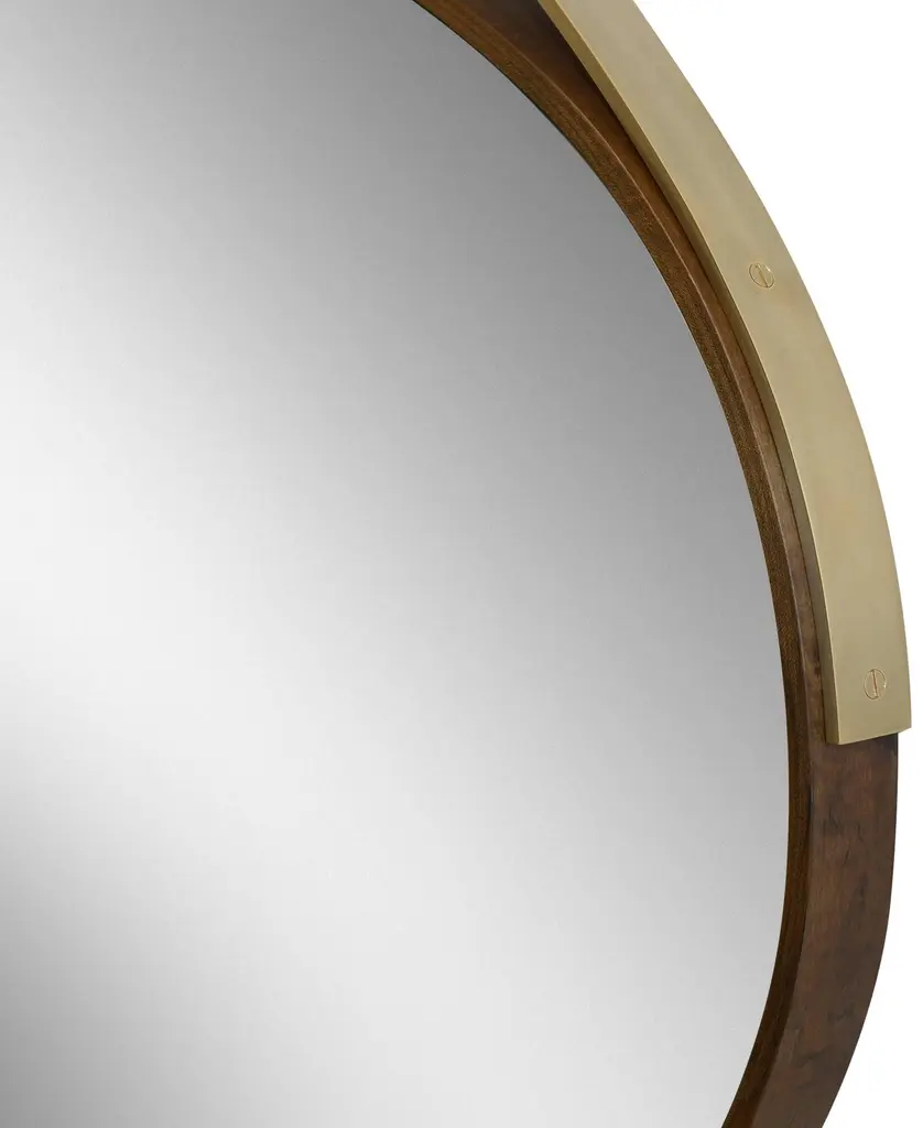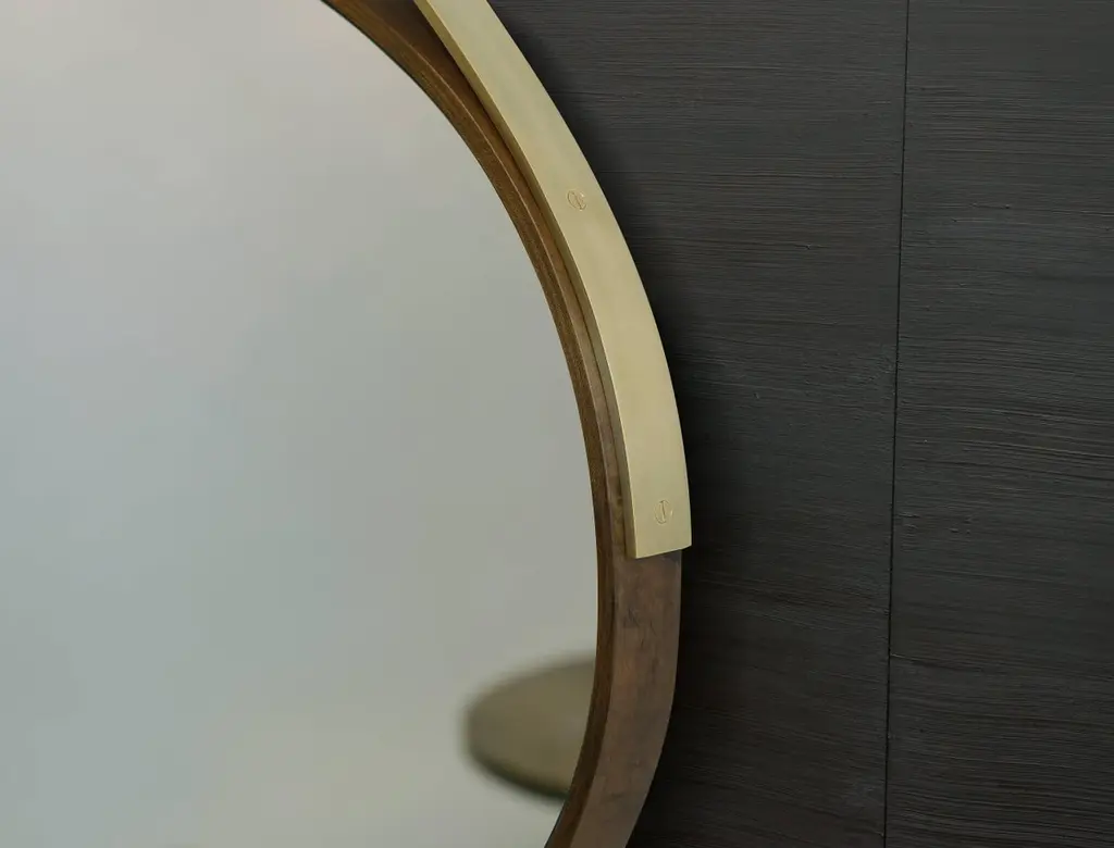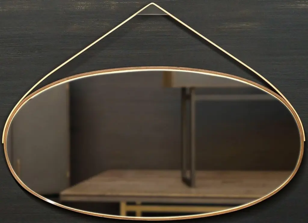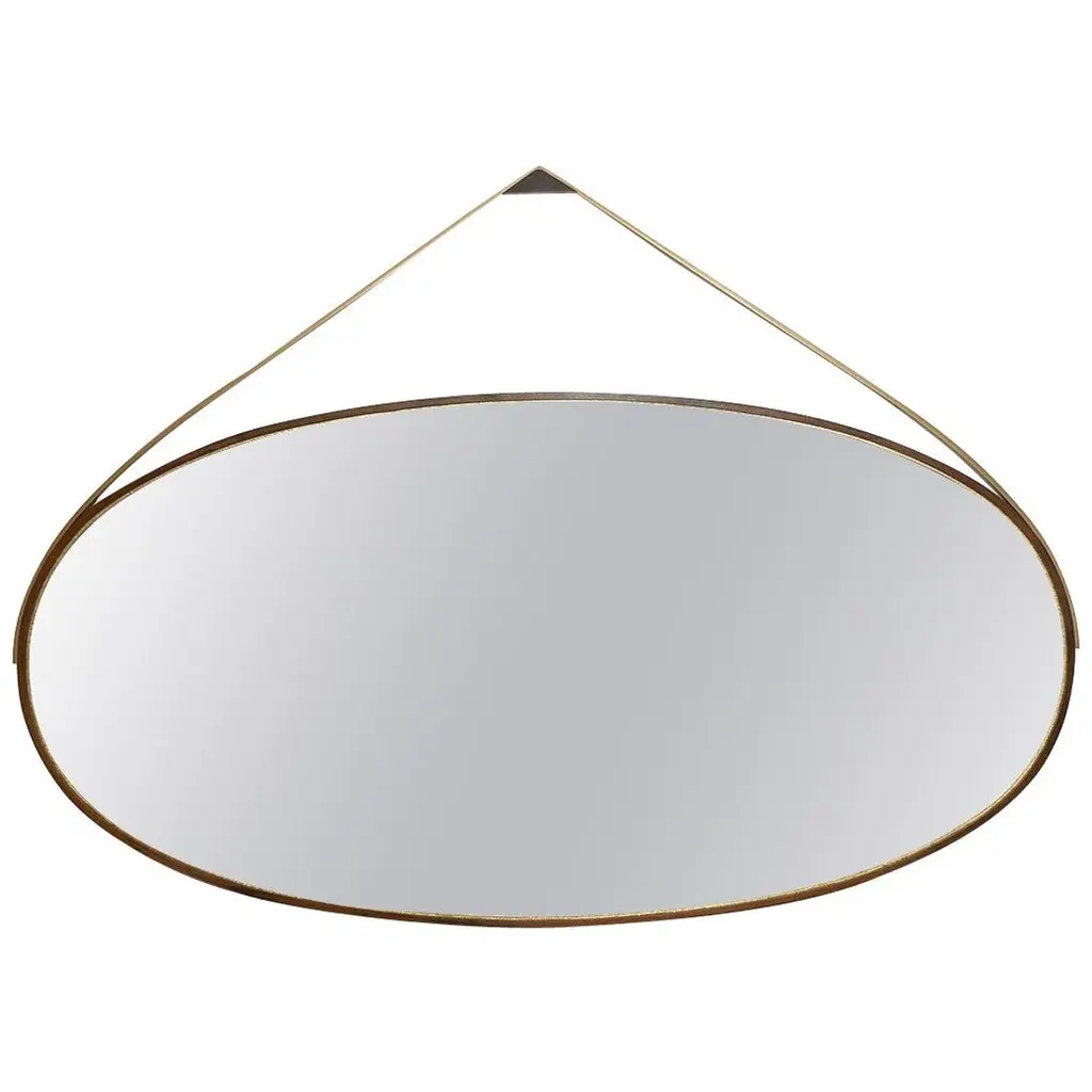 A band of oxidized ambrosia maple envelops our Gotham Oval mirror, a timeless piece that can marry with nearly any interior design (no surprise it’s our most popular style). The mirror itself lies atop gold leaf—skillfully placed by artisan makers. When suspended from its blackened bronze hanging bracket, and slick bronze strap, it’s more art than object.Finishes Shown: Oxidized Ambrosia Maple Frame / Gold Leaf Inset / Burnished Bronze Hanging Strap / Blackened Bronze Hanging BracketDimensions:W 49 in. / D 1.5 in. / H 36 in.W 61 in. / D 1.5 in. / H 41 in.Custom sizes and finishes available.Lead time varies depending upon in-stock availability - please inquire.