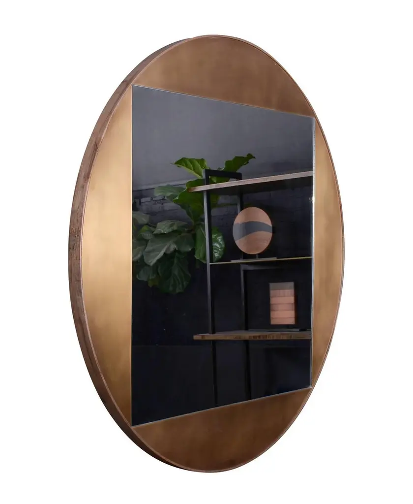 Part of the elegant Gotham collection, the round mirror is composed of patinated bronze and oxidized ambrosia maple. The juxtaposition of shapes, both sharp and curved, lends balance and sophistication to this piece. Regular lead time 10-12 weeks.Materials: Oxidized ambrosia maple, bronzeStandard dimensions: D 48 in.Other available materials: Brass, zinc, copper, aluminium and steelCustom sizing and finishes available.