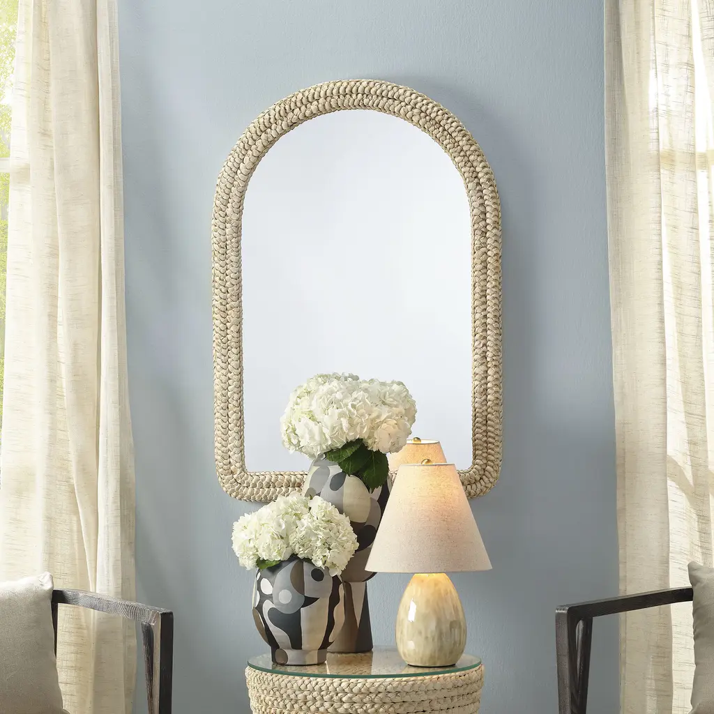 Elegantly wrapped with two rows of braided corn husk, this arched mirror adds a touch of lightness to any casually refined décor. The unfinished husk showcases a variety of natural colors, introducing unexpected depth to its neutral palette. The result is a beautifully refined tropical accent that is simply lovely.
