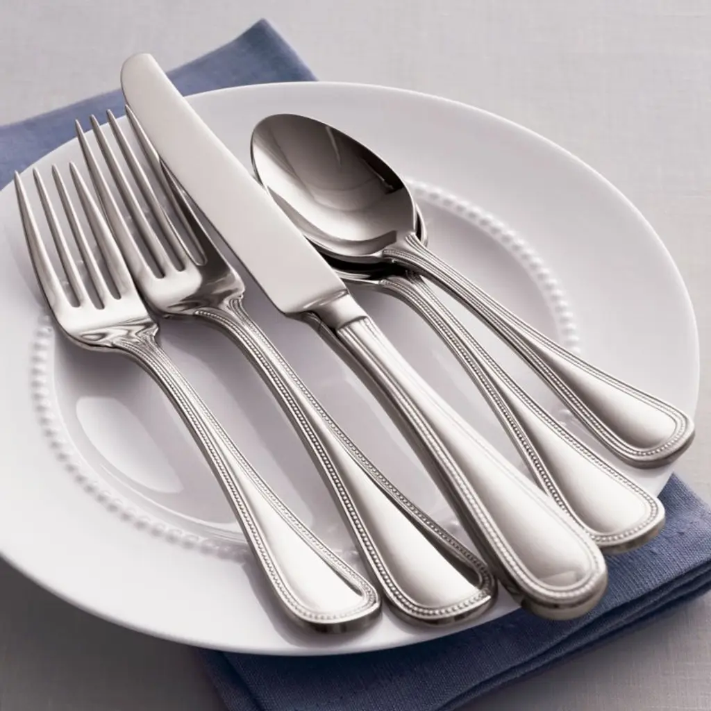 In the gracious tradition of our Grand Hotel flatware, this new version is scaled up and even more substantial in weight. The classic design features intricate beadwork accentuated with a subtle dome in the center of the handle.Includes 4 5-piece placesettings.