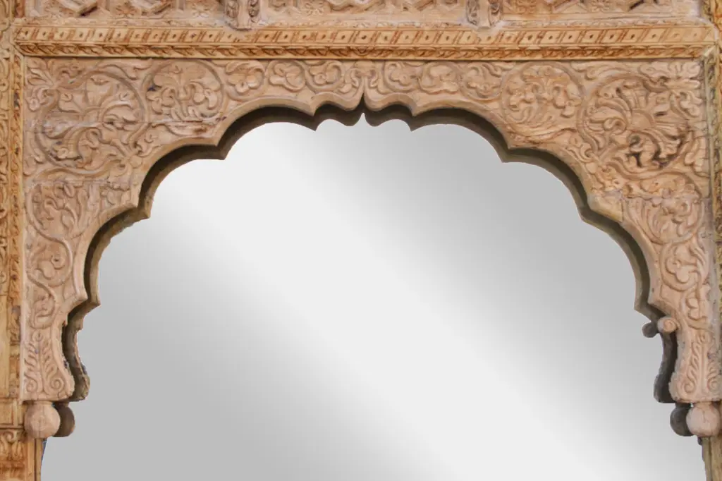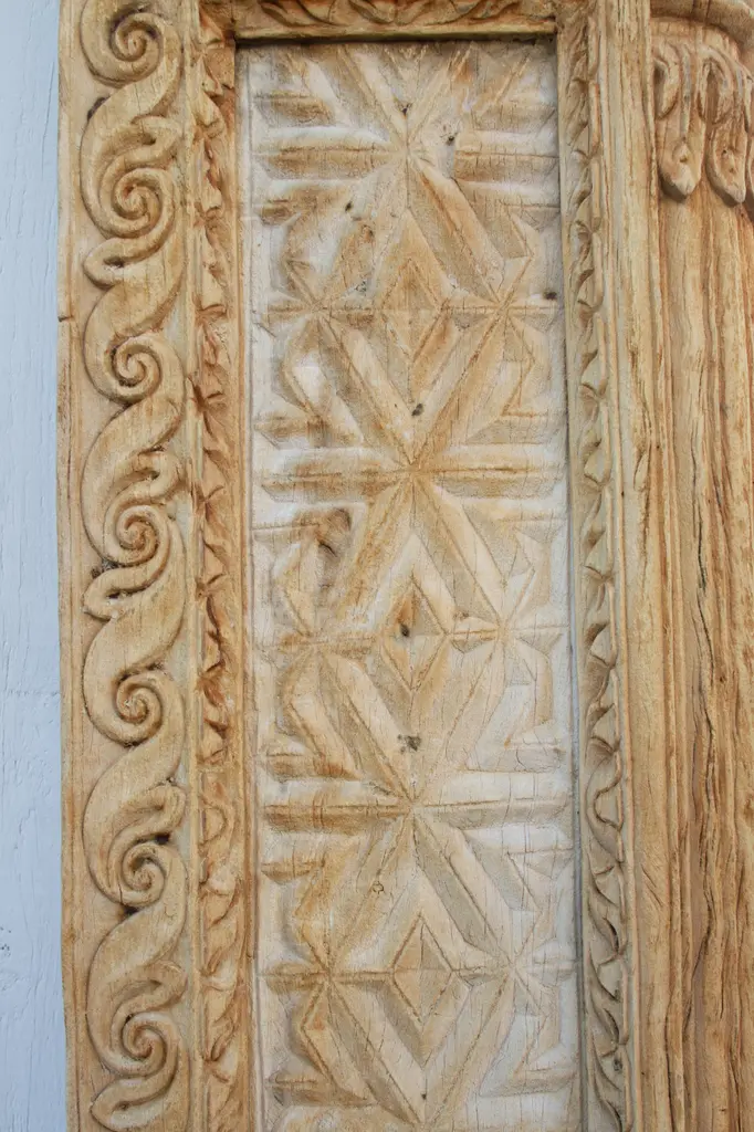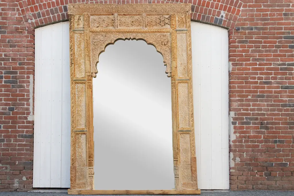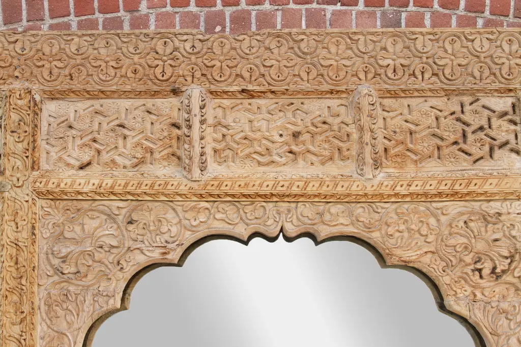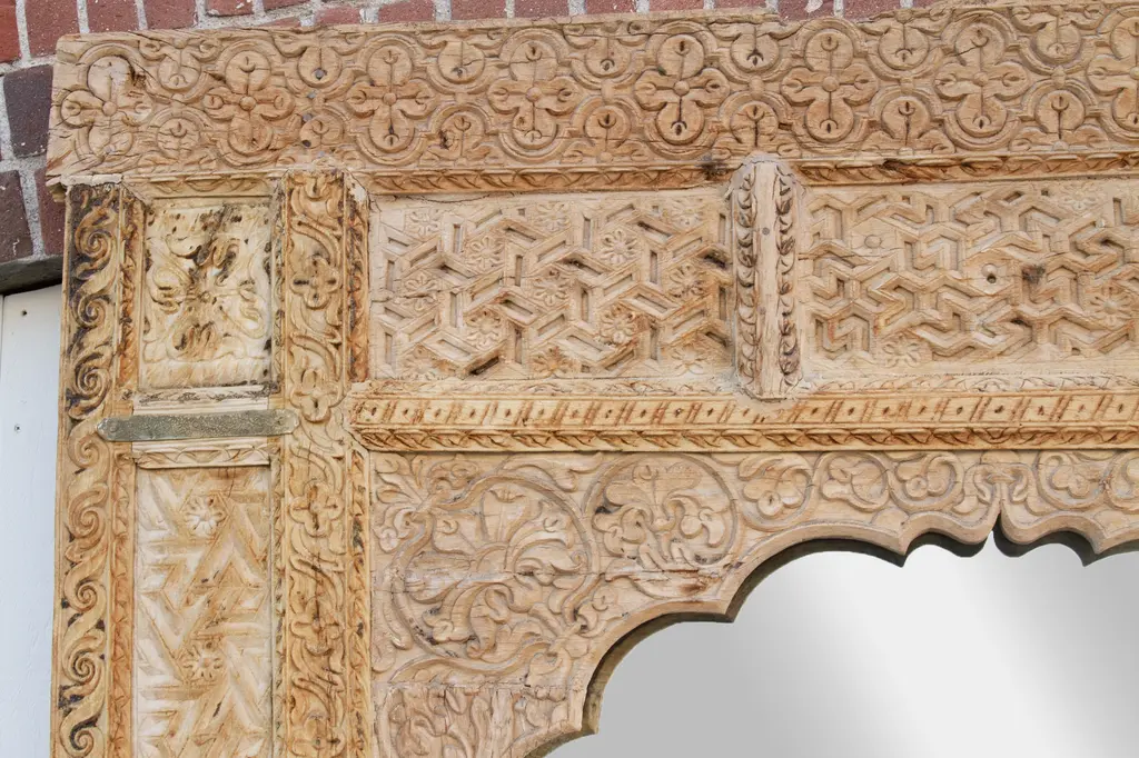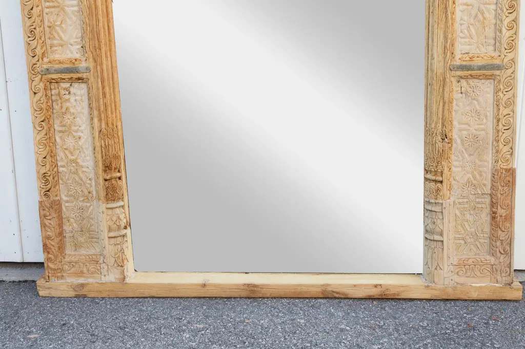 Made using an 18th century entrance door frame. This marvelous mirror features grandiose proportions. Its frame has column carvings on each side with a Mudejar arch design spanning across the top. The top of the frame features three panels with intricate geometric carved designs and has brass accents throughout. The mirror frame has a stripped bleached finish with oxidized patina.