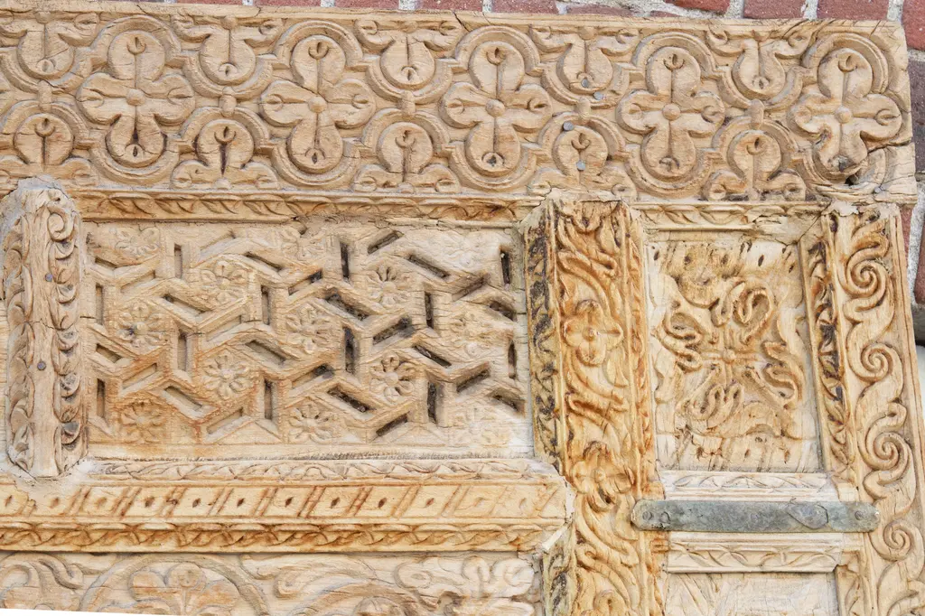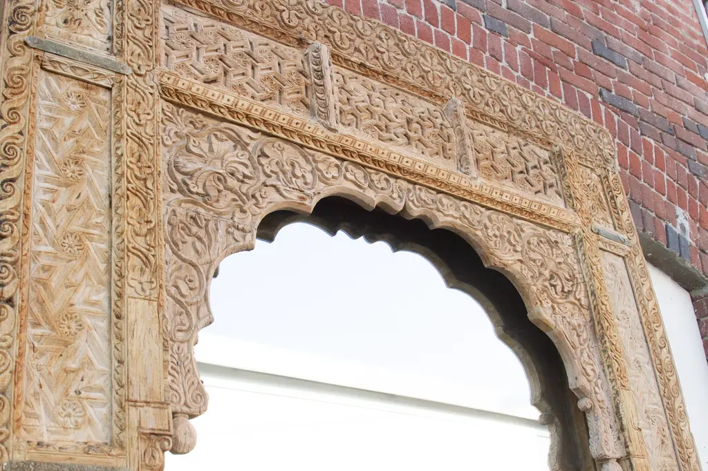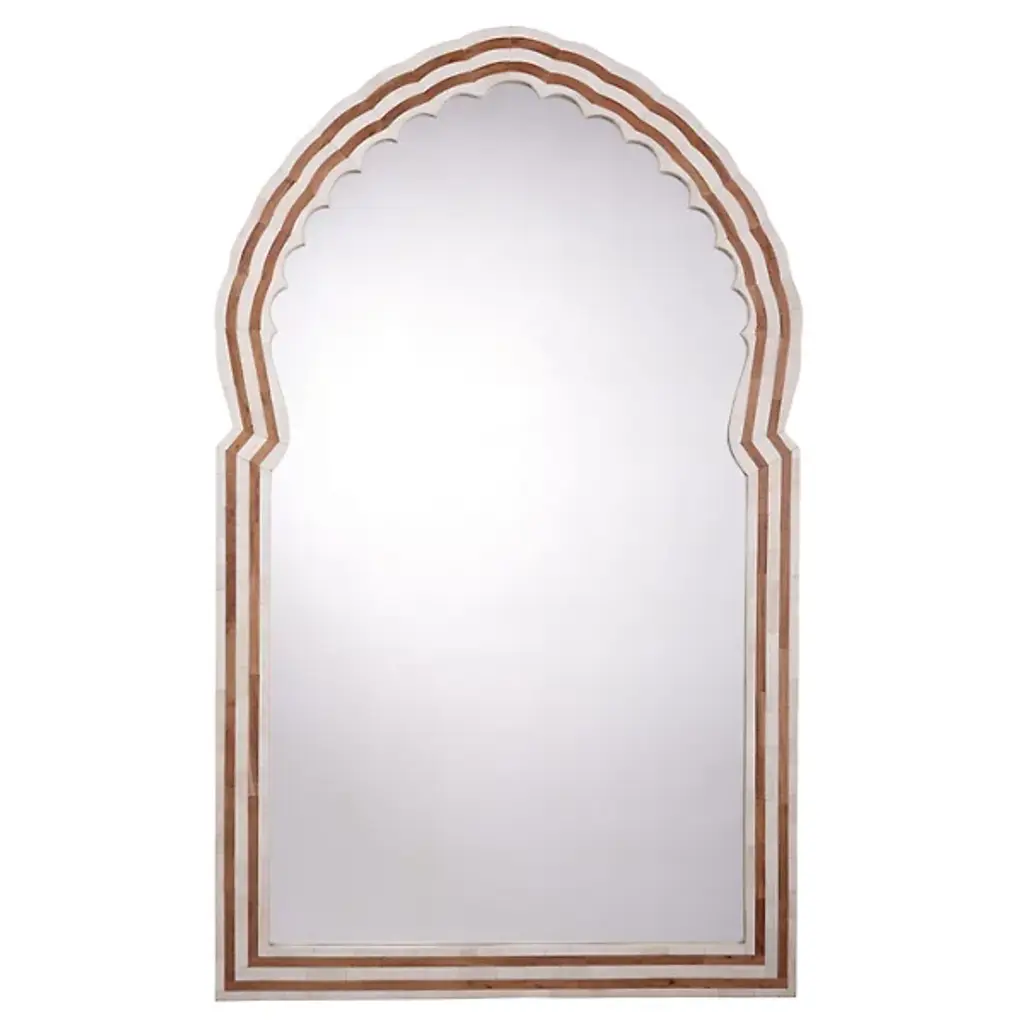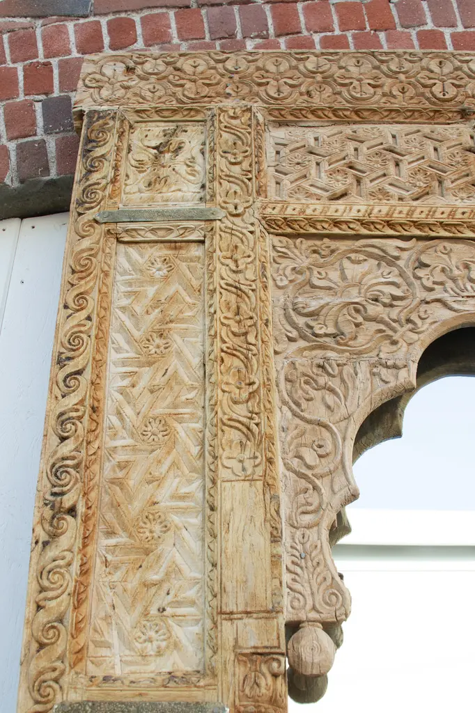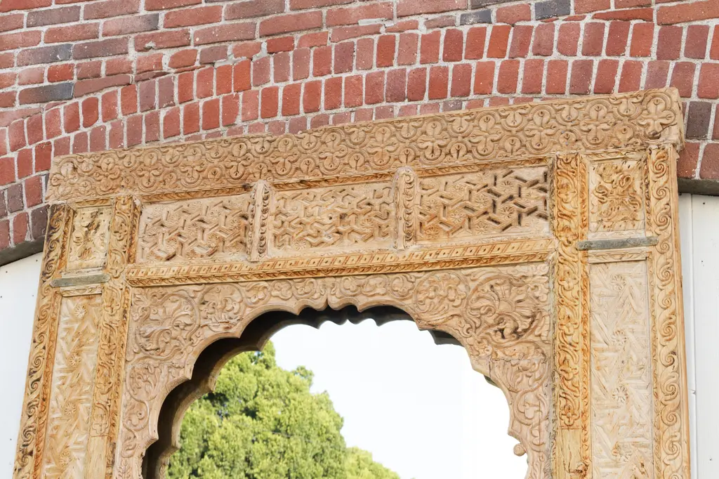 Made using an 18th century entrance door frame. This marvelous mirror features grandiose proportions. Its frame has column carvings on each side with a Mudejar arch design spanning across the top. The top of the frame features three panels with intricate geometric carved designs and has brass accents throughout. The mirror frame has a stripped bleached finish with oxidized patina.