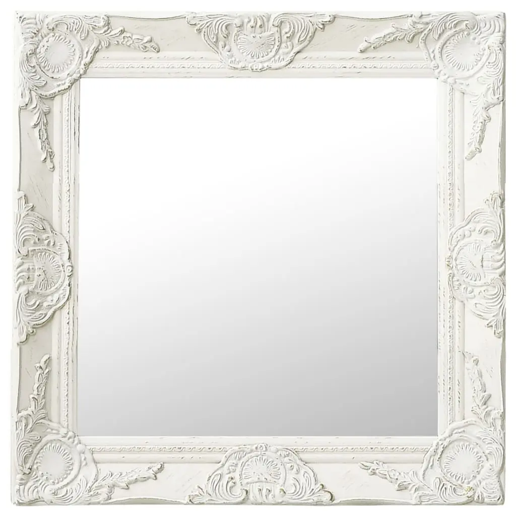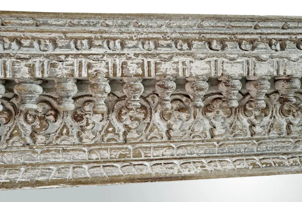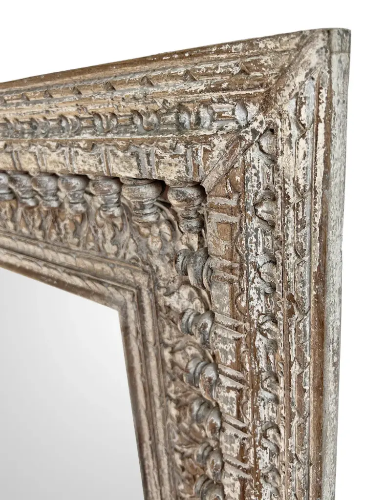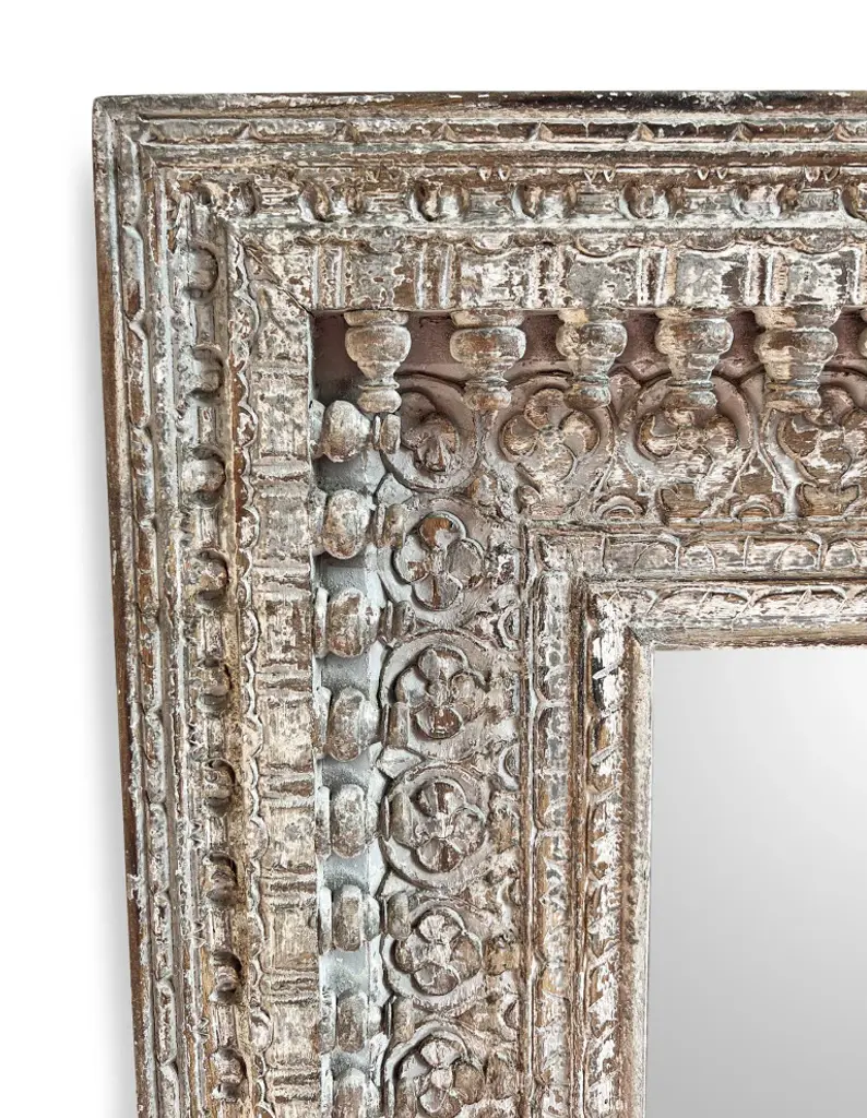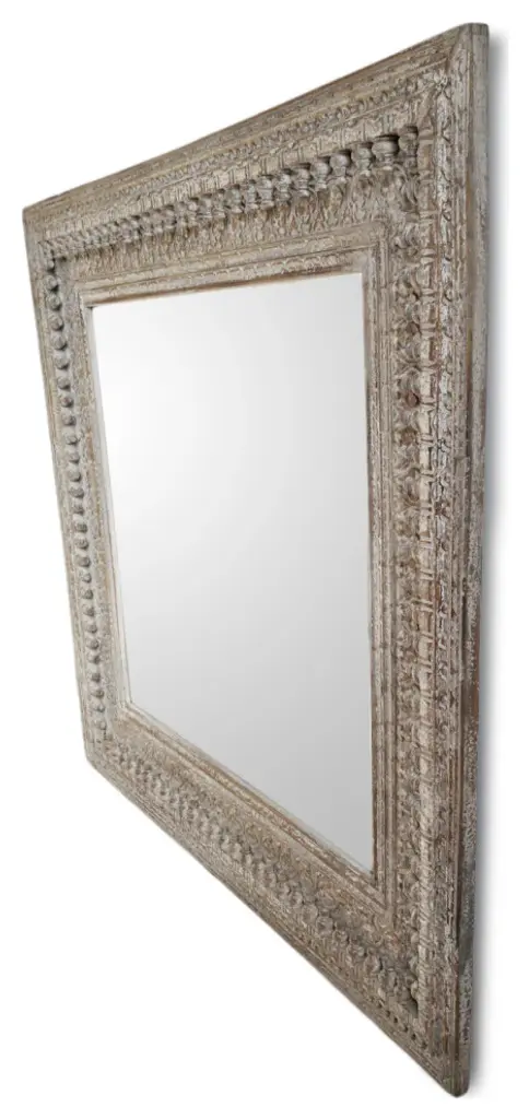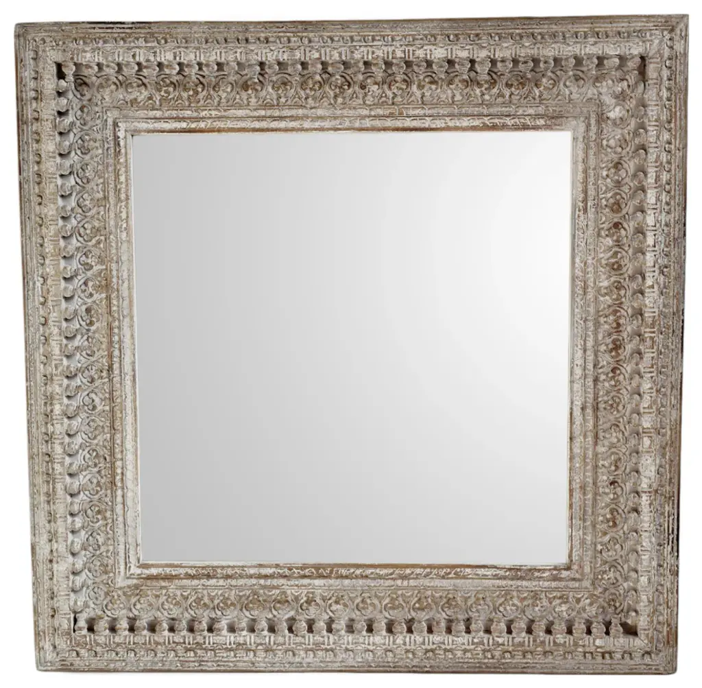 Square mirror with Gray wash moulding spindle detailed carved wood frame. Mirror area measures 34" x 34". Each is unique in exact finish and aged qualities.