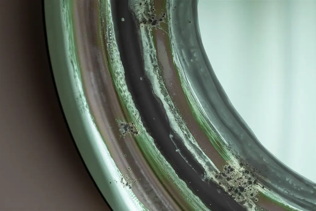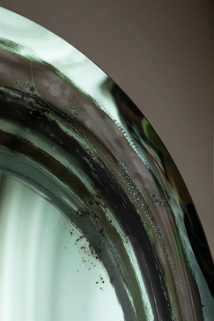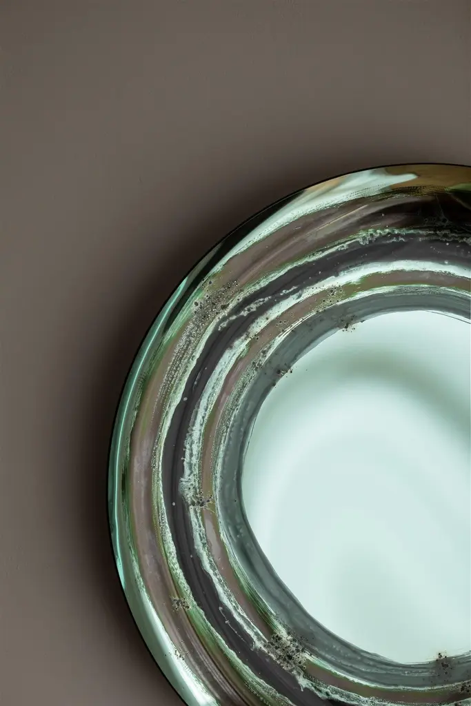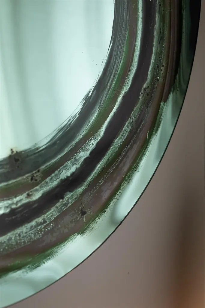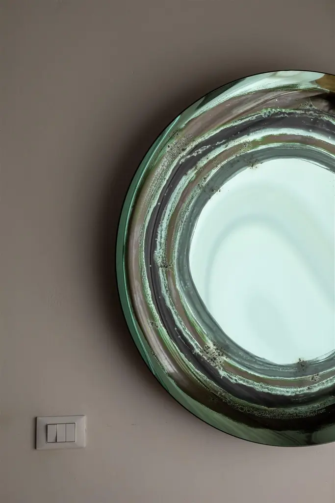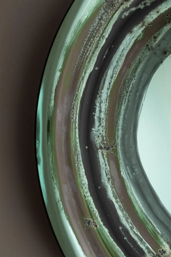 Green Aura Wall Mirror by OOM Contemporary GlassDimensions: Ø 94,5 cm.Materials: Copper luster and ceramic enamels on green glass, mixed techniques.Discover the Dome Collection, where glass artistry meets innovative design. This unique series features both plain and hand-painted curved mirrors, masterfully crafted using Murano Glass combined with ceramic enamels and metallic lusters. Drawing inspiration from the dynamic world of contemporary design, the Dome Collection redefines the boundaries of creativity and craftsmanship.CUSTOMEach piece demands a closer look to appreciate the rich glow of gold and lusters. The entirely handmade production process makes each piece a unique work on its own. The application of lusters and enamels is done by hand using various artisanal techniques rooted in the Venetian glass artistry heritage. The combination of these elements offers a mesmerizing display of artisanal excellence.At OOM, we believe in the transformative power of artisanal craftsmanship and the enduring beauty of design glass.Since 1987, we’ve been dedicated to crafting exquisite pieces that seamlessly blend contemporary design with traditional techniques, resulting in objects that elevate spaces to an unparalleled level of beautyand sophistication. At OOM, we believe in the transformative power of artisanal craftsmanship and the enduring beauty of design glass.Rooted in the rich heritage of Venice, our journey began in 1987, driven by a passion for creating extraordinary glassworks that capture the essence of contemporary design. Each OOM piece is a testament to our dedication to quality, heritage, and innovation.