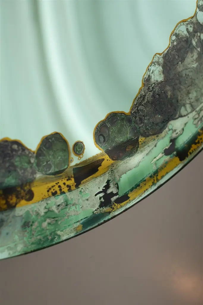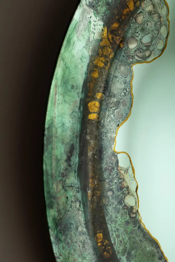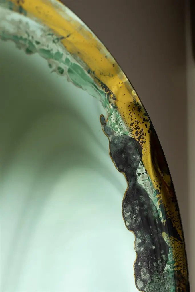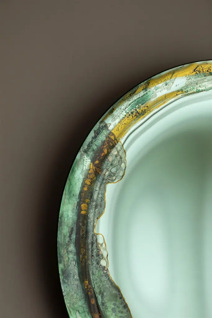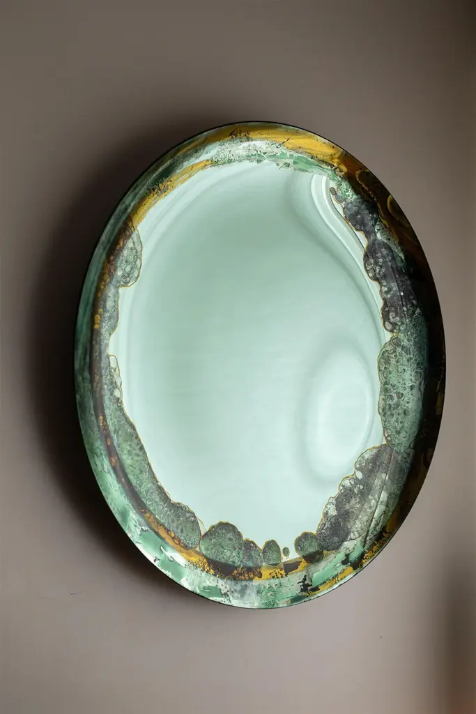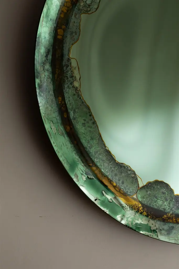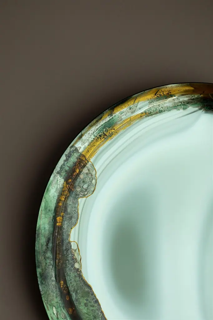 Green Halo Wall Mirror by OOM Contemporary GlassDimensions: Ø 94,5 cm.Materials: 24k gold luster and ceramic enamels on green glass, mixed techniques.Discover the Dome Collection, where glass artistry meets innovative design. This unique series features both plain and hand-painted curved mirrors, masterfully crafted using Murano Glass combined with ceramic enamels and metallic lusters. Drawing inspiration from the dynamic world of contemporary design, the Dome Collection redefines the boundaries of creativity and craftsmanship.CUSTOMEach piece demands a closer look to appreciate the rich glow of gold and lusters. The entirely handmade production process makes each piece a unique work on its own. The application of lusters and enamels is done by hand using various artisanal techniques rooted in the Venetian glass artistry heritage. The combination of these elements offers a mesmerizing display of artisanal excellence.At OOM, we believe in the transformative power of artisanal craftsmanship and the enduring beauty of design glass.Since 1987, we’ve been dedicated to crafting exquisite pieces that seamlessly blend contemporary design with traditional techniques, resulting in objects that elevate spaces to an unparalleled level of beautyand sophistication. At OOM, we believe in the transformative power of artisanal craftsmanship and the enduring beauty of design glass.Rooted in the rich heritage of Venice, our journey began in 1987, driven by a passion for creating extraordinary glassworks that capture the essence of contemporary design. Each OOM piece is a testament to our dedication to quality, heritage, and innovation.