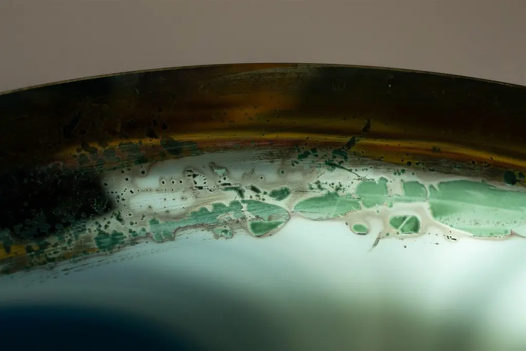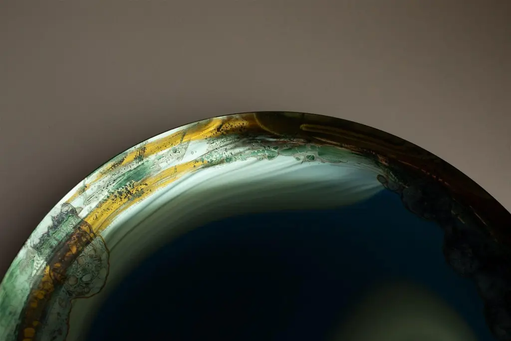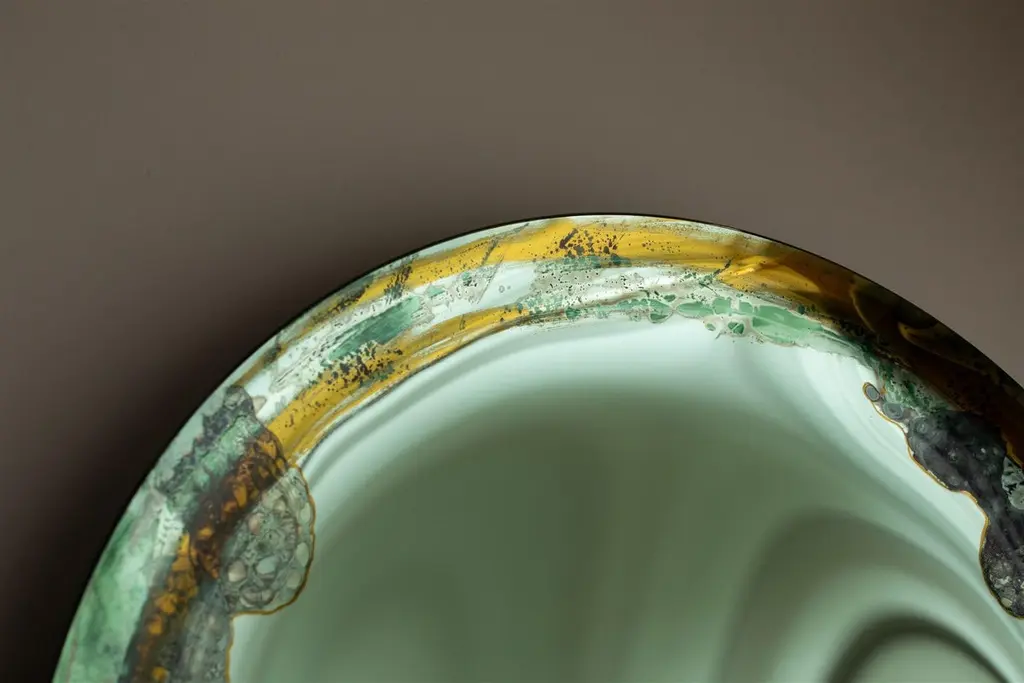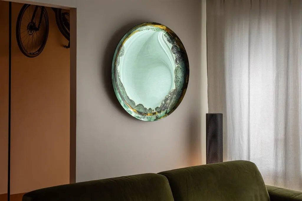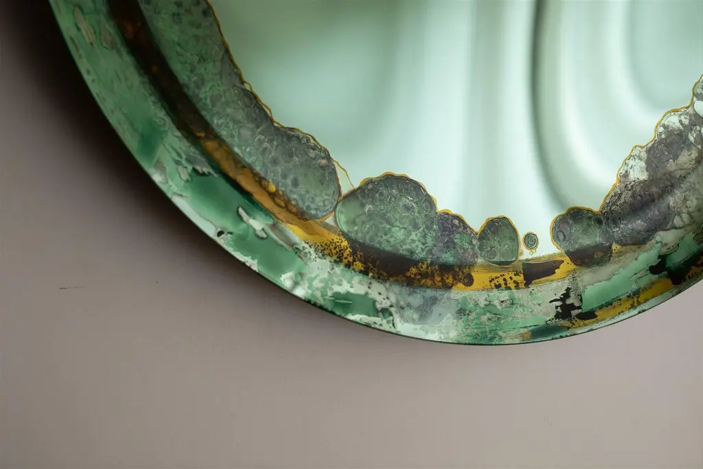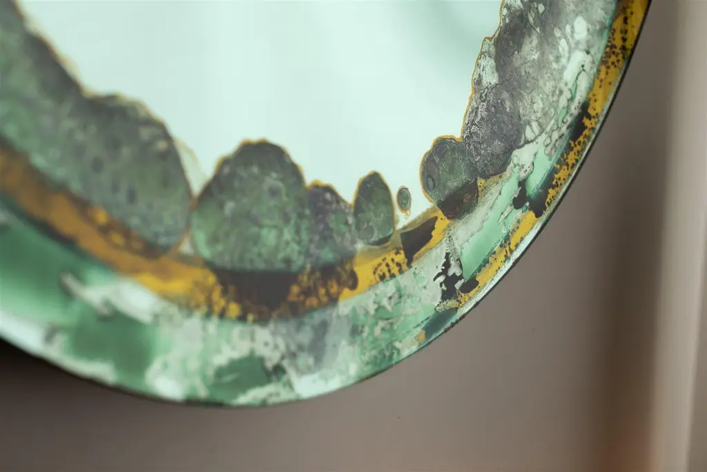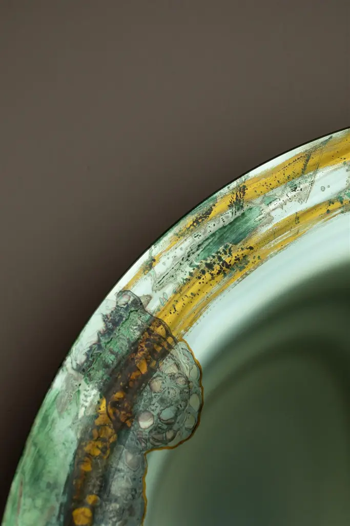 Green Halo Wall Mirror by OOM Contemporary GlassDimensions: Ø 94,5 cm.Materials: 24k gold luster and ceramic enamels on green glass, mixed techniques.Discover the Dome Collection, where glass artistry meets innovative design. This unique series features both plain and hand-painted curved mirrors, masterfully crafted using Murano Glass combined with ceramic enamels and metallic lusters. Drawing inspiration from the dynamic world of contemporary design, the Dome Collection redefines the boundaries of creativity and craftsmanship.CUSTOMEach piece demands a closer look to appreciate the rich glow of gold and lusters. The entirely handmade production process makes each piece a unique work on its own. The application of lusters and enamels is done by hand using various artisanal techniques rooted in the Venetian glass artistry heritage. The combination of these elements offers a mesmerizing display of artisanal excellence.At OOM, we believe in the transformative power of artisanal craftsmanship and the enduring beauty of design glass.Since 1987, we’ve been dedicated to crafting exquisite pieces that seamlessly blend contemporary design with traditional techniques, resulting in objects that elevate spaces to an unparalleled level of beautyand sophistication. At OOM, we believe in the transformative power of artisanal craftsmanship and the enduring beauty of design glass.Rooted in the rich heritage of Venice, our journey began in 1987, driven by a passion for creating extraordinary glassworks that capture the essence of contemporary design. Each OOM piece is a testament to our dedication to quality, heritage, and innovation.